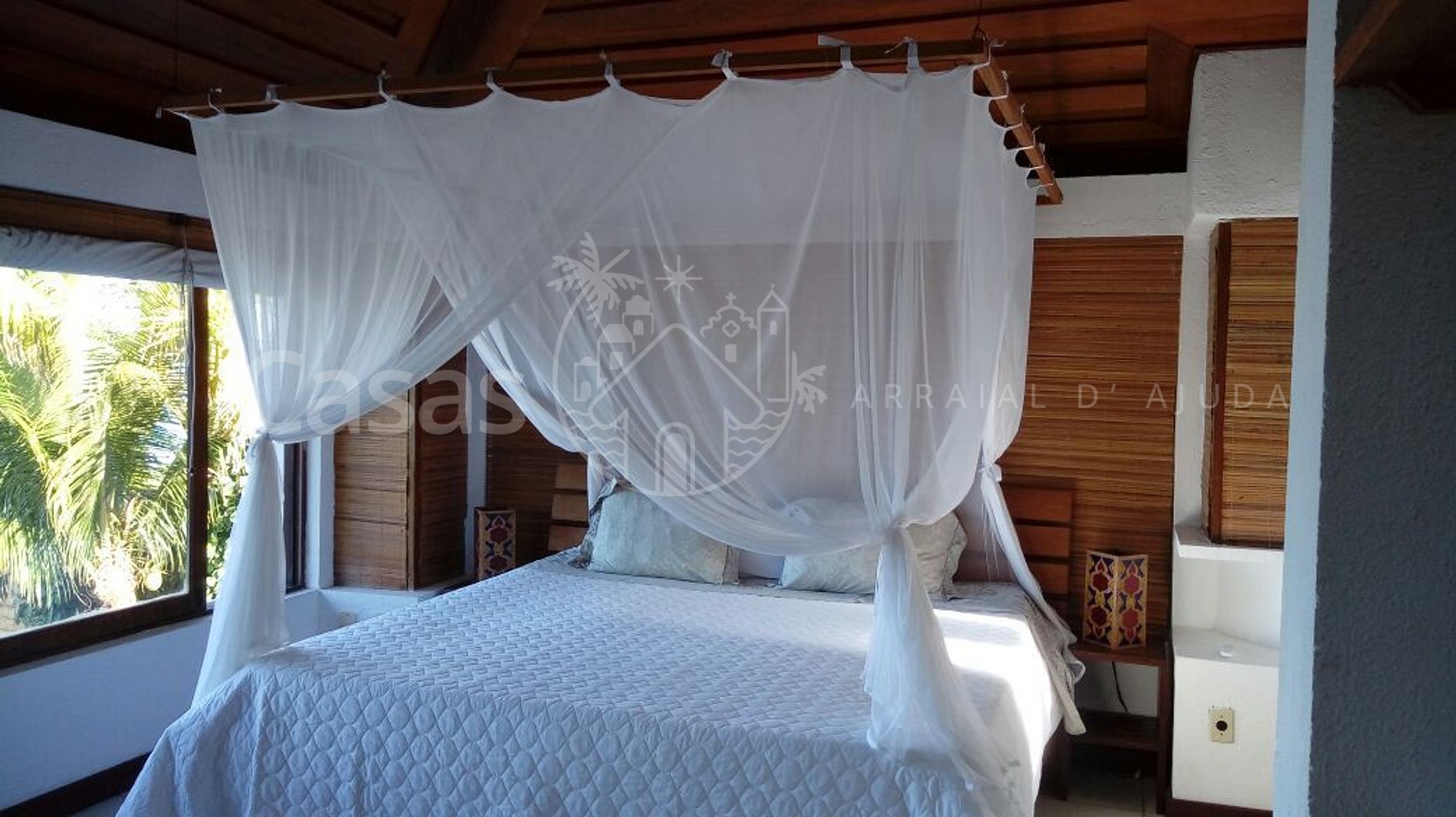 São dois pisos, sendo a suíte master, ampla e com cama king size e maravilhosa vista. No piso intermediário, uma suíte também king size e um quarto (semi suíte), com vista mar, que acomoda casal e um solteiro, todos os quartos são climatizados.