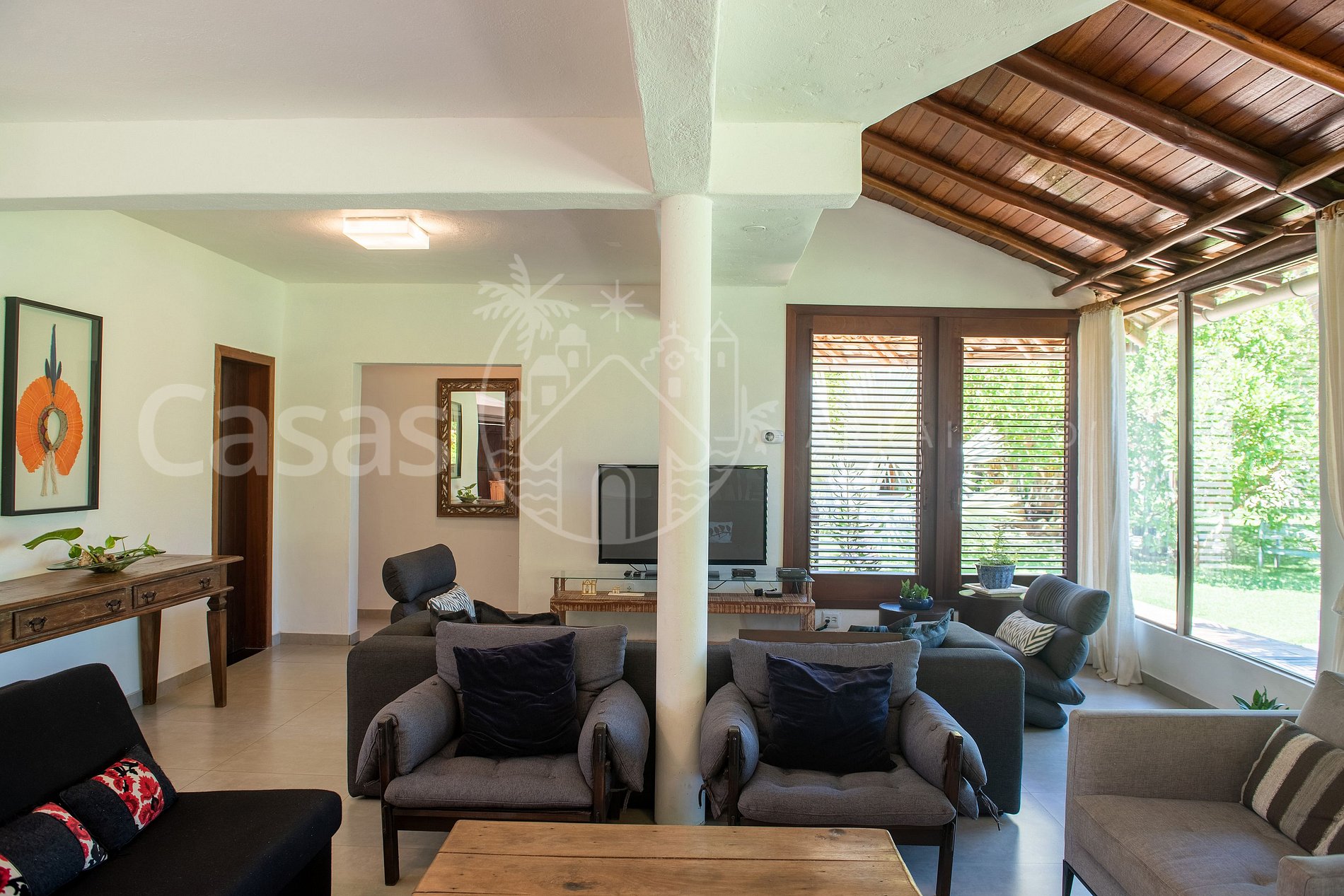 Sala ampla com vários ambientes, varanda com redes para você desfrutar momentos maravilhosos. A propriedade tem uma construção onde ficam duas das lindas suítes, o espaço, lindamente decorado e bem equipado, tem sala e cozinha completa, duas suítes aconchegantes com vsita para o jardim e piscina.
