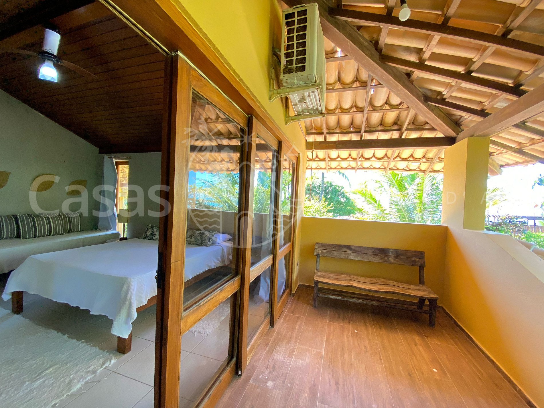 Suíte 1: Piso Superior - Cama queen, cama solteiro, ar-condicionado, banheira, varanda vista mar