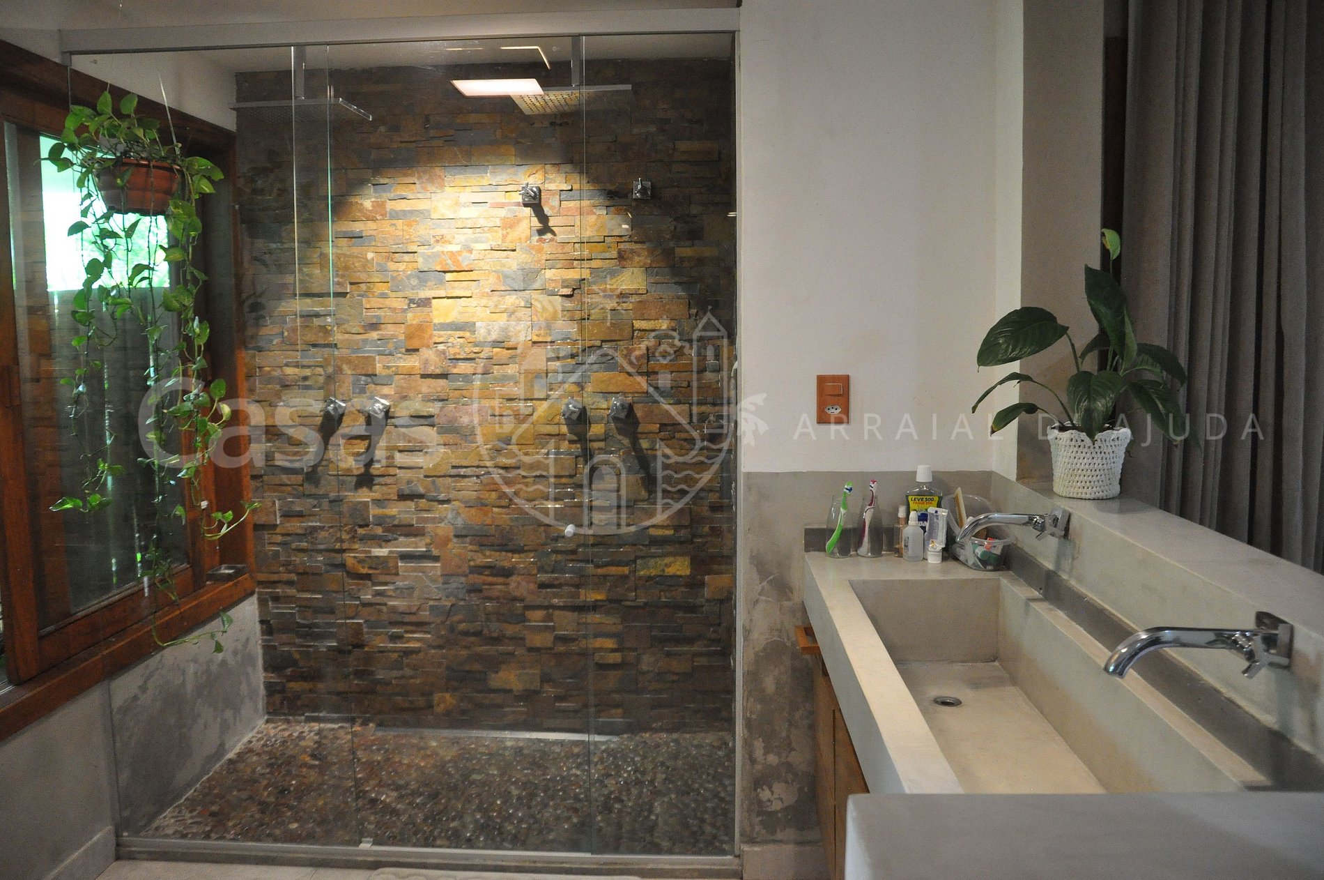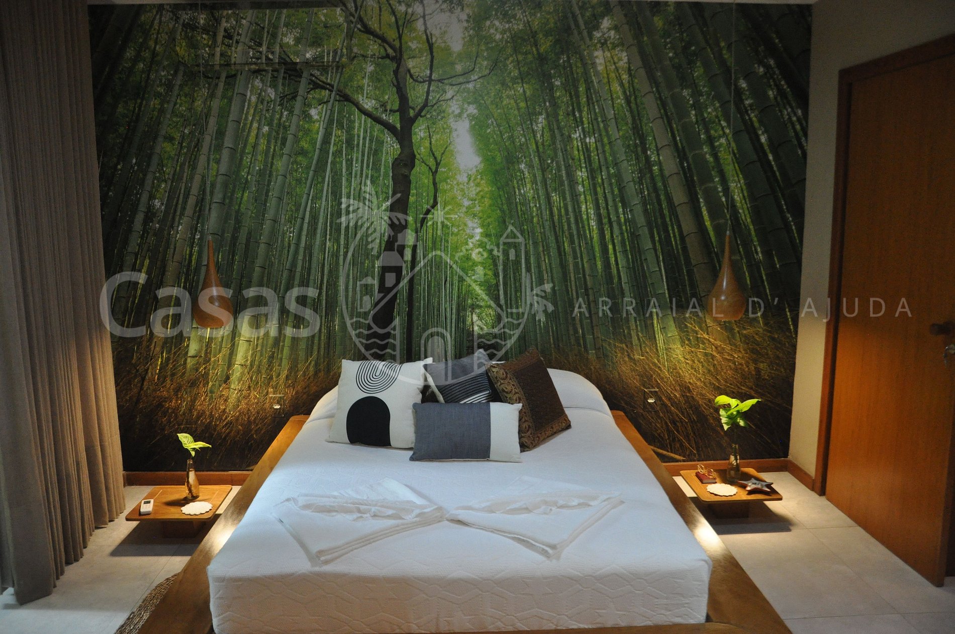 A casa de 200 m2 possui três quartos, sendo duas suítes e mais um banheiro social. Todos os quartos possuem deck avarandado com linda paisagem verde. A suíte principal ainda conta com uma jacuzzi no jardim externo.