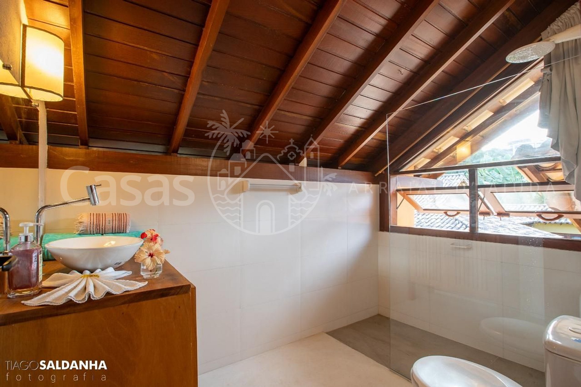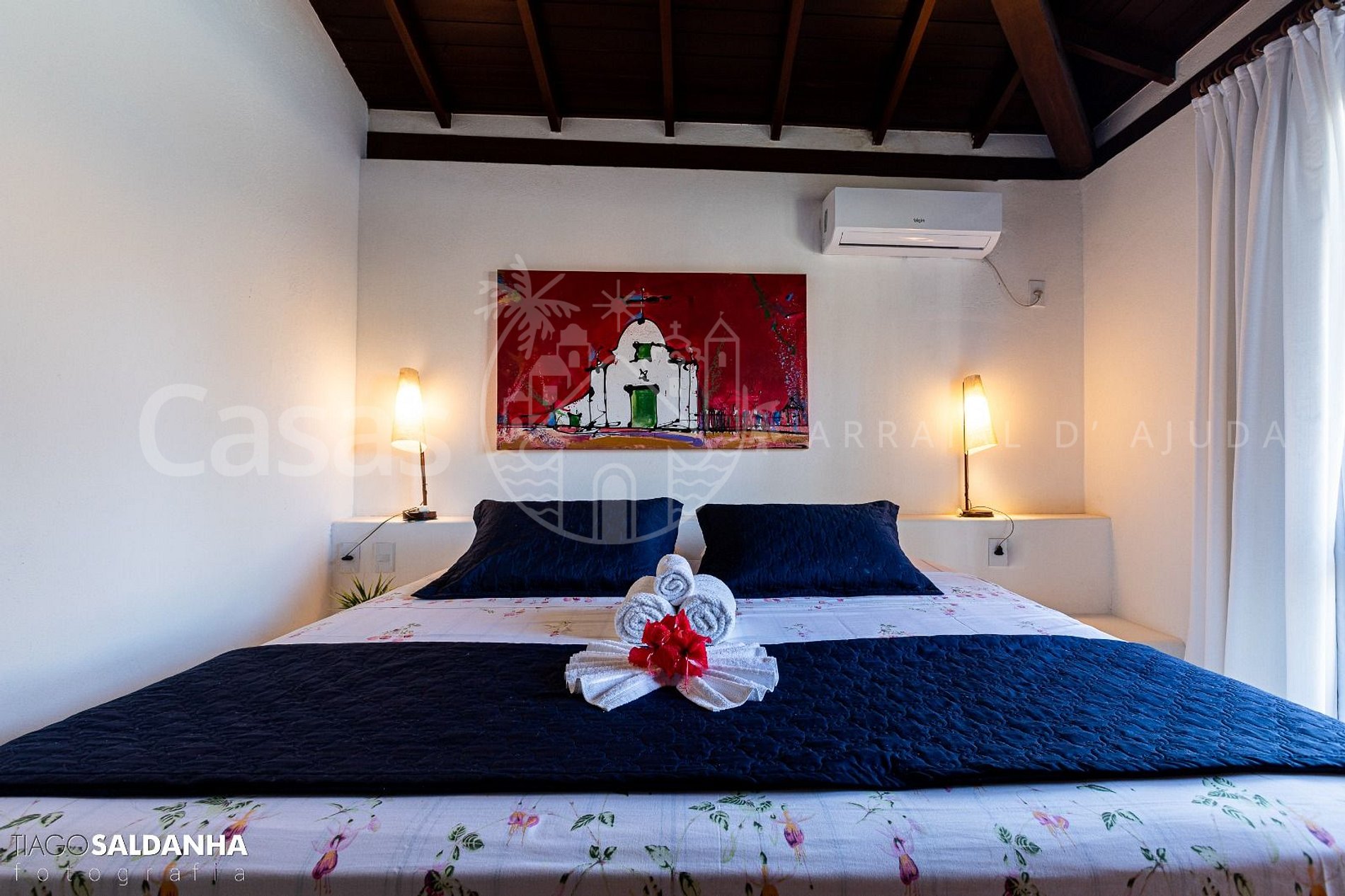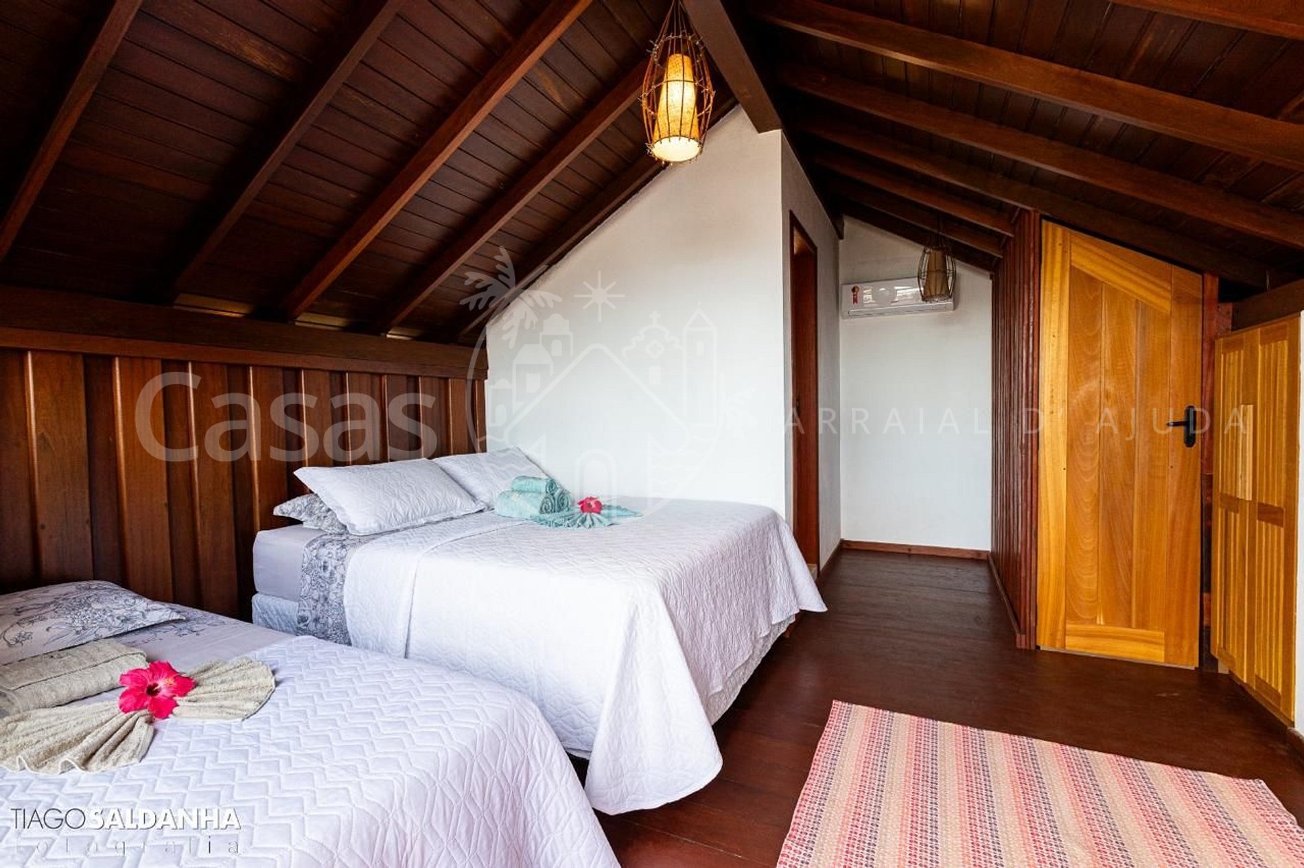 Suíte 3 – Piso superior: 1 cama casal, 1 cama solteiro, ar-condicionado, cortina, tv, varanda