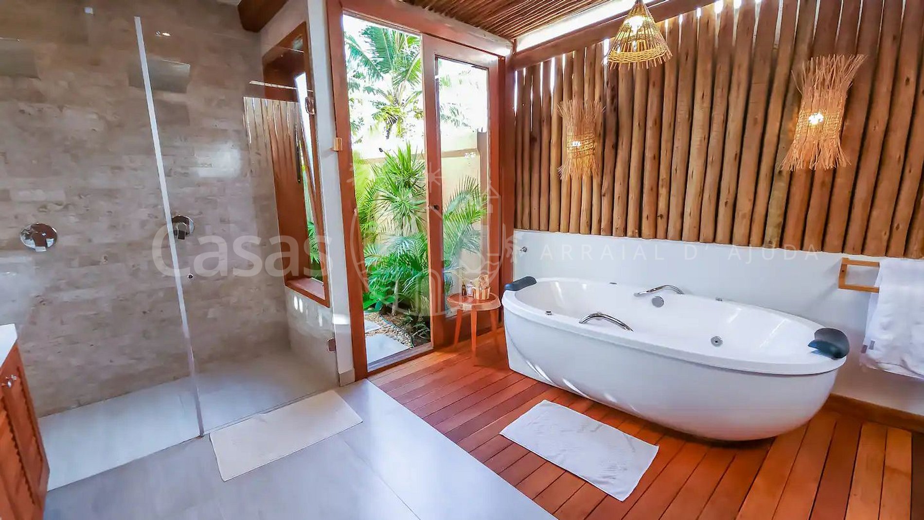 Suíte master: térrea com acesso e vista para a piscina e jardim, jardim privativo, ar condicionado e ventilador de teto, cama king com mosquiteiro clássico, mesa de trabalho, poltrona, cortina, portas de correr, closet grande com portas artesanais de palha, banheiro com lavabo e duchas duplas, banheira de hidromassagem, decoração tropical, banheiro com vistas para o jardim privativo.