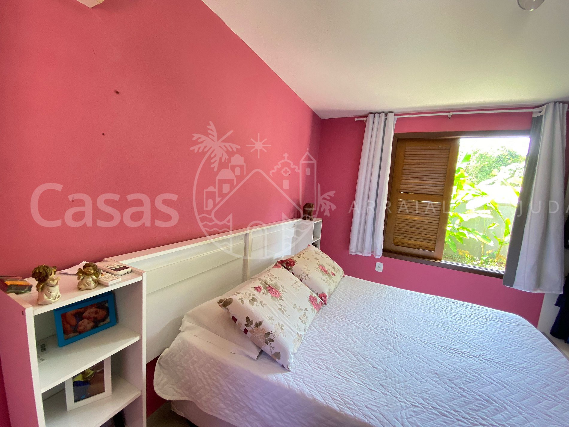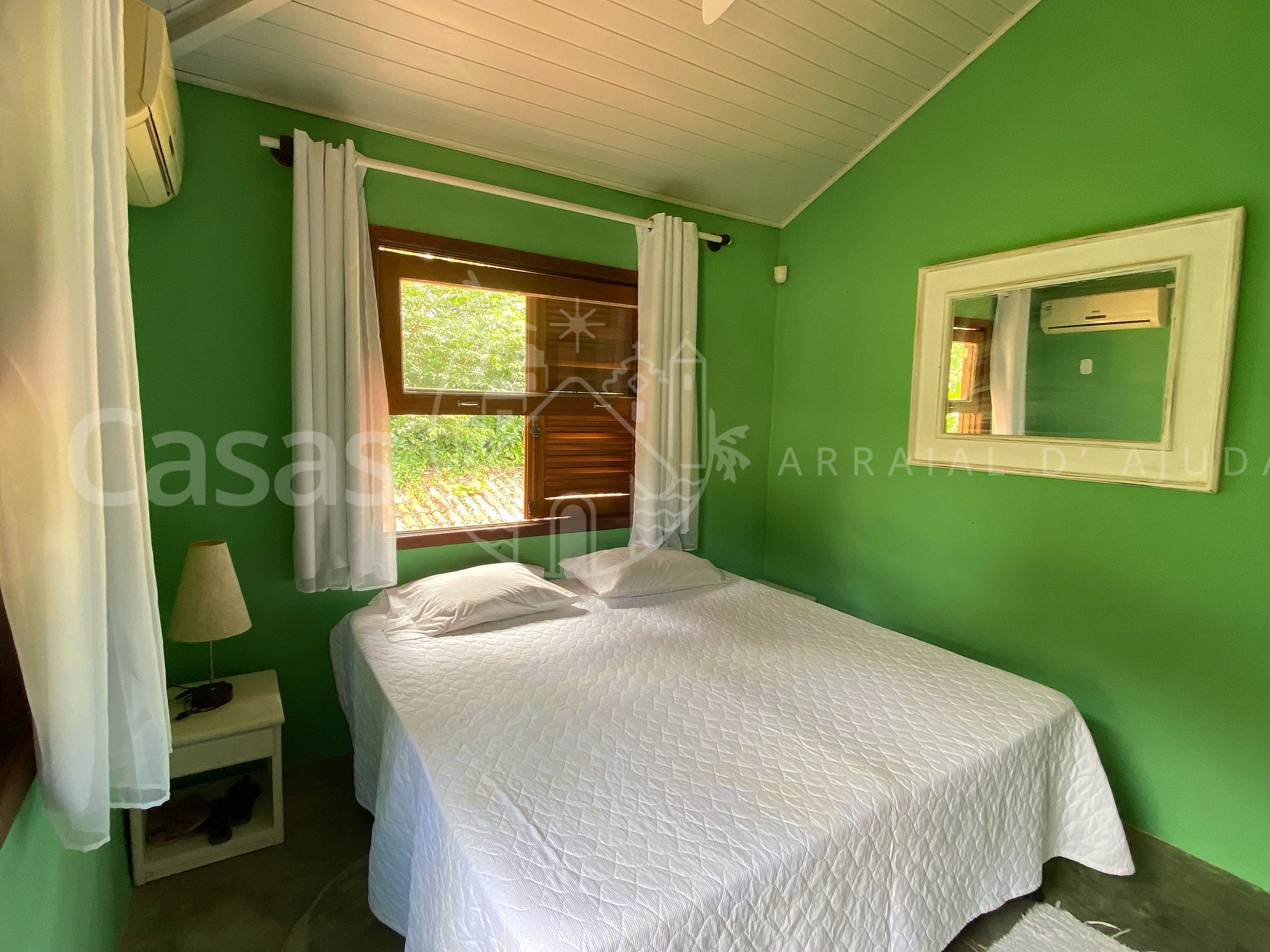 Quarto 4 - Piso inferior: Cama casal, armário, janela com cortina, ar-condicionado e ventilador