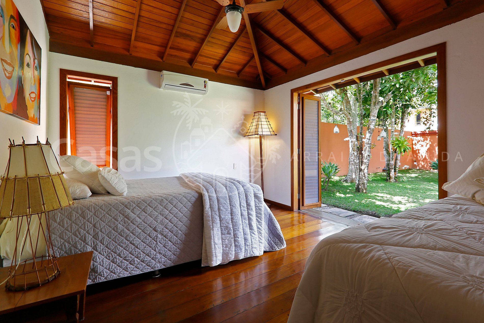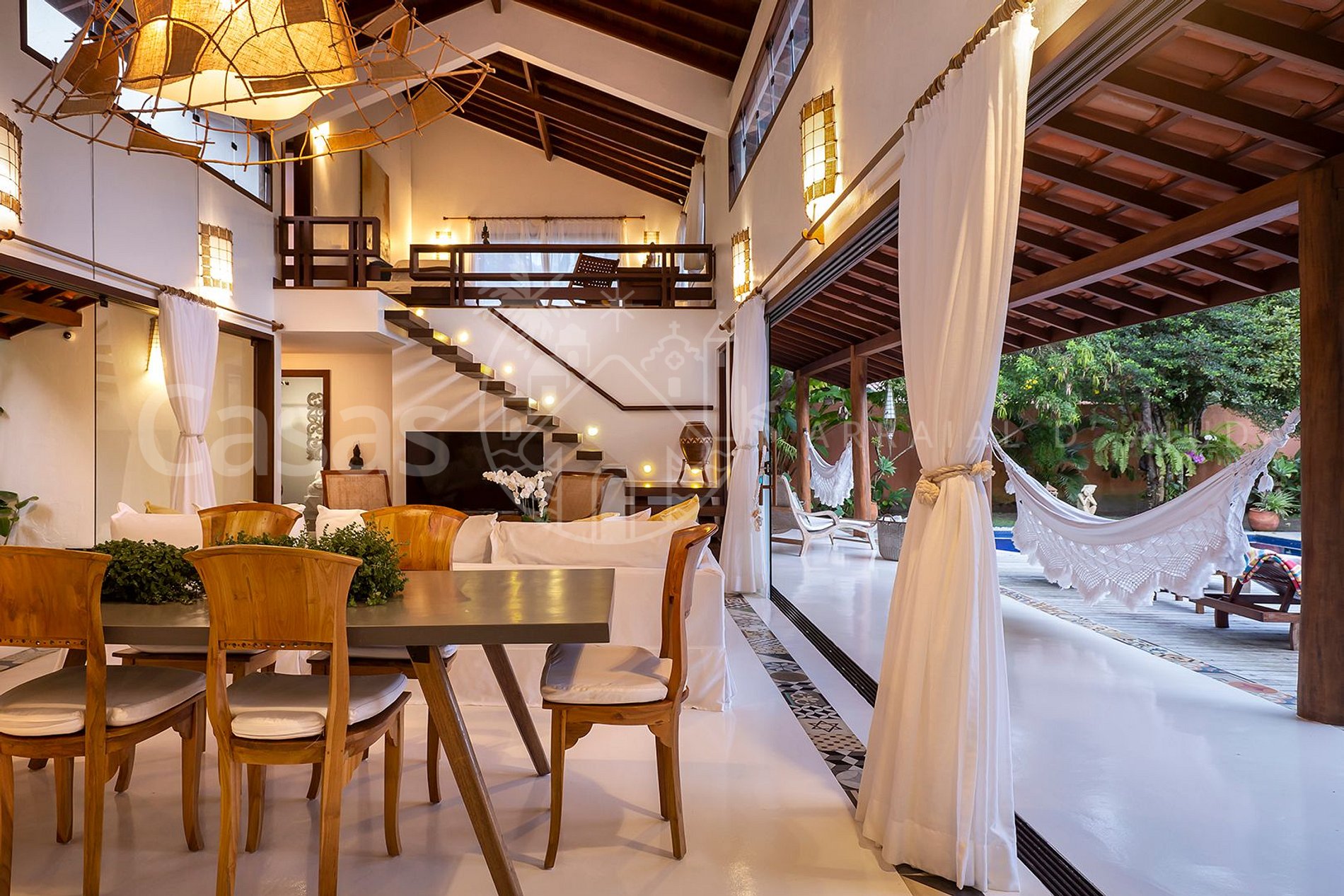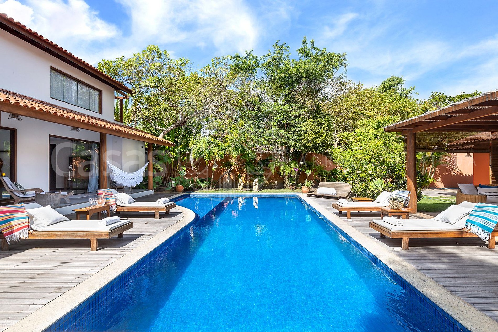 A Casa Céu é uma propriedade lindamente construída e preparada para receber seus hóspedes com conforto e total privacidade, ao adentrar a propriedade, vemos lindo e aconchegante espaço de lazer, em meio ao jardim tropical, com piscina, cascata e espreguiçadeiras, rodeado de redes, longes e mobiliário externo, tem ainda espaço com cozinha gourmet e churrasqueira.