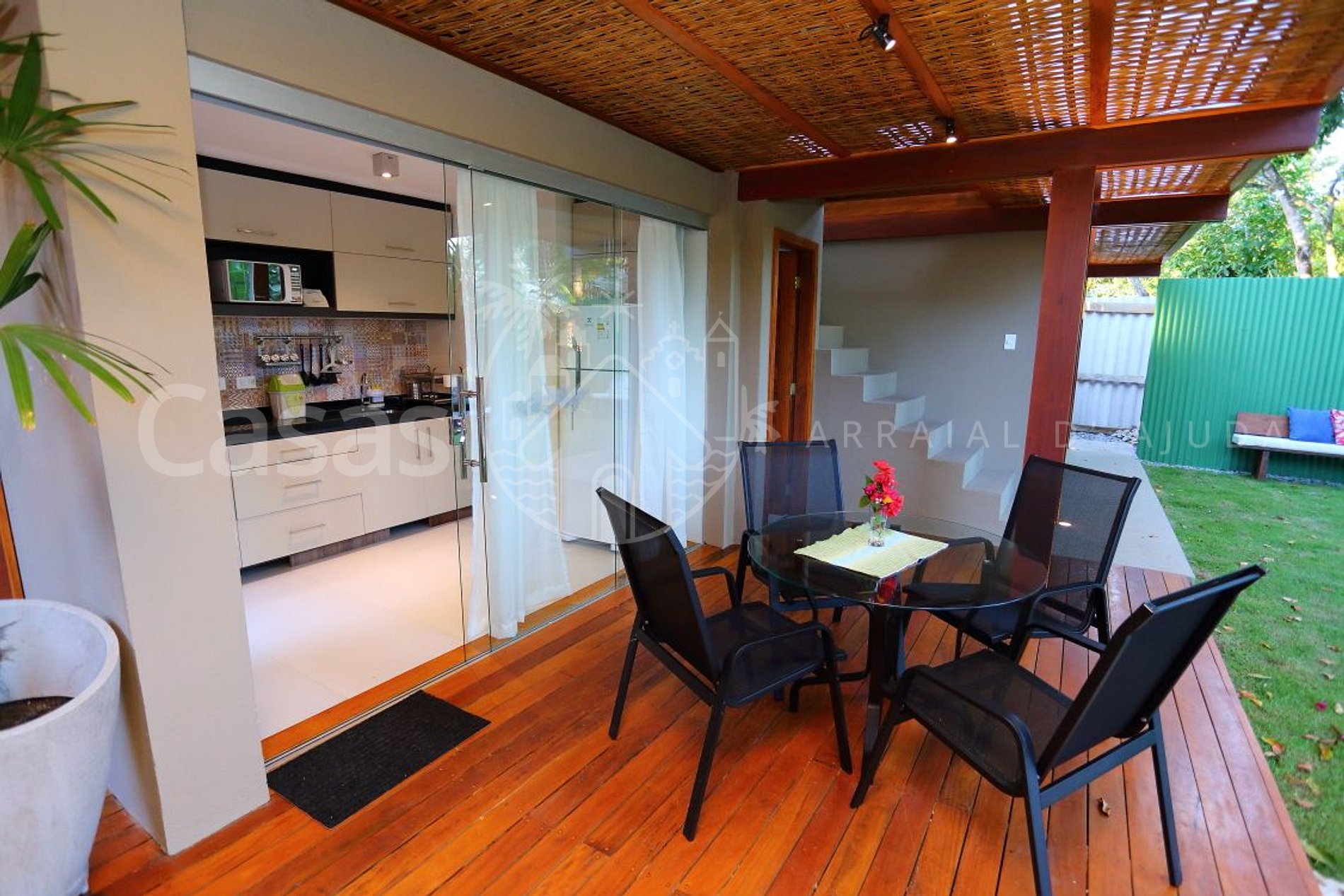 No andar superior possui 01 suíte climatizada e cofre. No andar térreo possui uma charmosa cozinha equipada, com varanda e mesa para refeições. Jardim privativo com lounge