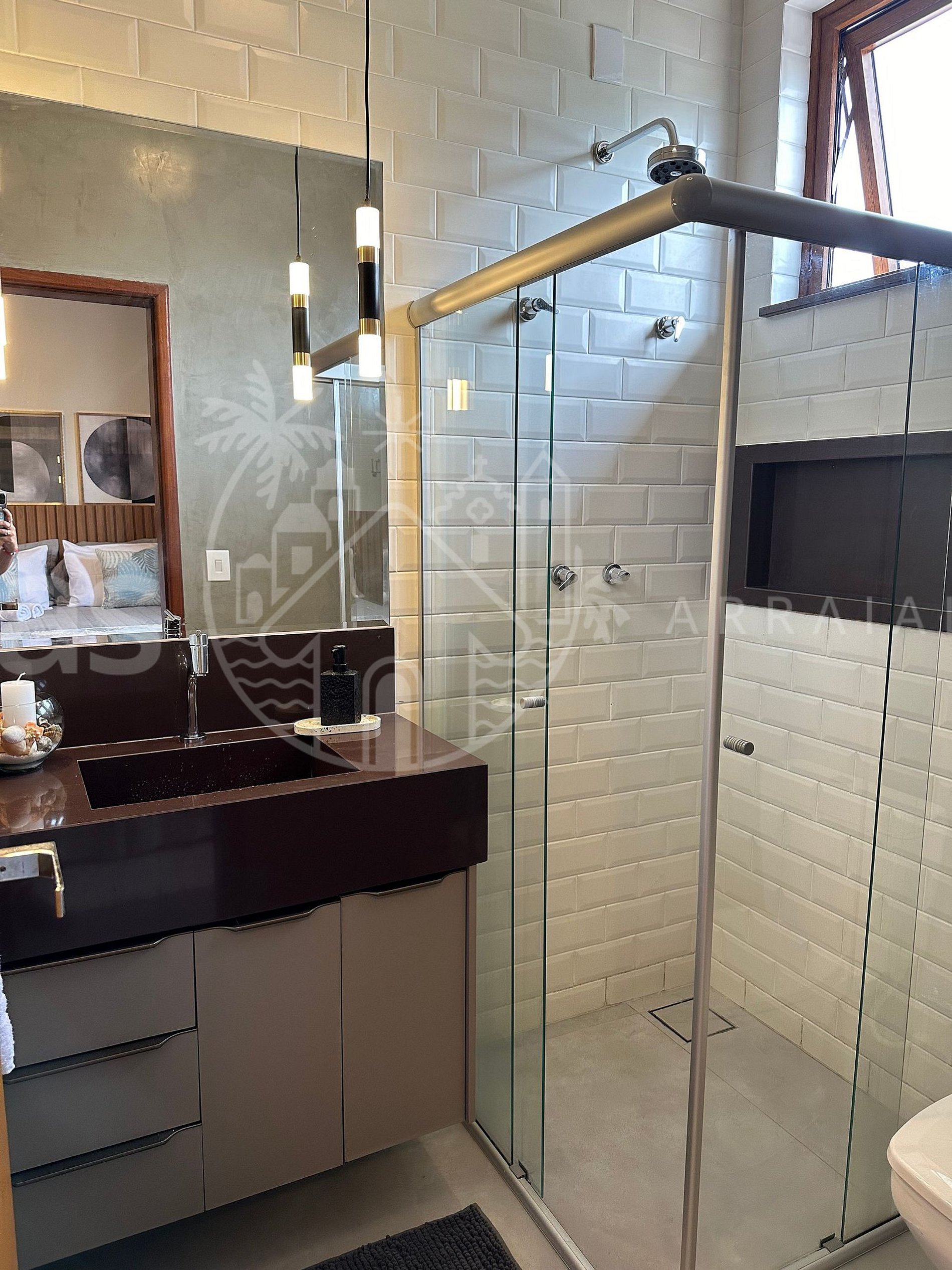 Suíte 1 – Piso superior: cama queen size, armário em vidro, banheiro com armário, ar condicionado, cortina, TV 42 polegadas
