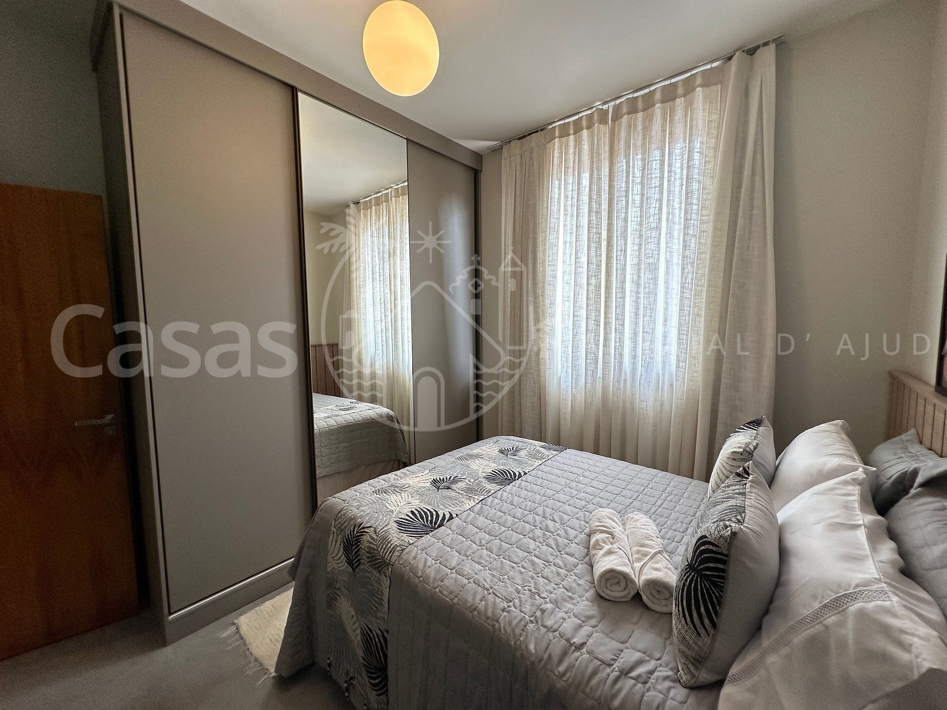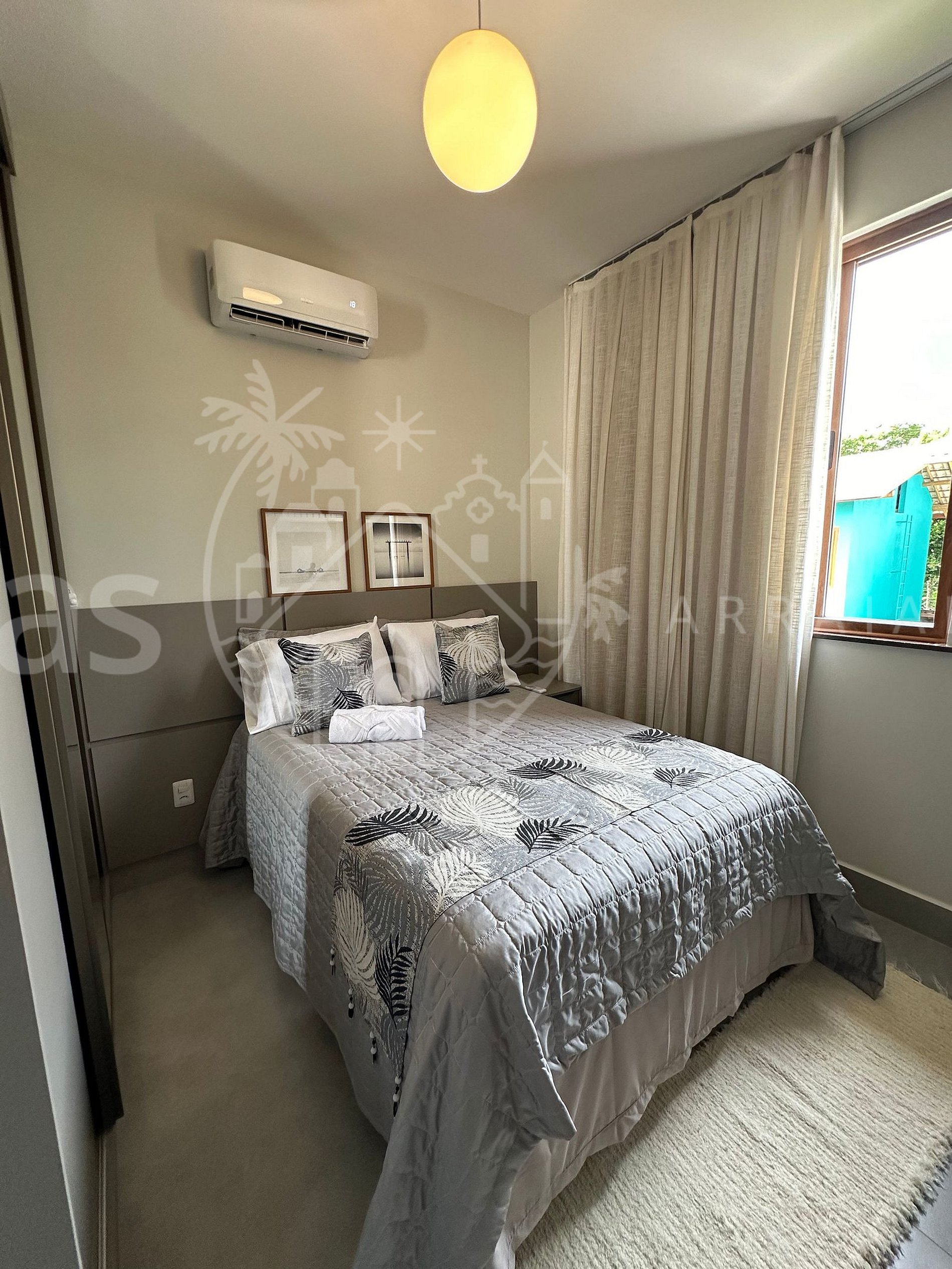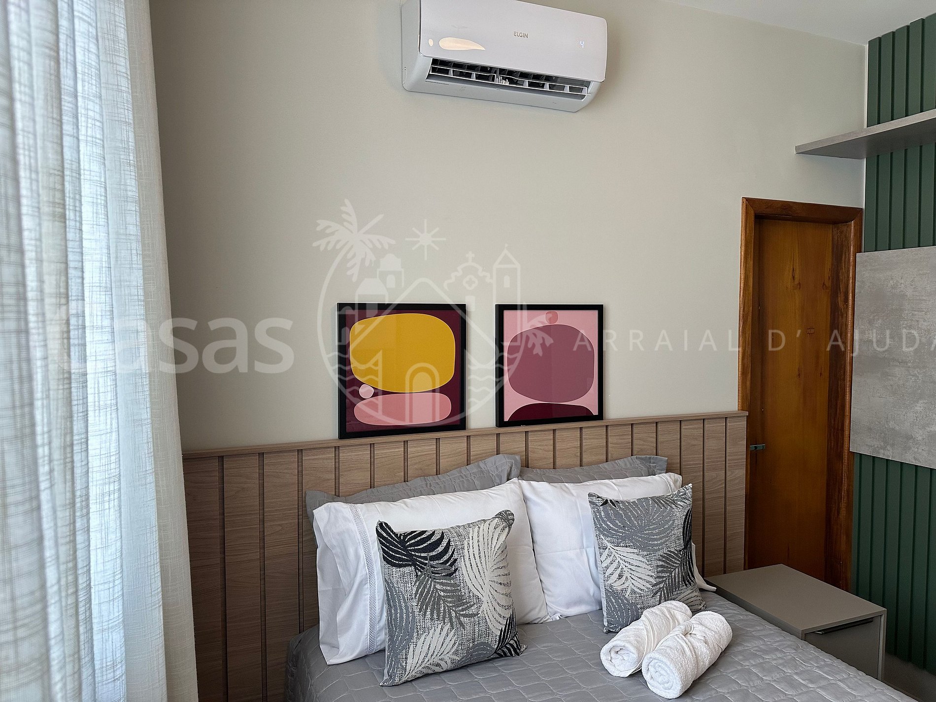 Suíte 2 – Piso superior: cama casal padrão, armário em MDF, banheiro com armário, ar condicionado, cortina