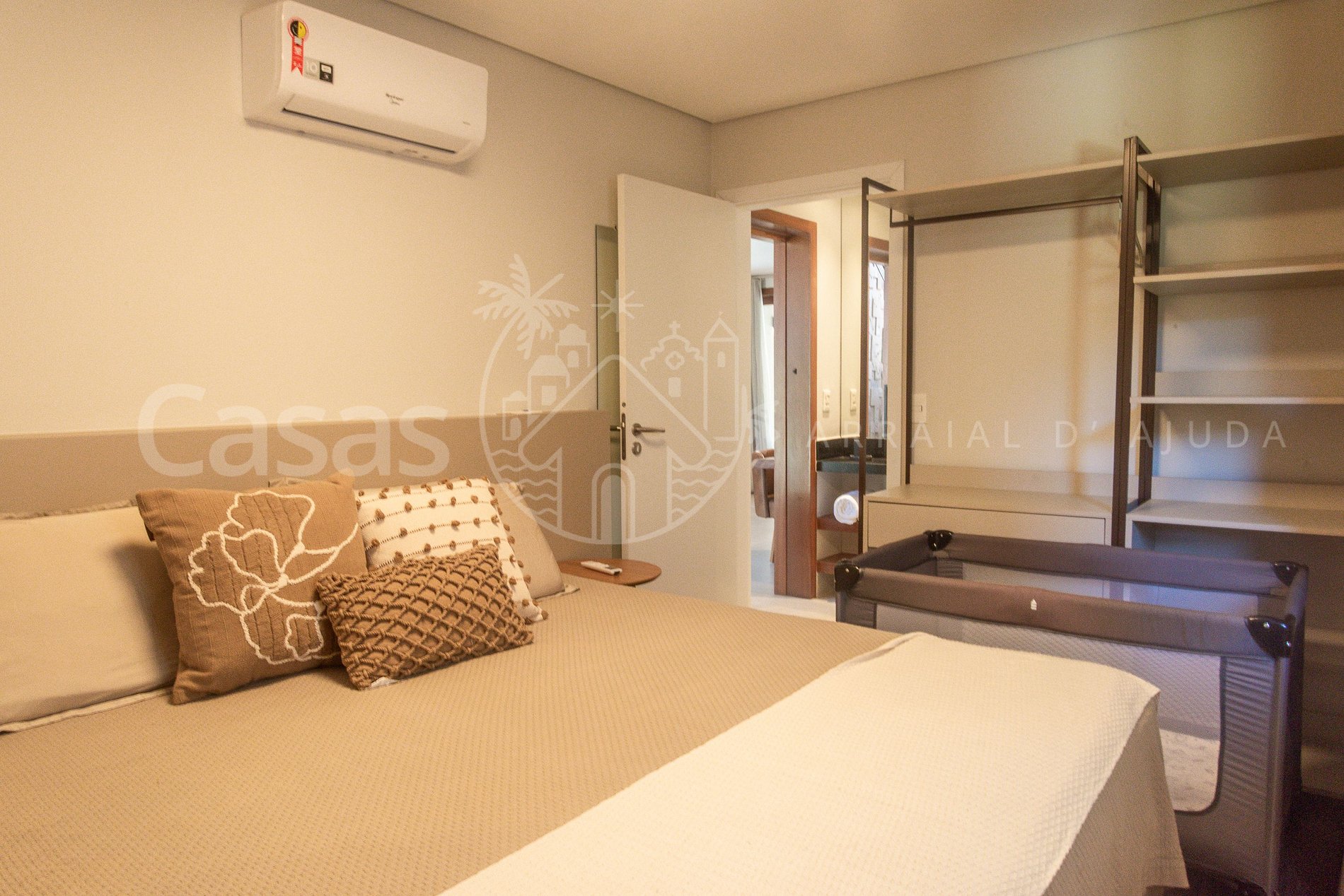 Suíte 1 – Piso Superior: cama King, mesas laterais, móvel com gavetas e prateleiras, ar-condicionado, varanda com poltrona