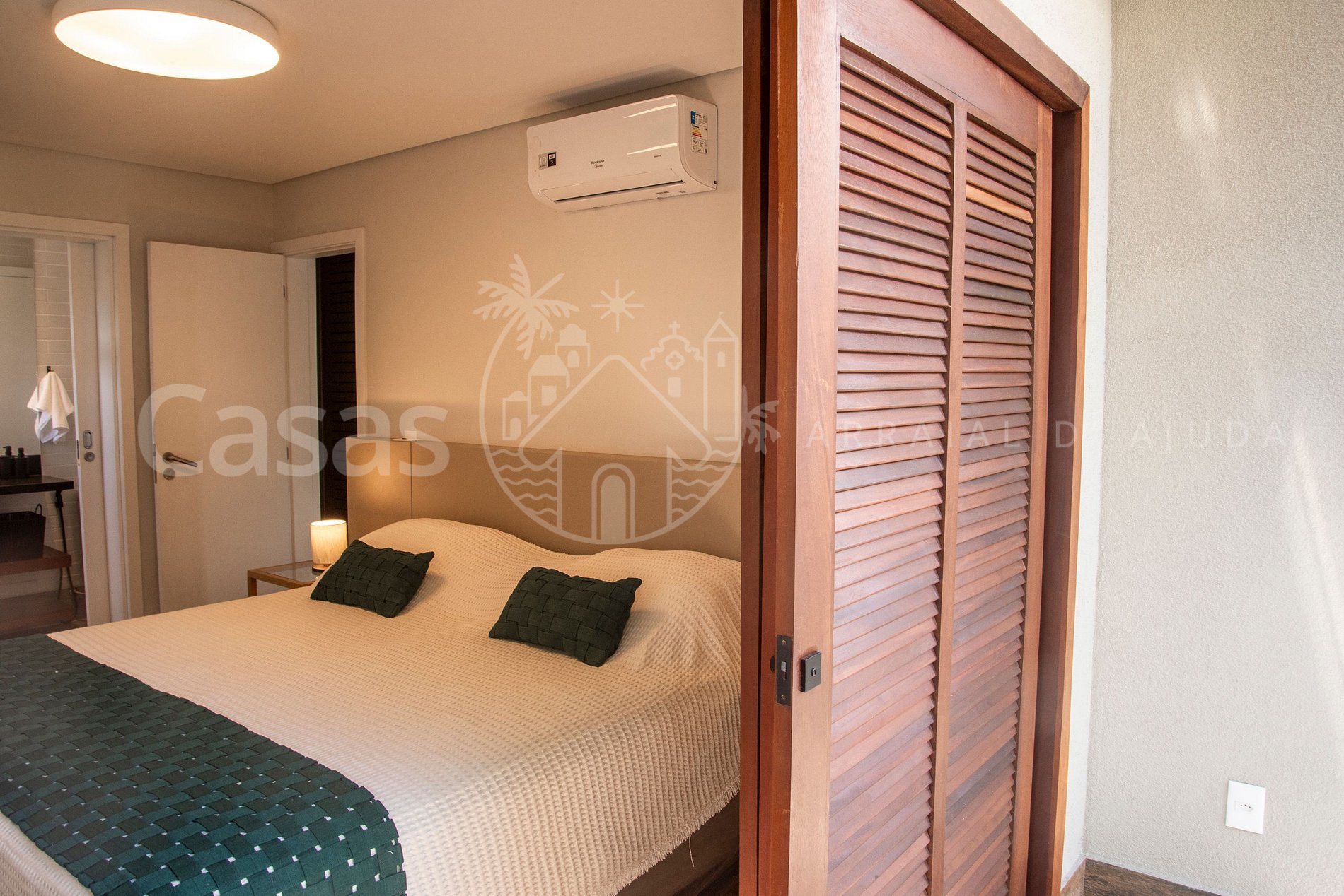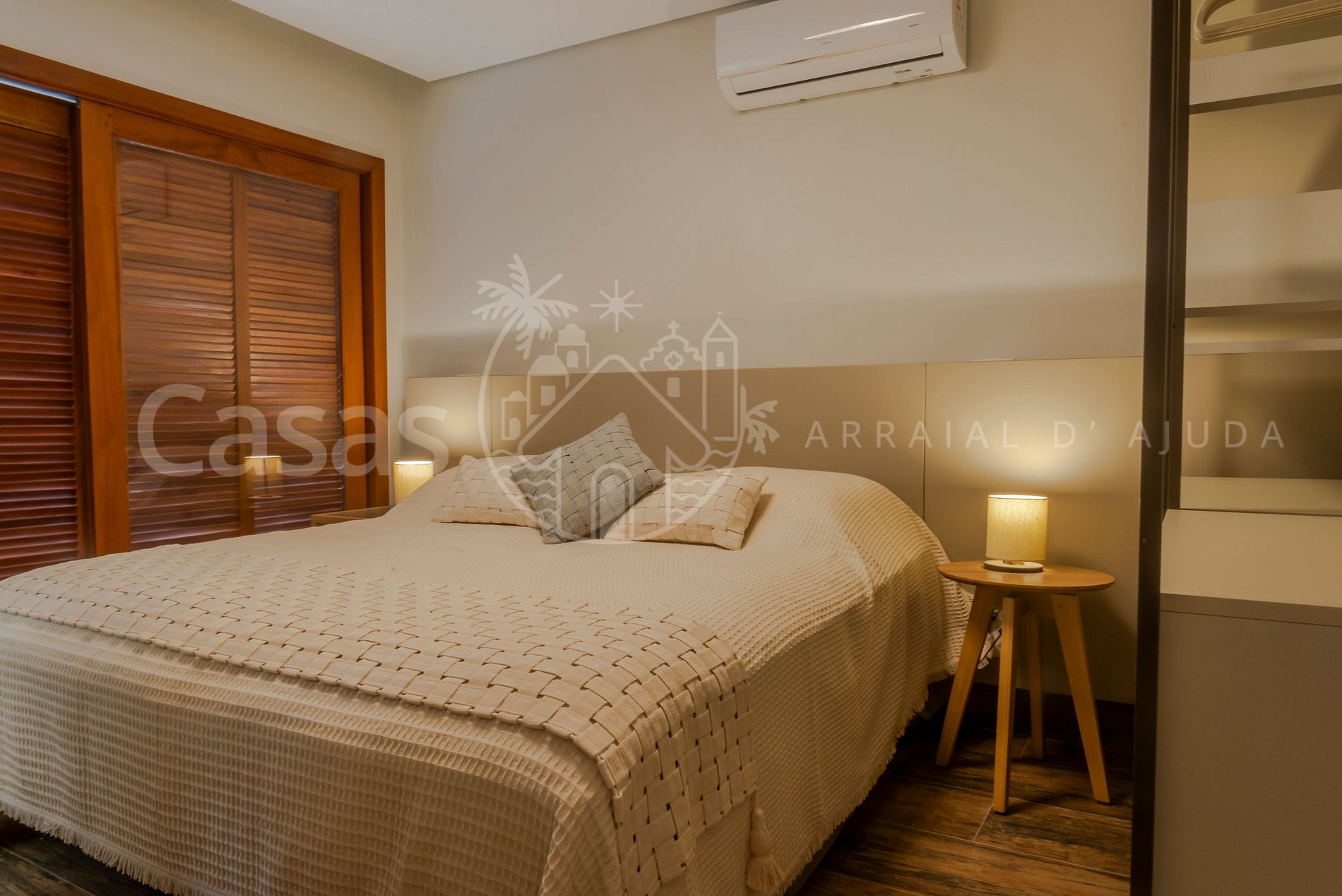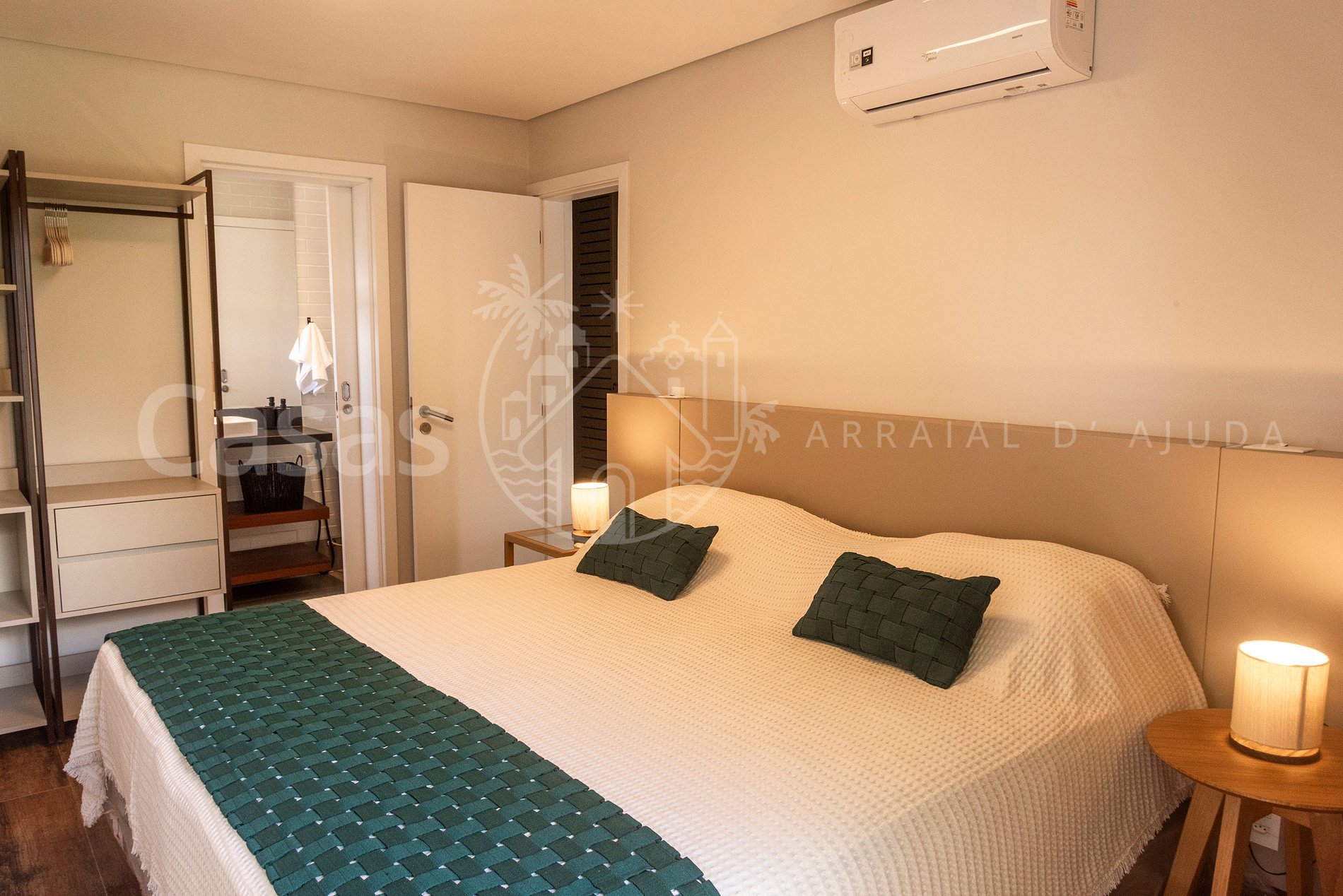 Suíte 1 – Piso superior: Cama king, ar-condicionado, armário, varanda