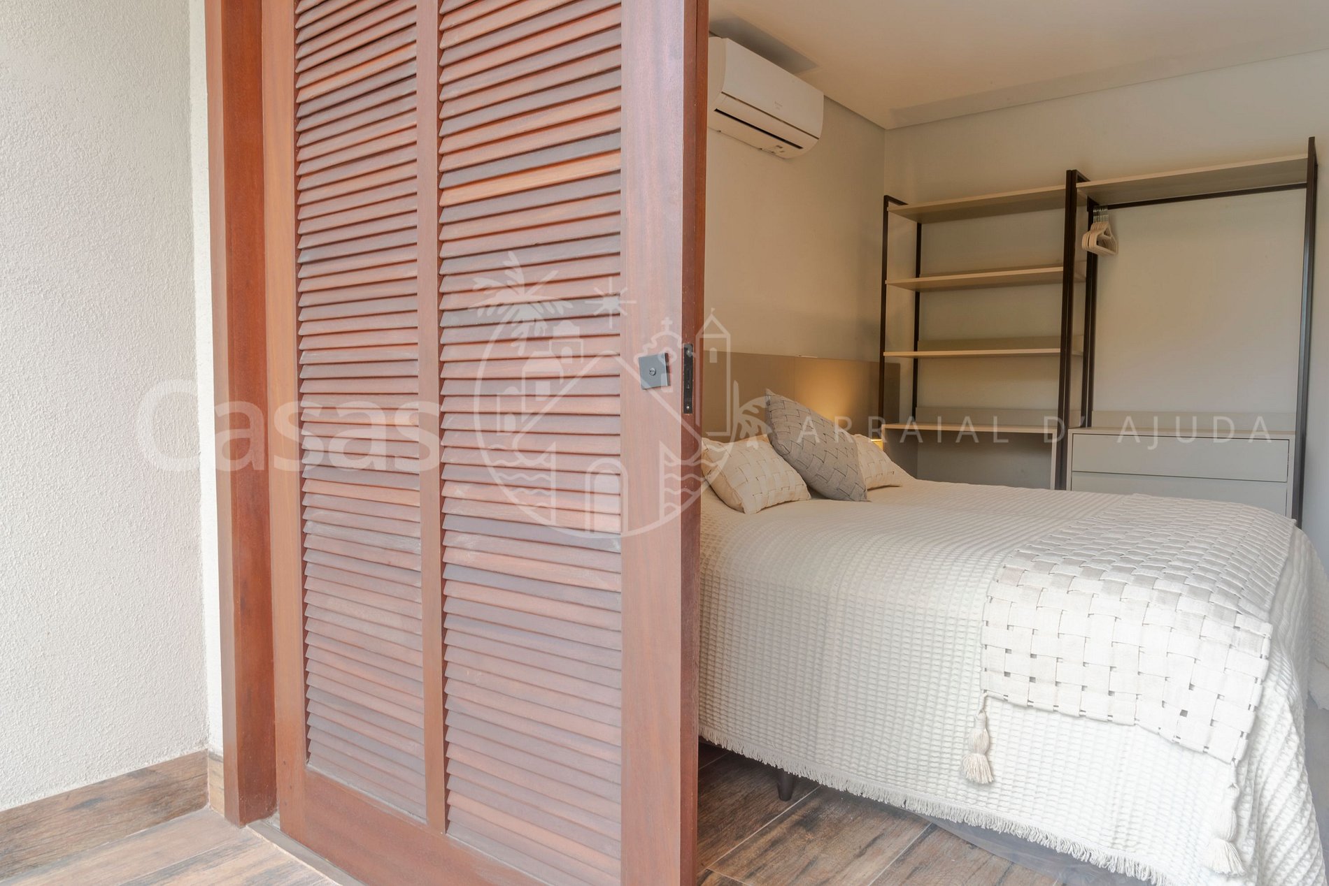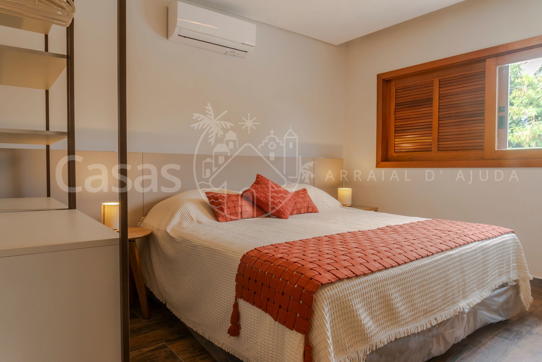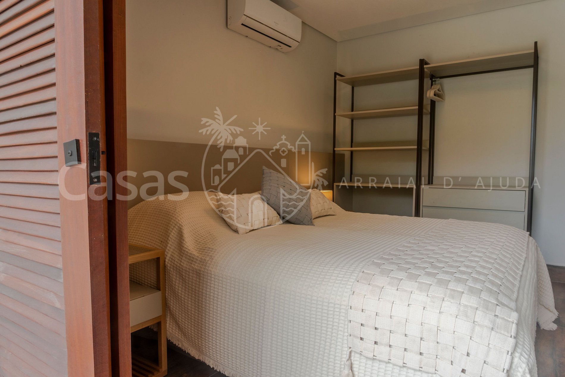 Suíte 1 – Piso superior: Cama king, ar-condicionado, armário, varanda