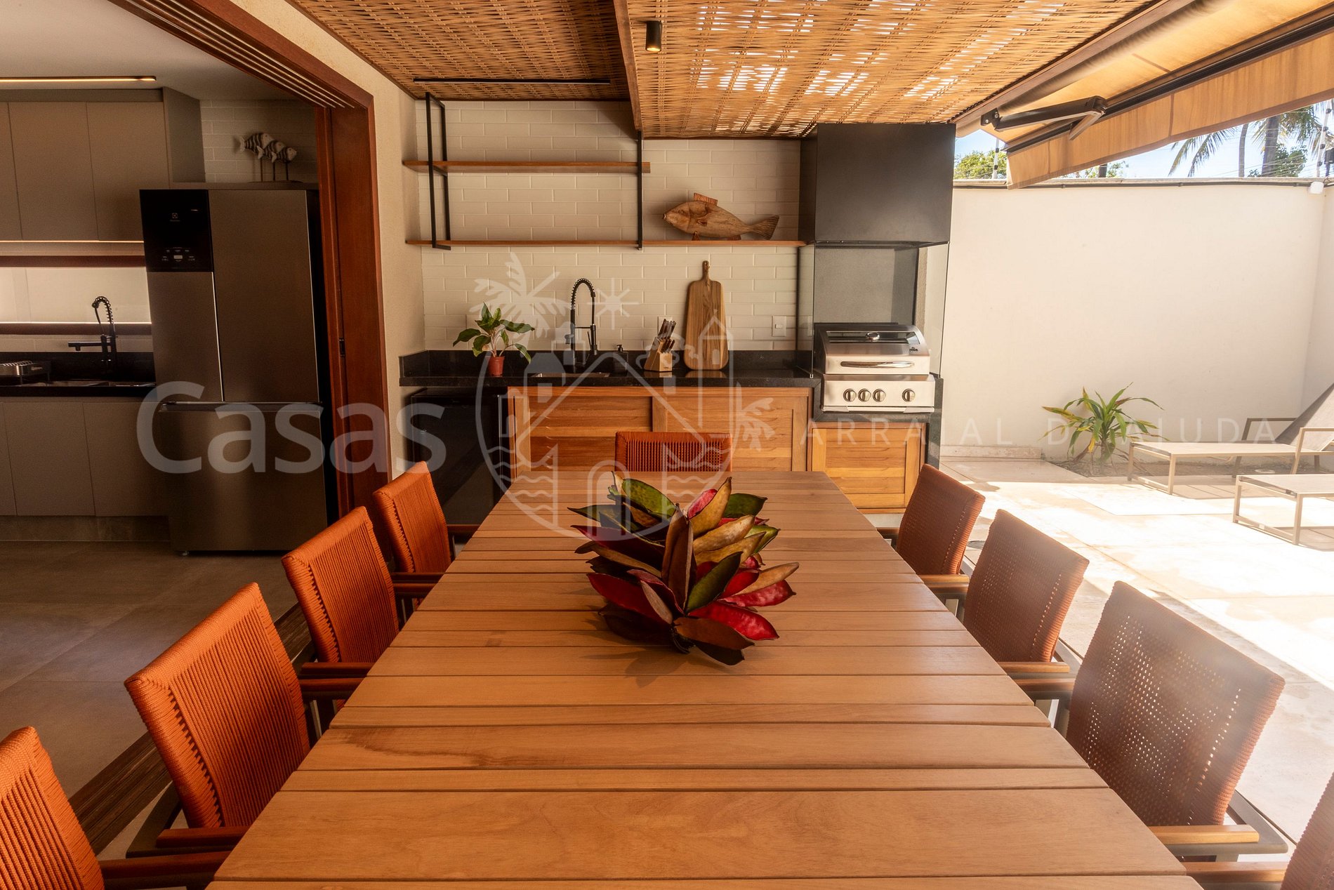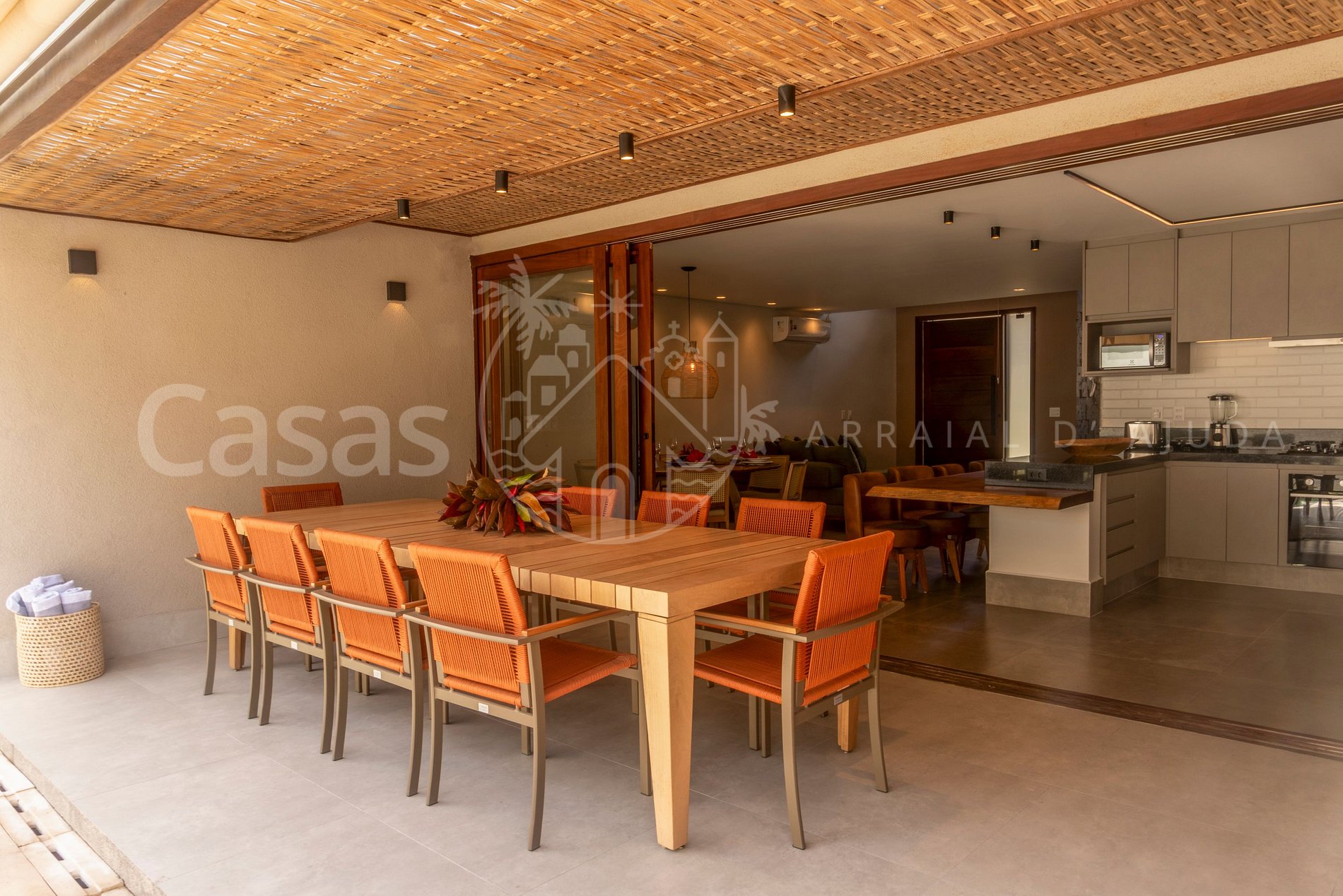 A construção em 2 pisos, tem ambiente moderno e climatizado, pé direito alto, com sala ampla, sendo uma sala de estar, sala de jantar, cozinha completa em conceito aberto com ilha e varanda gourmet com mesa de refeições, churrasqueira e linda piscina, espreguiçadeiras e móveis externos em ambiente confortável e exclusivo.