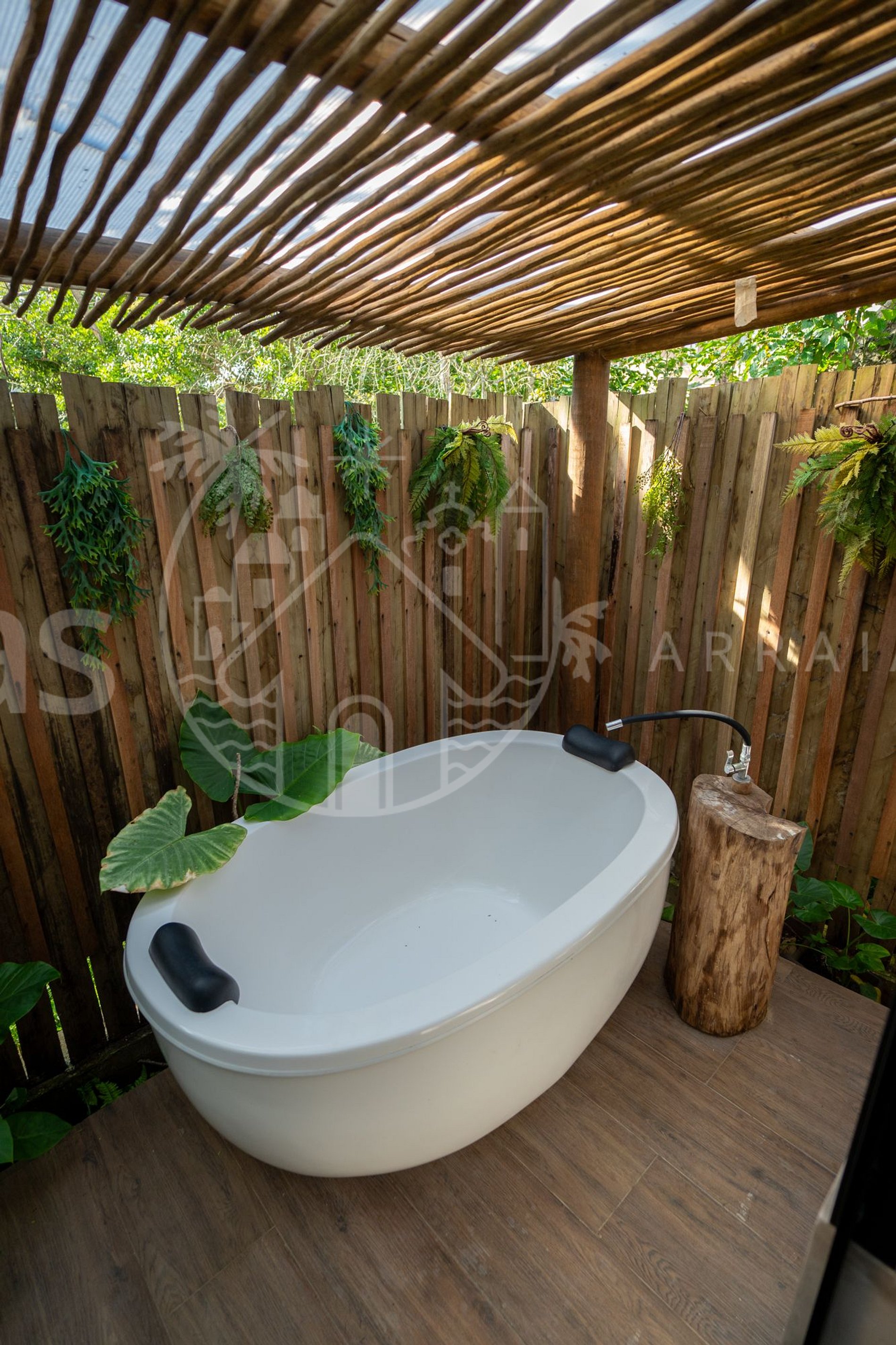 Suíte 1: Piso Superior - Cama queen, cama solteiro, ar-condicionado, banheira, varanda vista mar