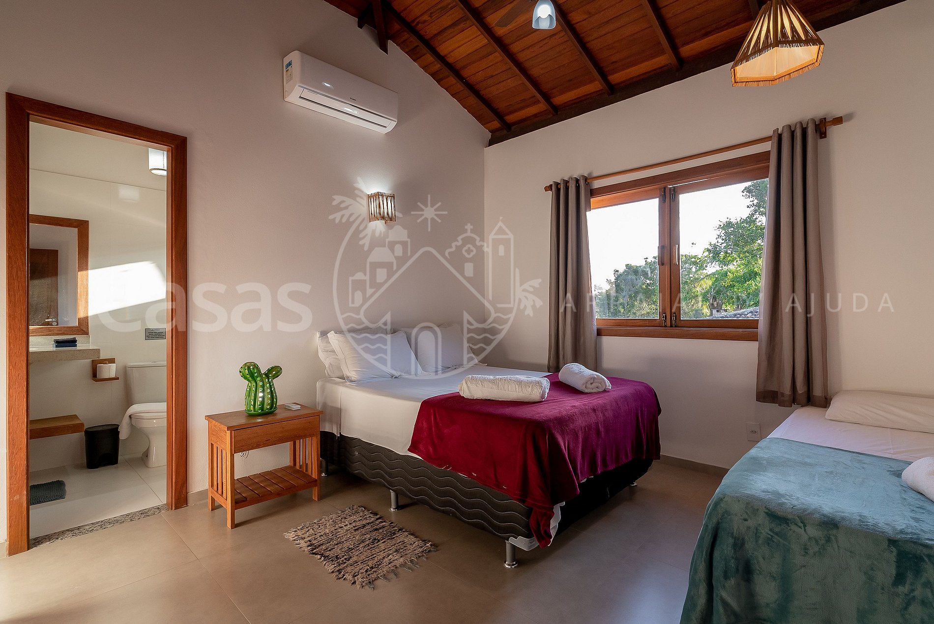As casas independentes, com dois andares, são três suítes, climatizadas, que acomodam confortavelmente 9 hóspedes. Sala com cozinha americana, TV Smart e varandinha com churrasqueira exclusiva.
