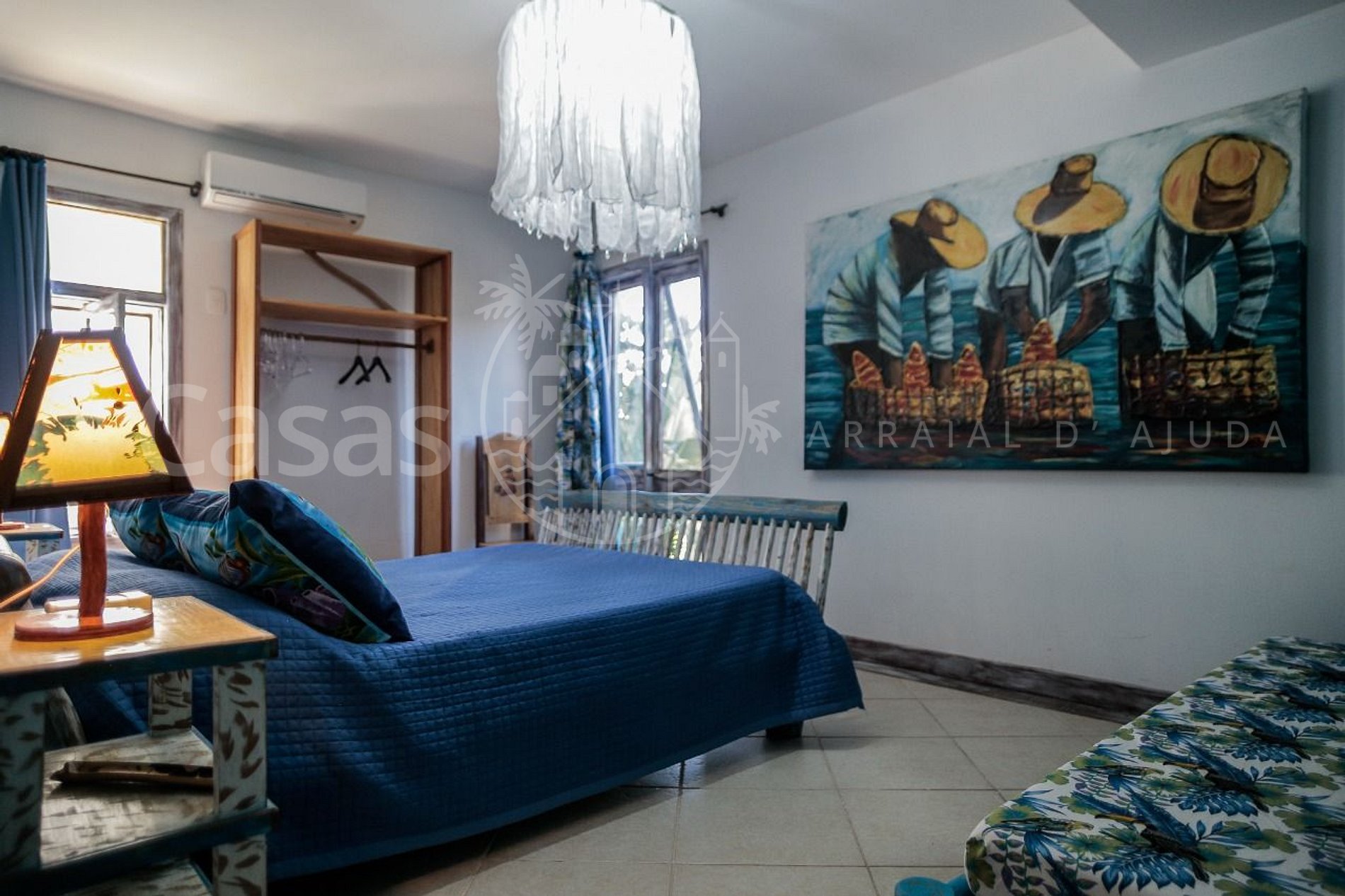 Suíte 2 – Piso Superior: Cama casal, cama solteiro, ar-condicionado, closet e varanda vista mar