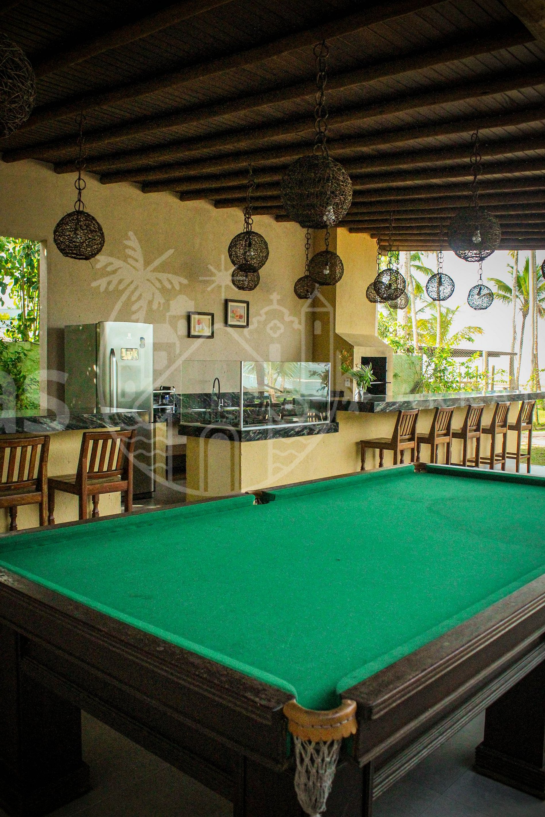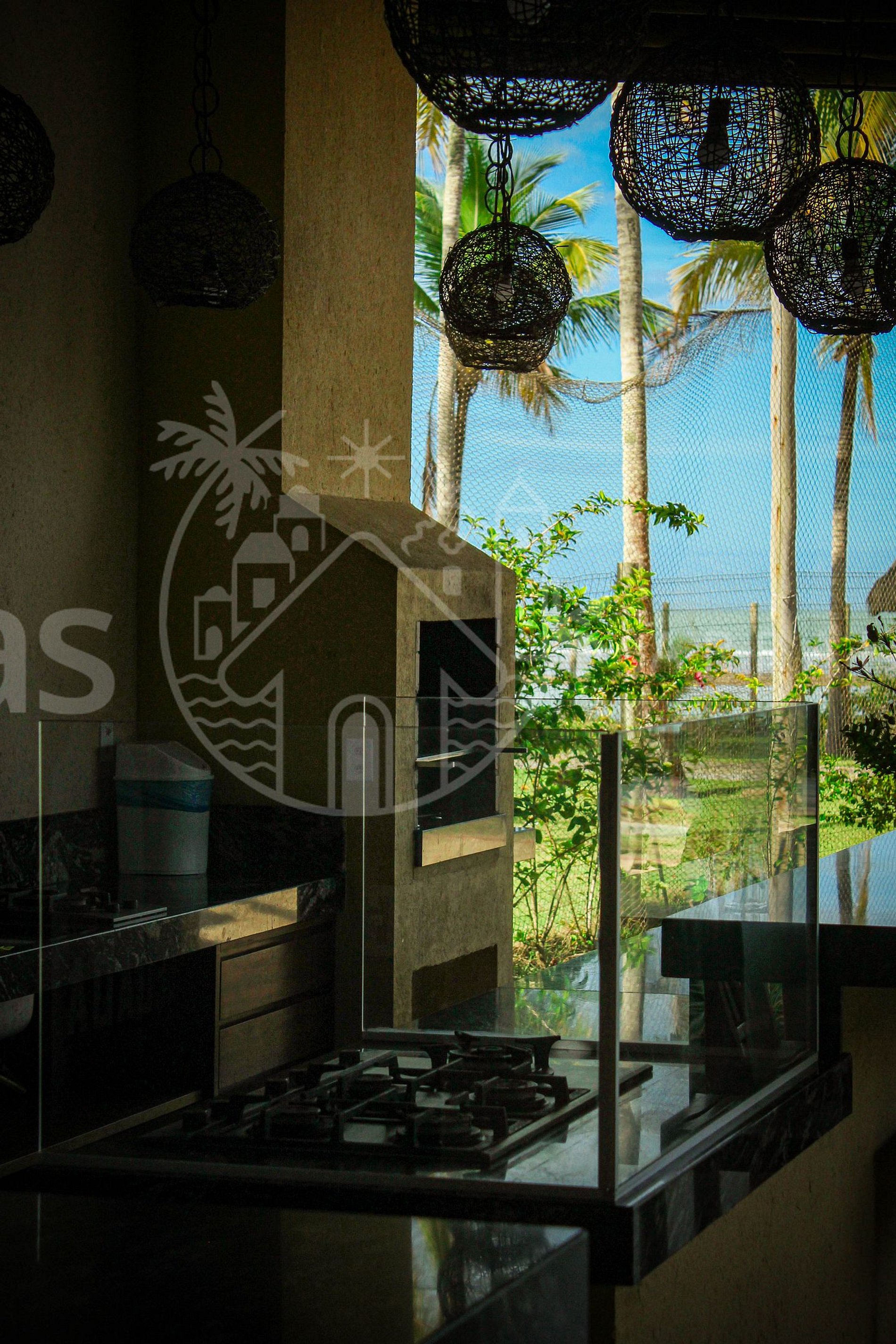 A casa principal com ampla sala, rodeada de varanda com móveis e redes para apreciar a linda vista. A sala com cozinha equipada, ilha central, churrasqueira, sinuca e telão. No piso superior duas suítes com varanda e vista mar.