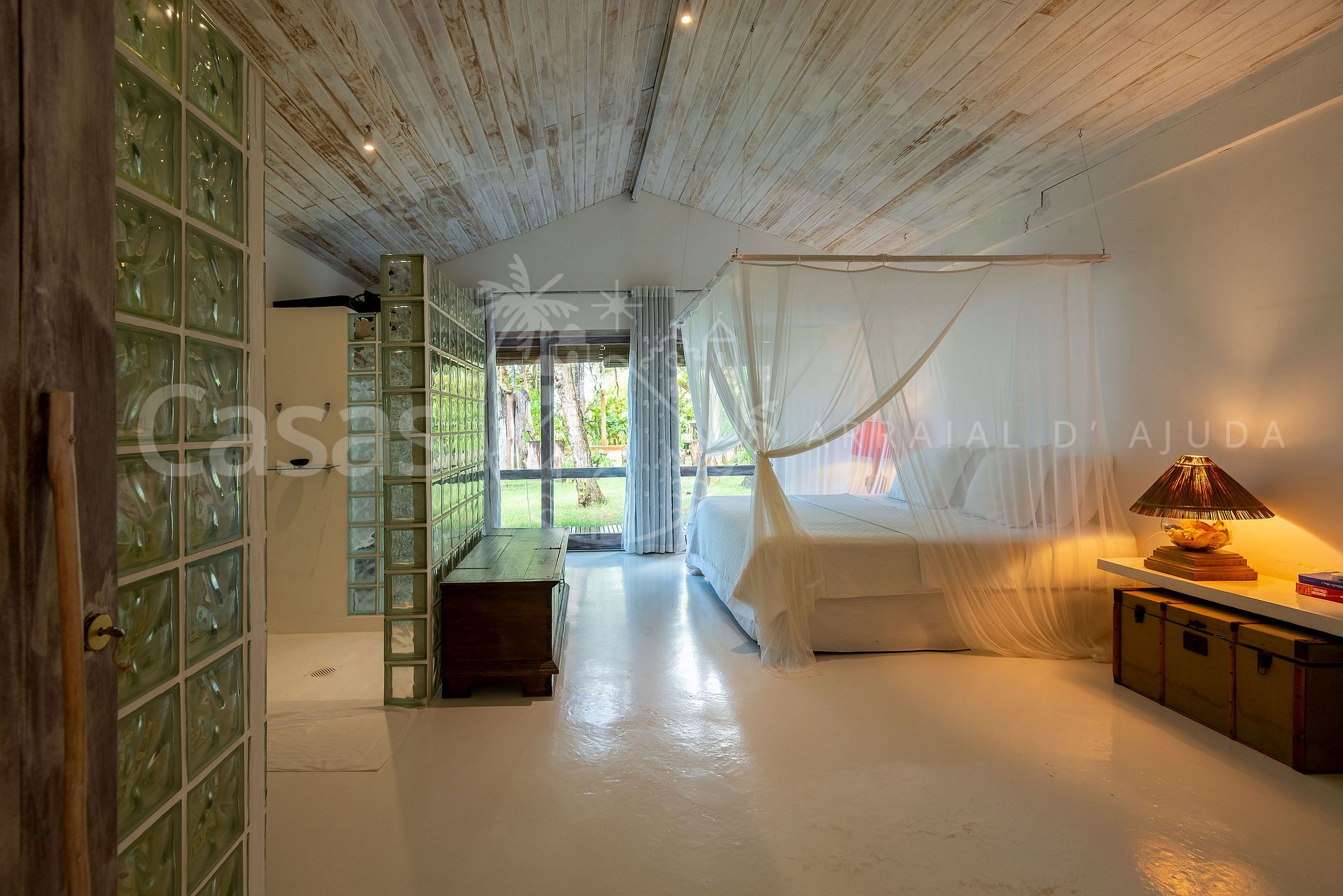 Suíte 2: Suíte cama king com dossel vista mar, ar-condicionado, armário, banheiro, varanda com sofás