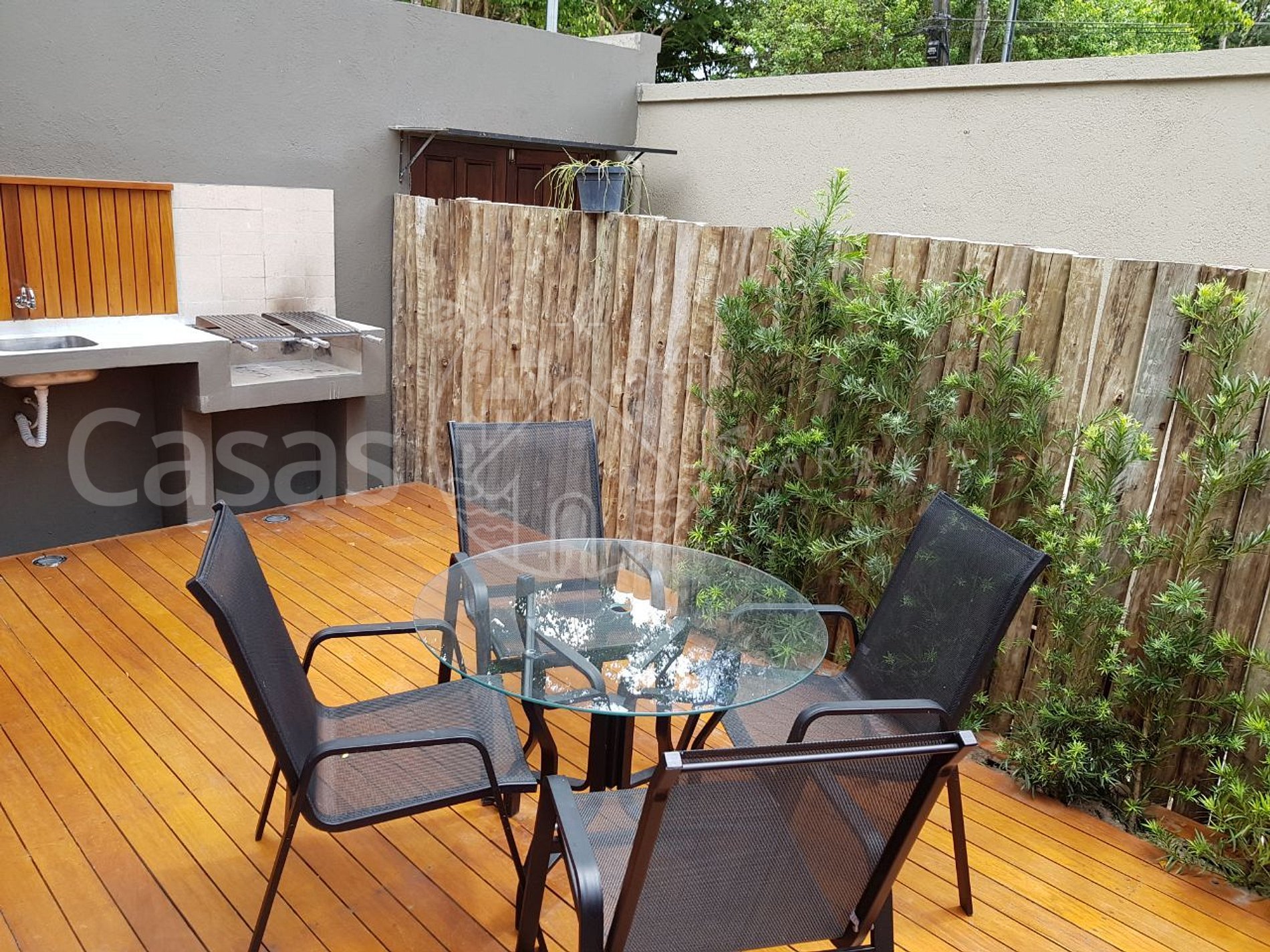 Varanda com churrasqueira, mesa e espreguiçadeiras