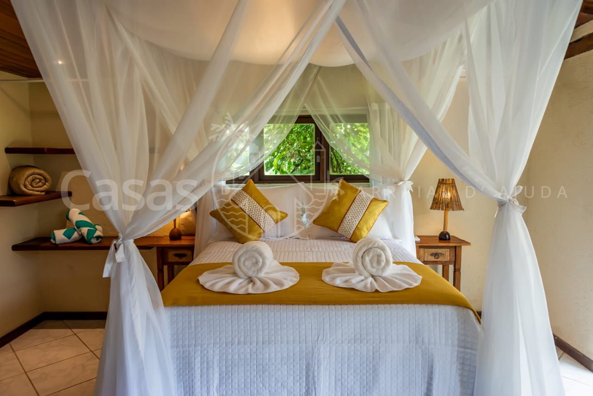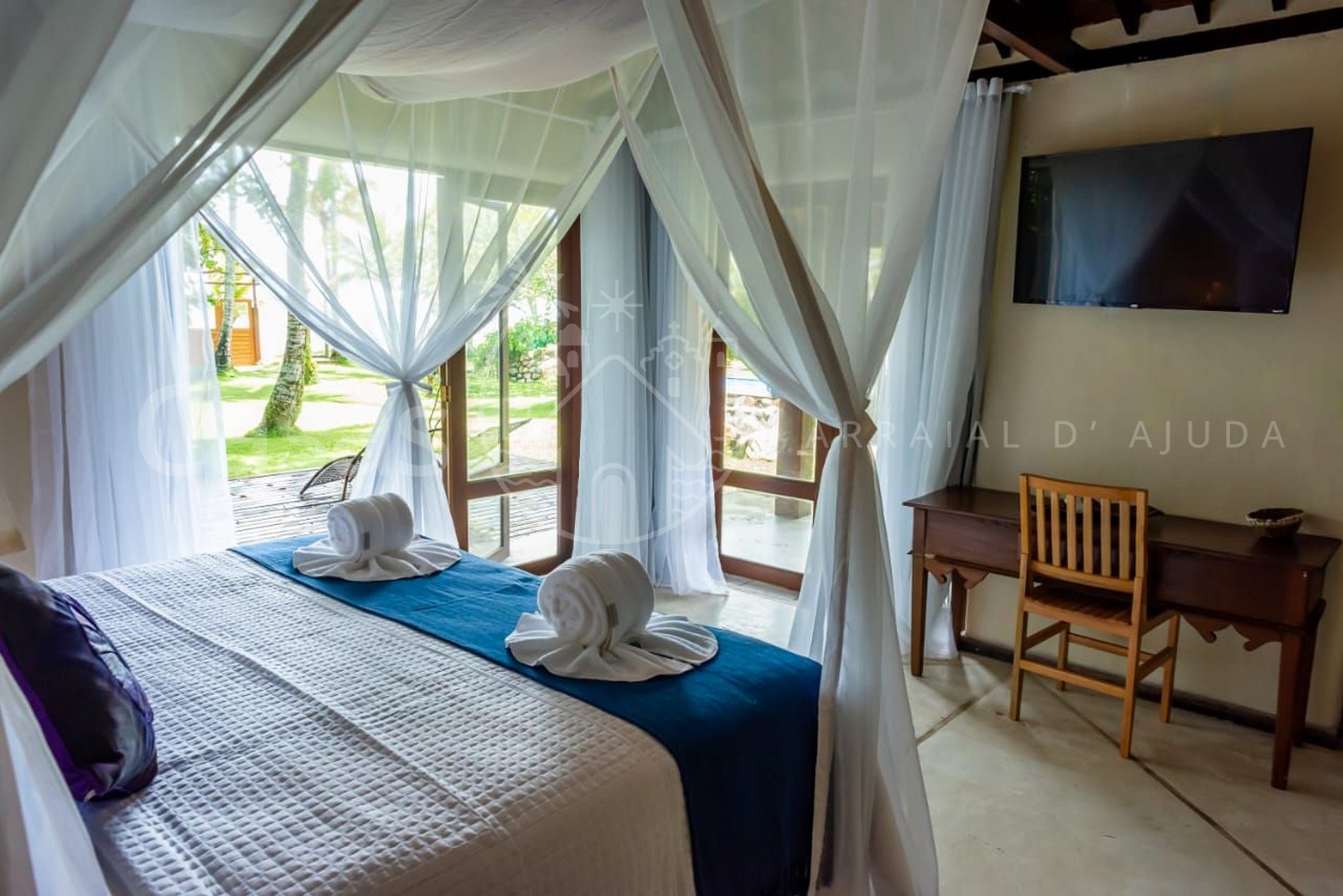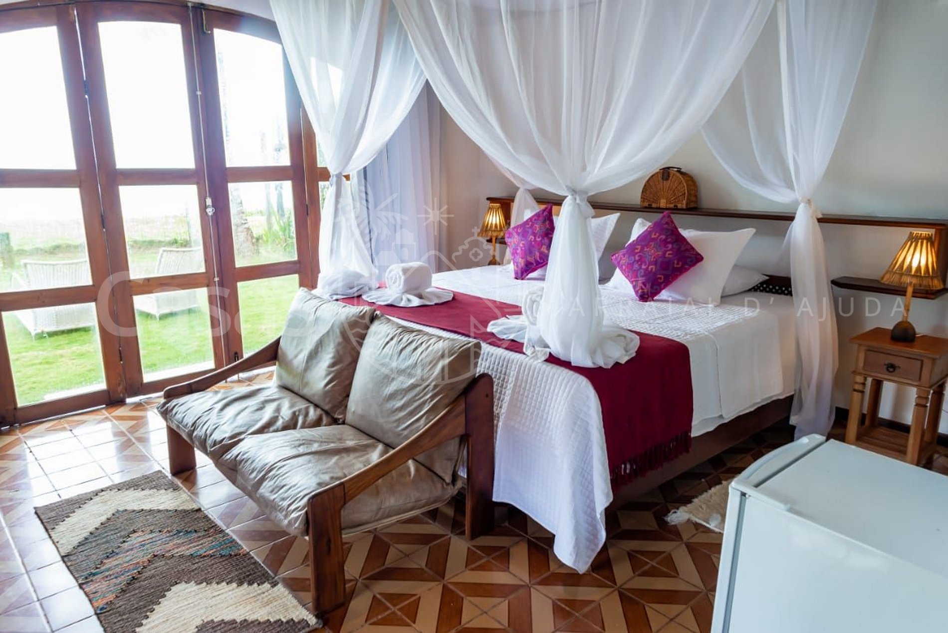 Suíte 6 – Vista mar parcial – Cama king com dossel, bicama solteiro, ar-condicionado, tv, cortina blecaute, espelho de corpo, varanda com rede e cadeiras