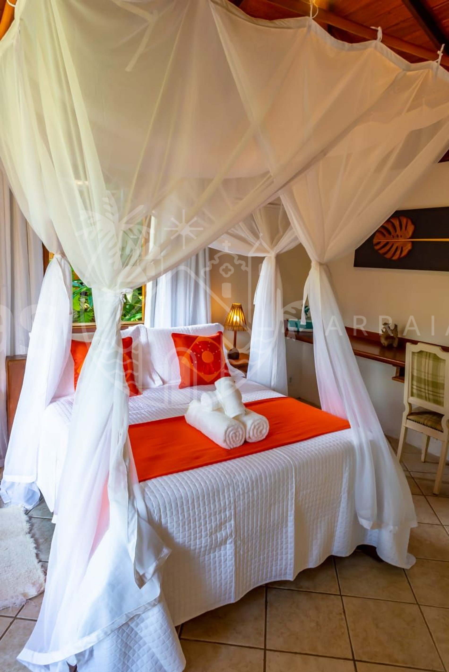 Suíte laranja – Vista Mar – Cama King com dossel, ar-condicionado, tv, guarda-roupa cabideiro, cortina blecaute e voil, frigobar, mesa para suporte home office, varanda com rede e espreguiçadeiras