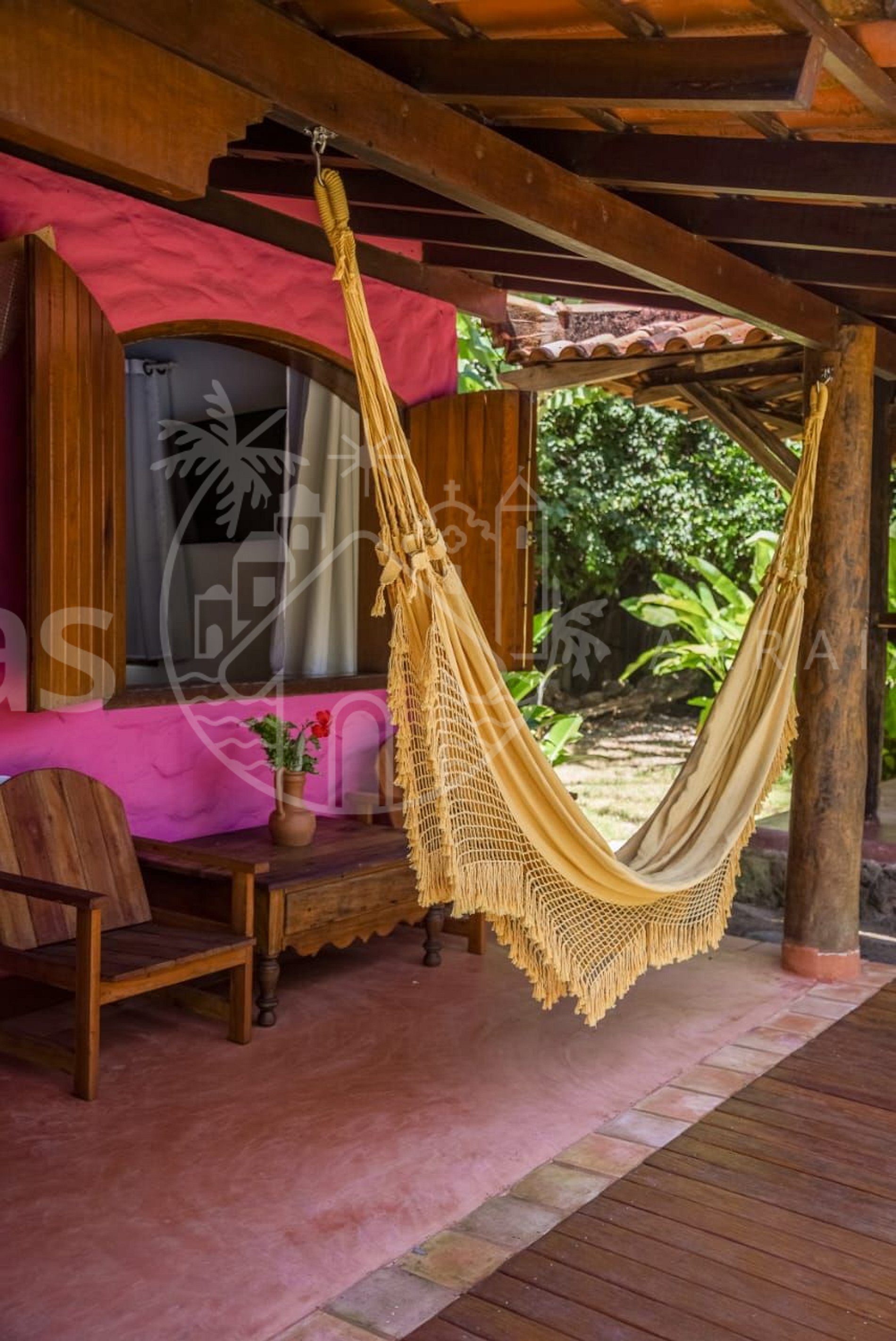 Suíte Rosa 2 – Vista Piscina - Cama Queen com dossel, ar-condicionado, tv, guarda-roupa, cortina blecaute e voil, frigobar, espelho de corpo, varanda com rede e cadeiras