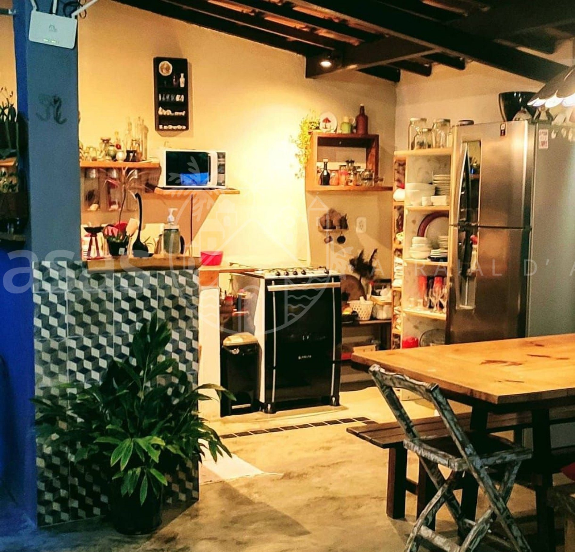 Temos uma cozinha muito arejada, integrada com a area de churrasqueira e uma pequena piscina para desfrutar em suas ferias.
