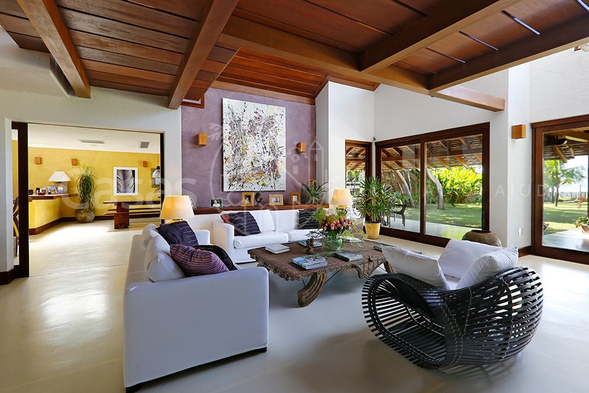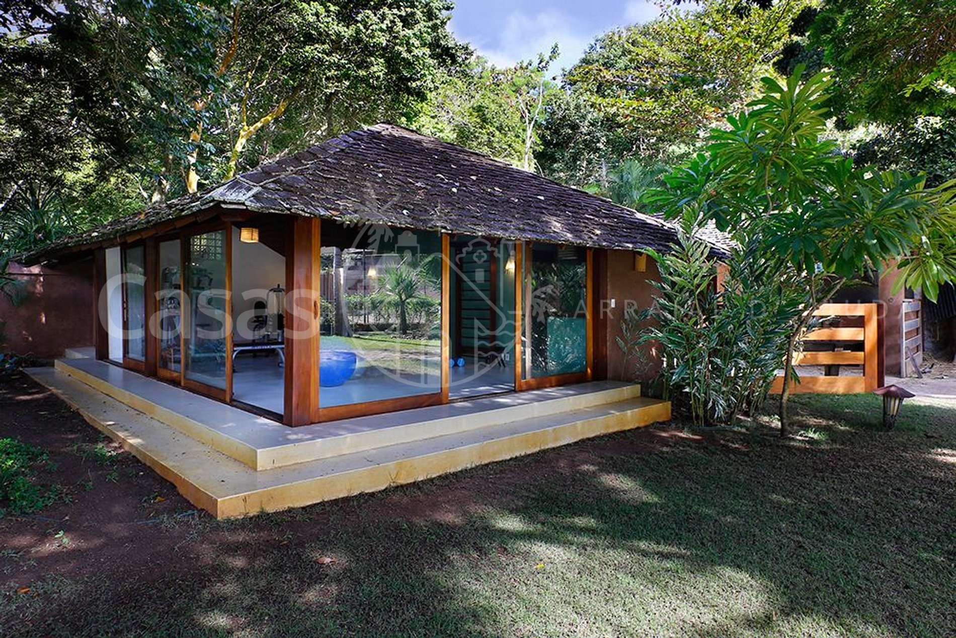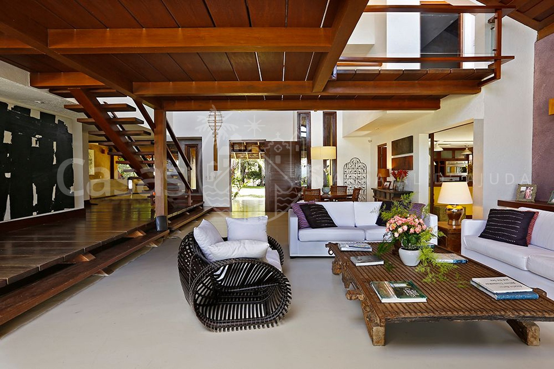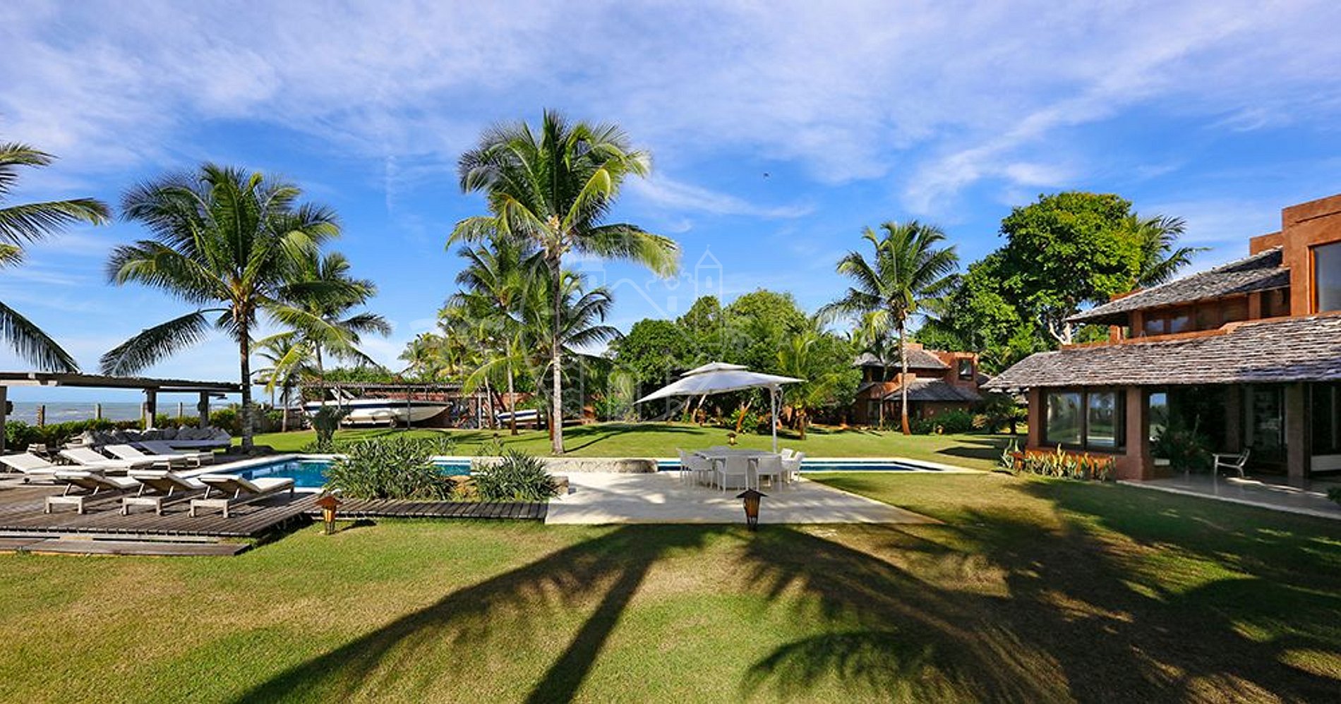 A casa principal, moderna e lindamente construída em frente o mar encanta por sua amplitude e diversidade de ambientes, conectando a propriedade ao jardim e oferecendo uma sensação de bem estar e conexão com a natureza.