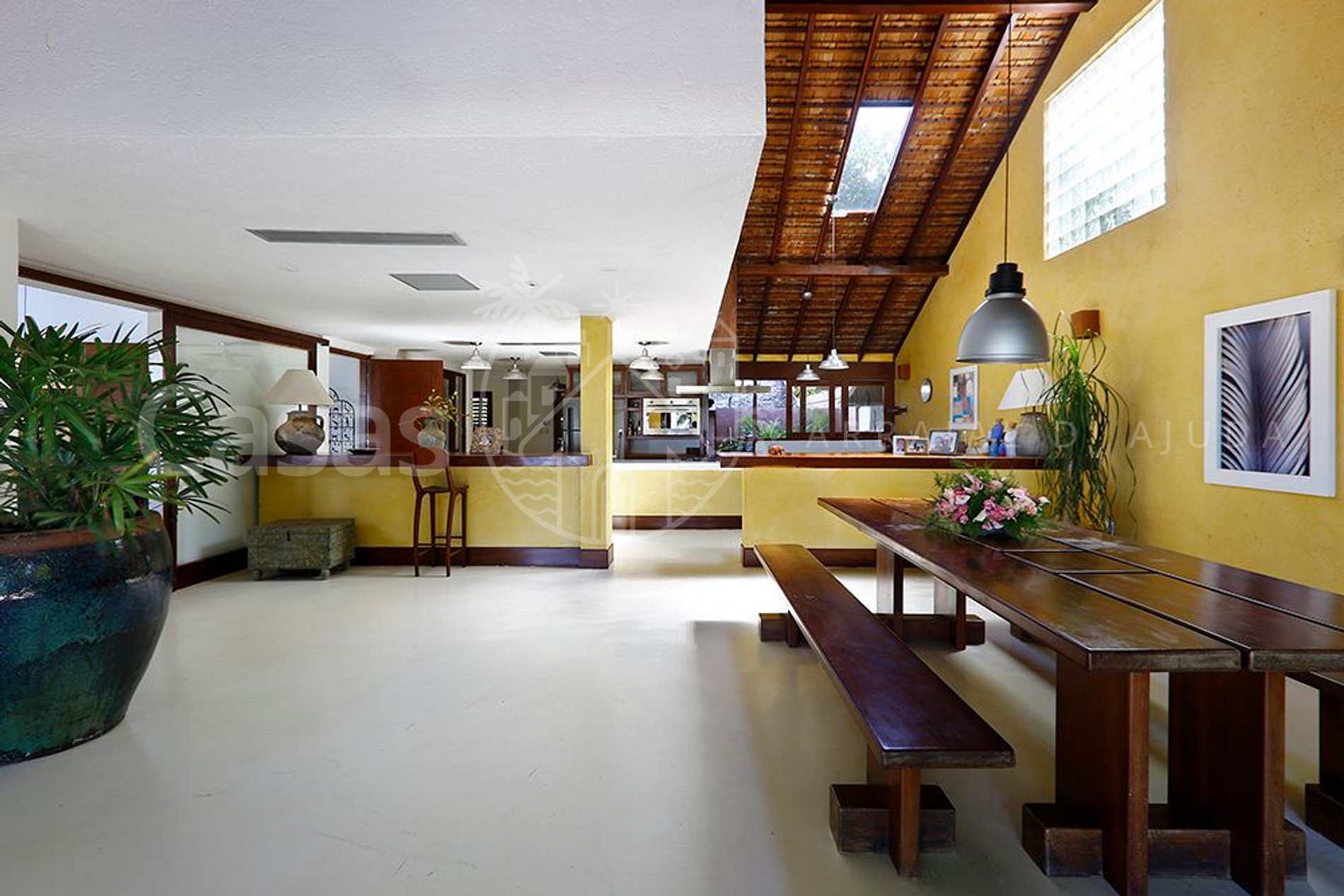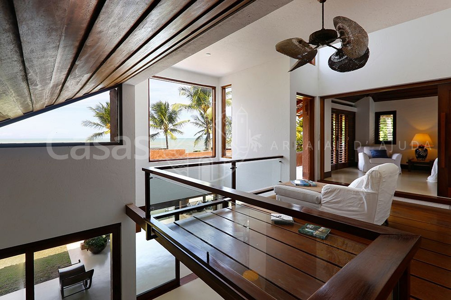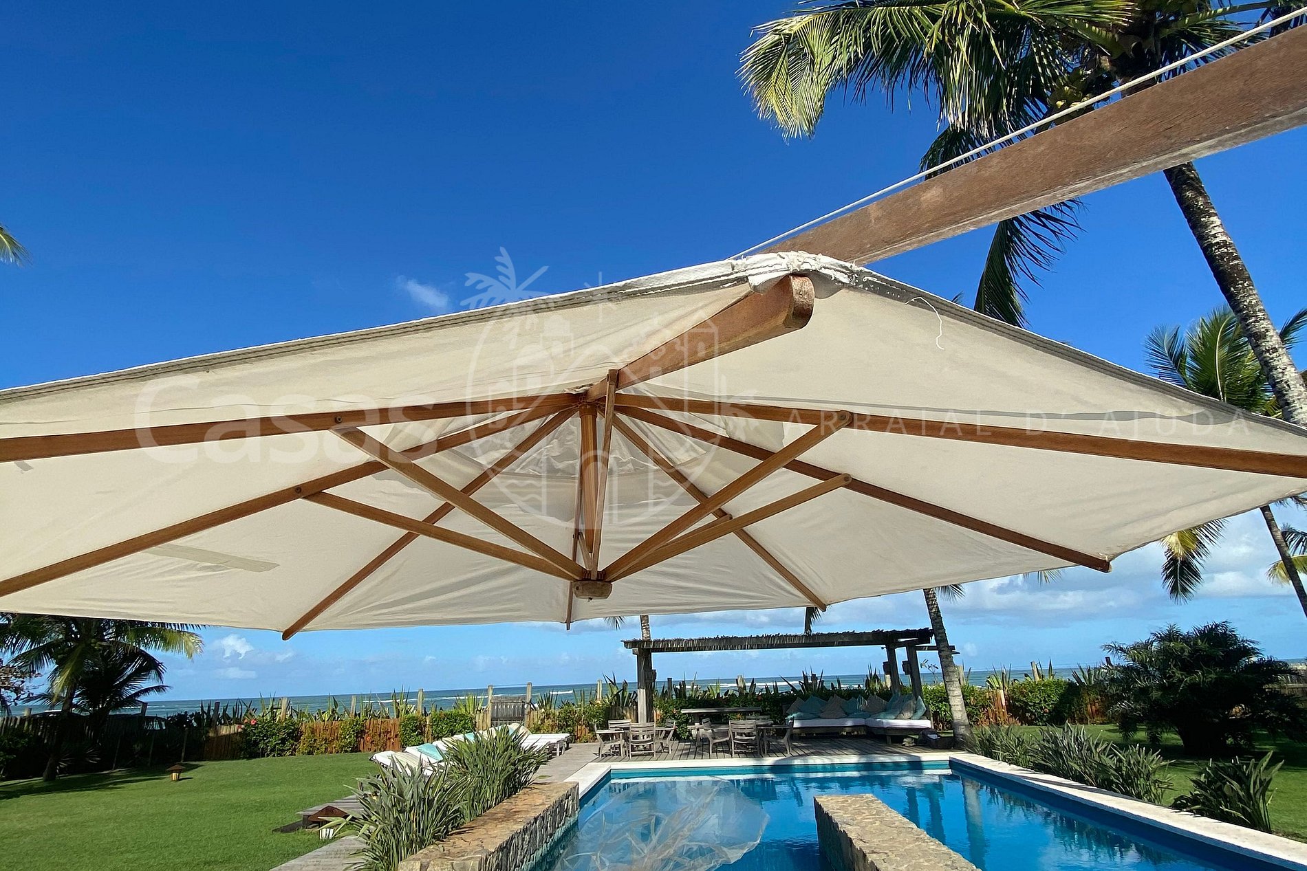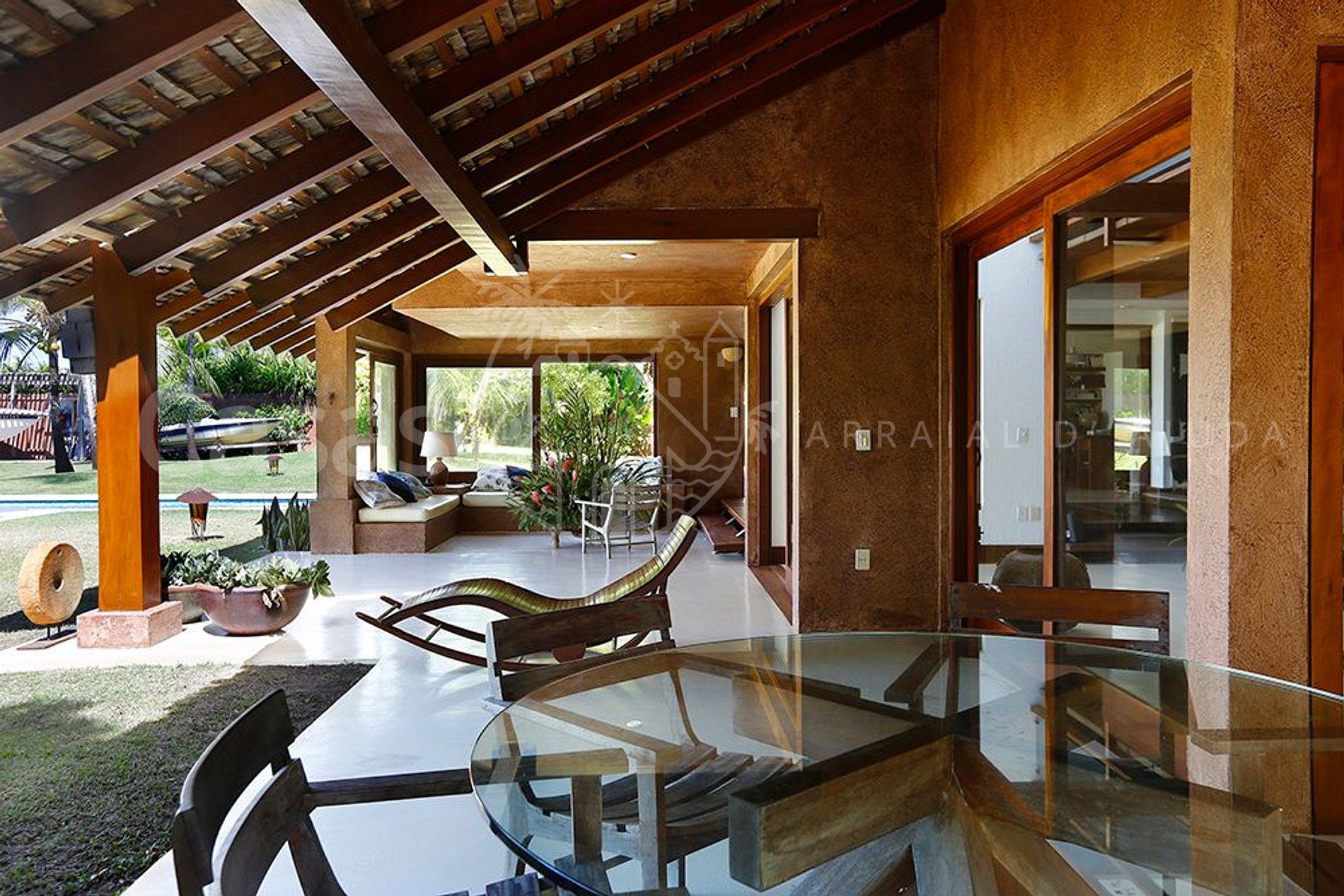 A casa principal, moderna e lindamente construída em frente o mar encanta por sua amplitude e diversidade de ambientes, conectando a propriedade ao jardim e oferecendo uma sensação de bem estar e conexão com a natureza.