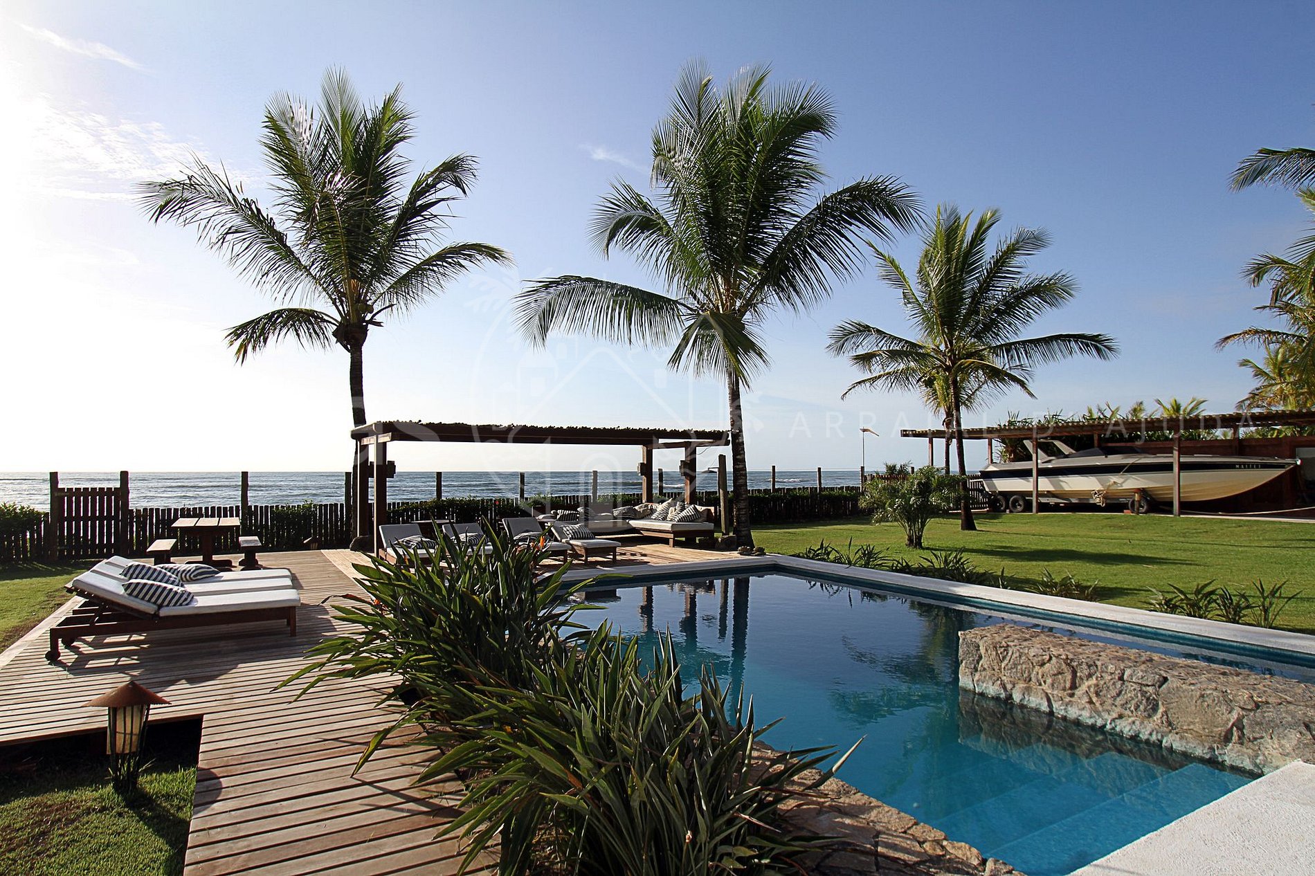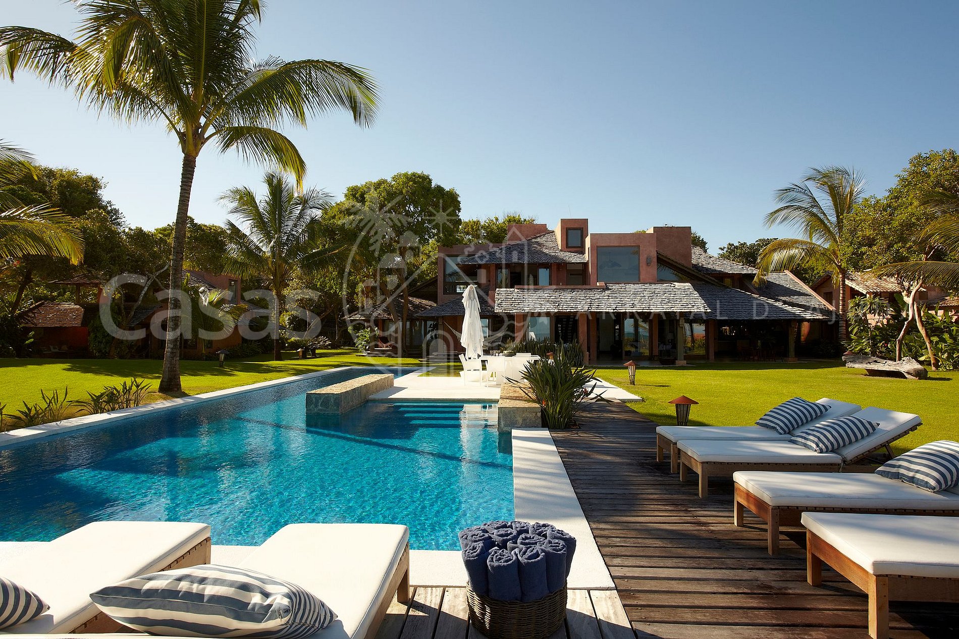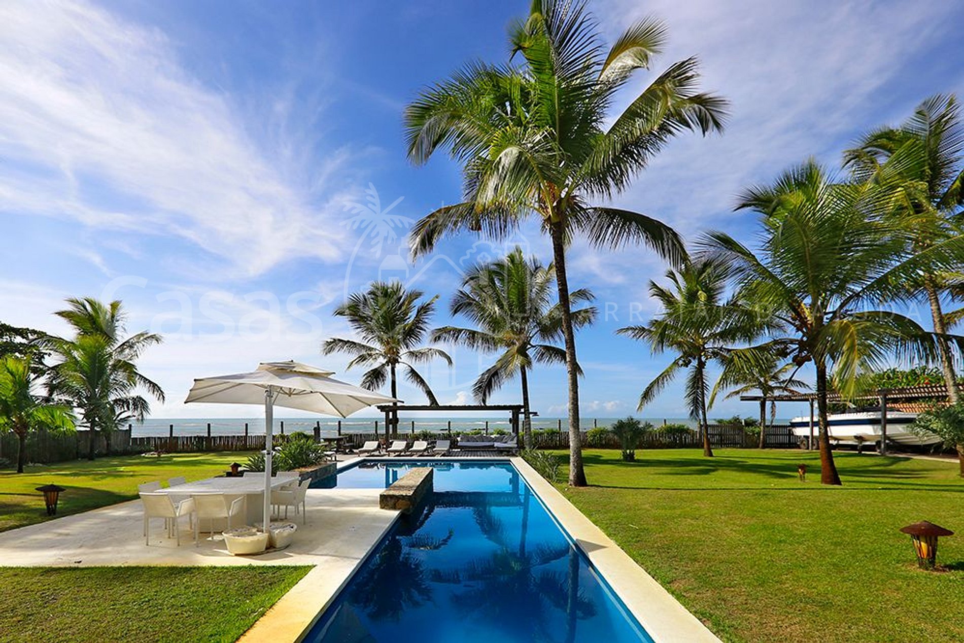 A casa tem total de 05 suítes, amplas e muito confortáveis, com uma belíssima área de lazer e piscina frente ao mar, acesso exclusivo à praia, academia de ginástica, hípica com cavalos e staff completo.