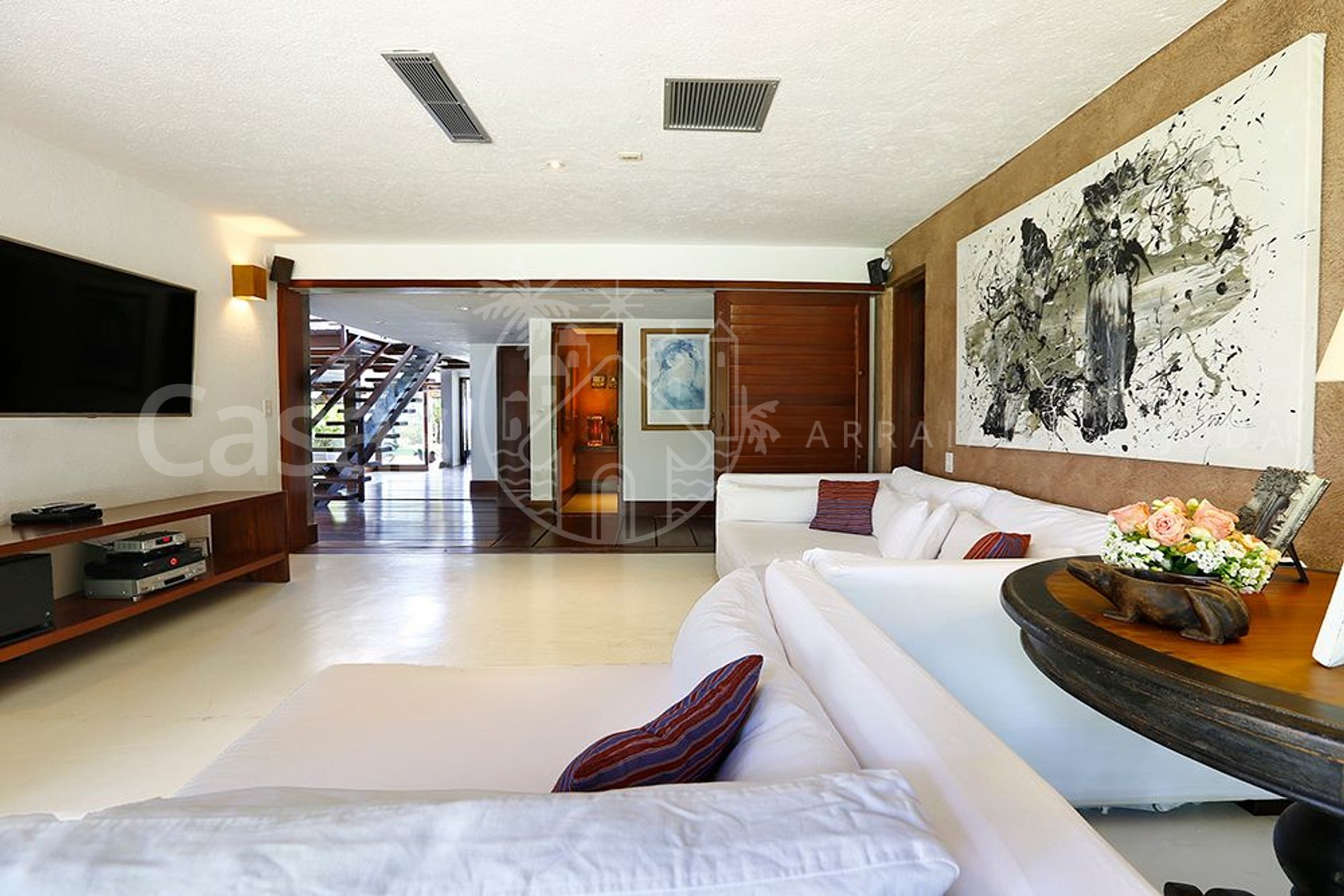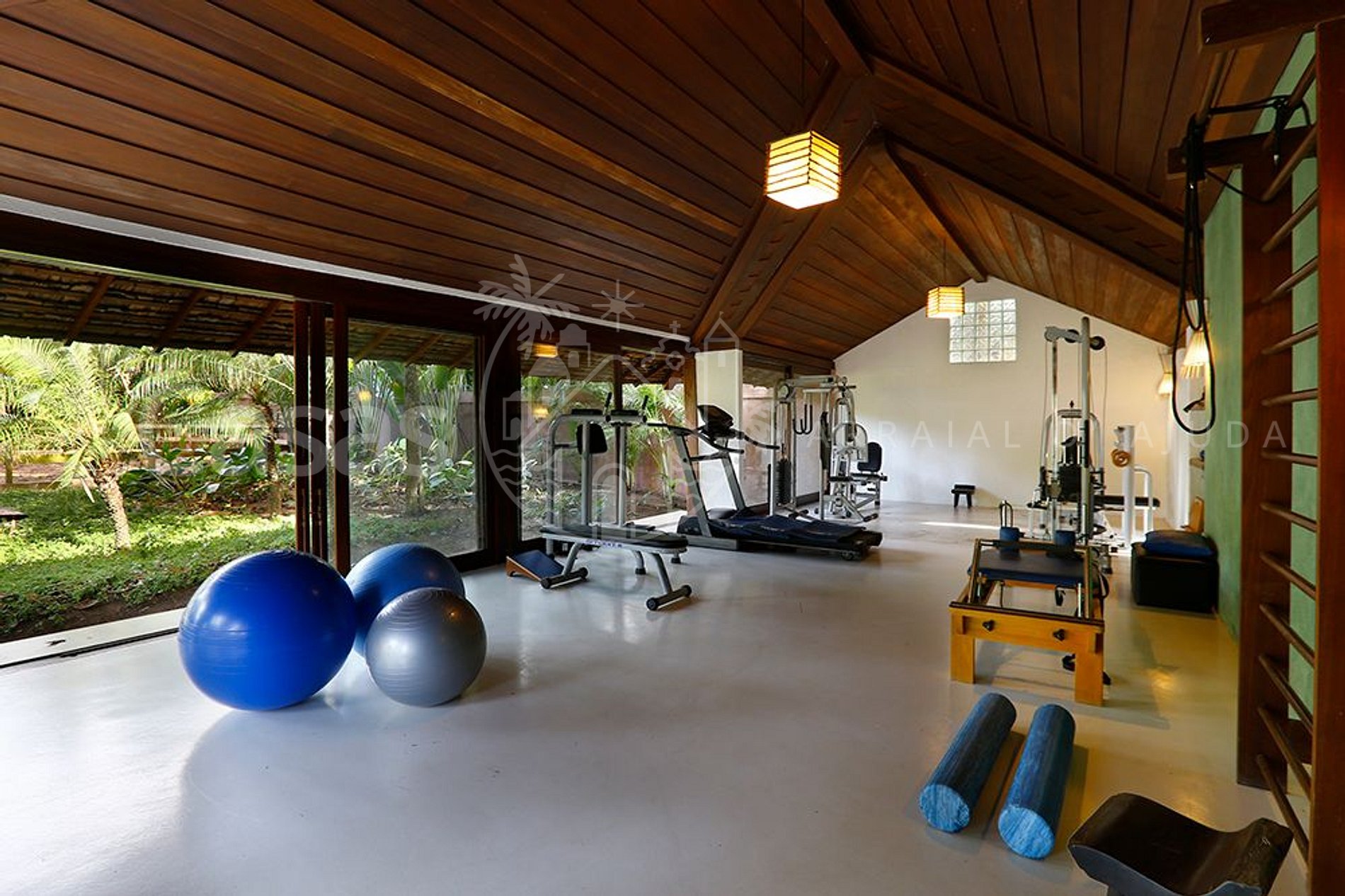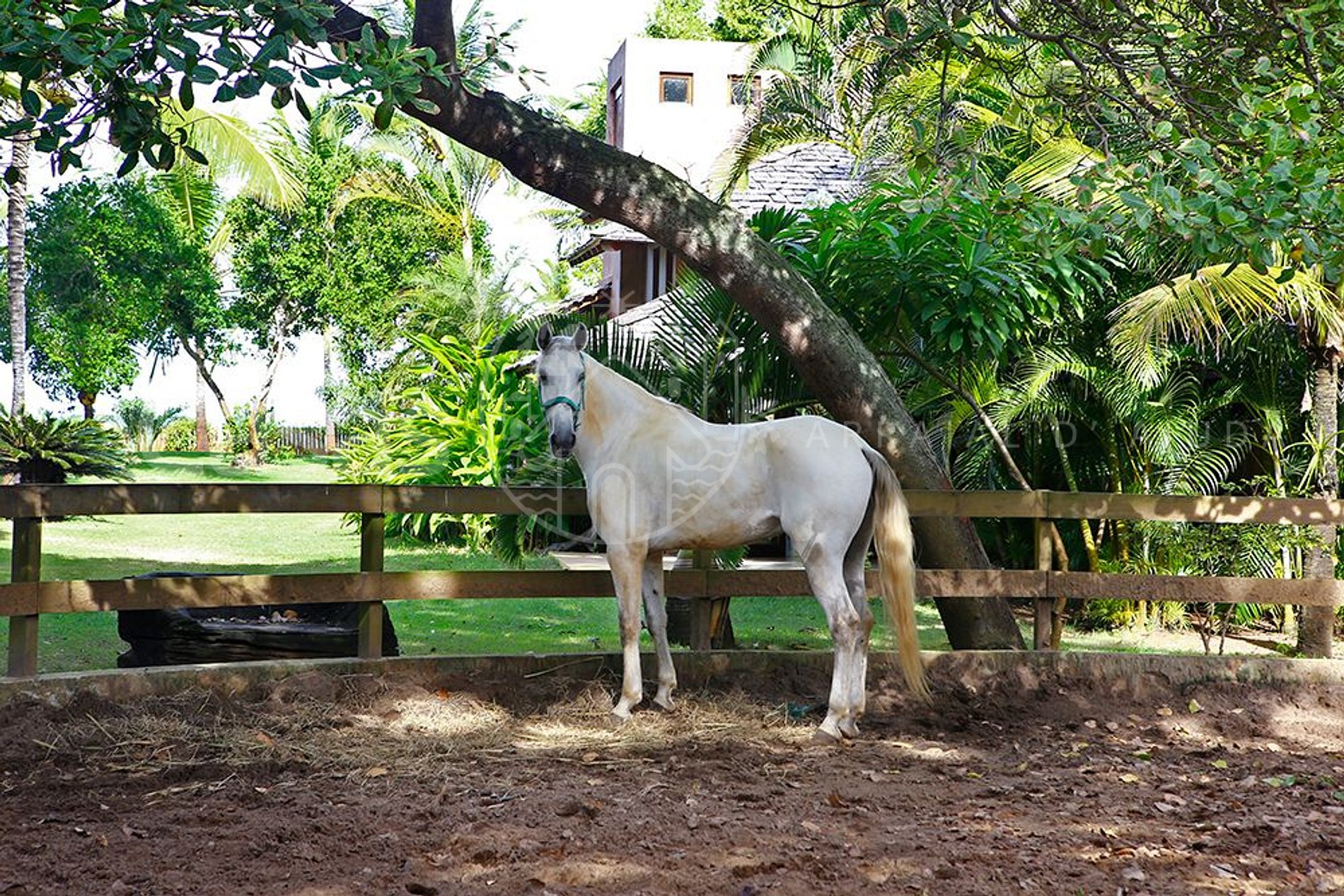 A casa tem total de 05 suítes, amplas e muito confortáveis, com uma belíssima área de lazer e piscina frente ao mar, acesso exclusivo à praia, academia de ginástica, hípica com cavalos e staff completo.