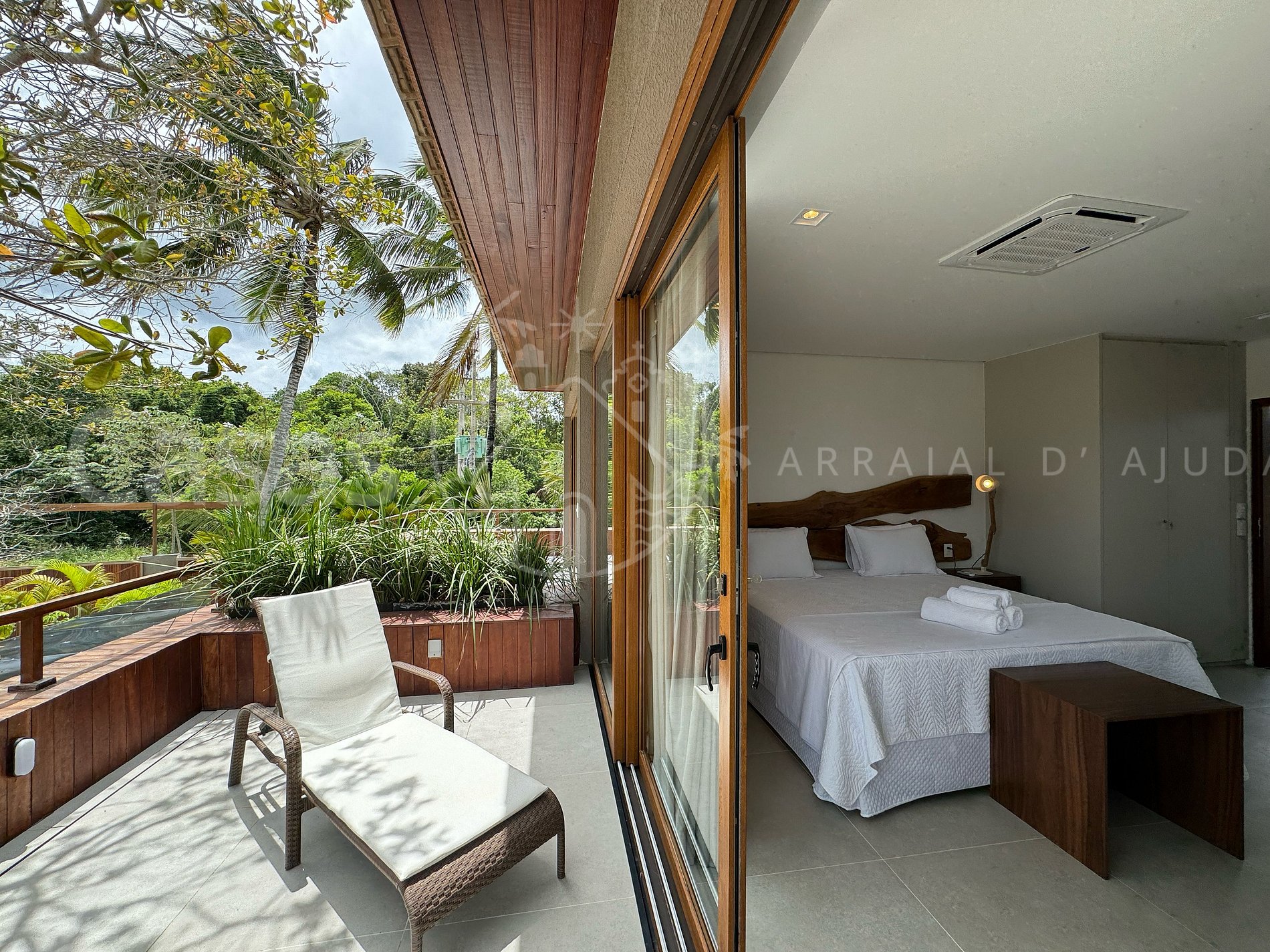 Suíte 2 – Piso superior: Cama King, mesa de cabeceira, armário, ar-condicionado, cortinas blackout, varanda com espreguiçadeira e vista jardim
