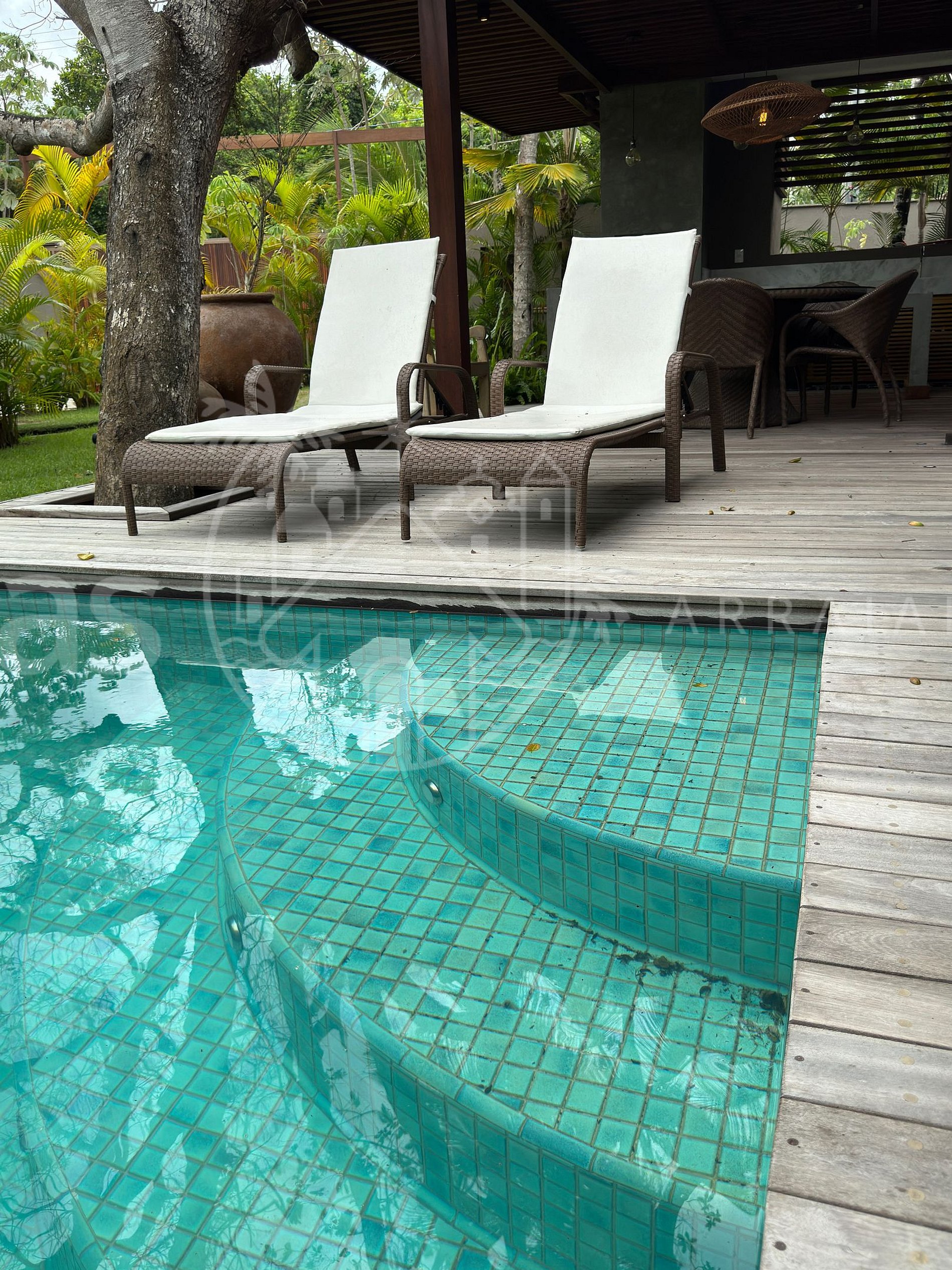 Dentre os confortáveis ambientes da casa, destaca-se o espaço gourmet com churrasqueira, mesa, ilha central e uma linda piscina com confortáveis espreguiçadeiras acolchoadas. A ampla sala de tv comunica-se com a piscina e o jardim, tornando o ambiente arejado e ainda mais agradável.