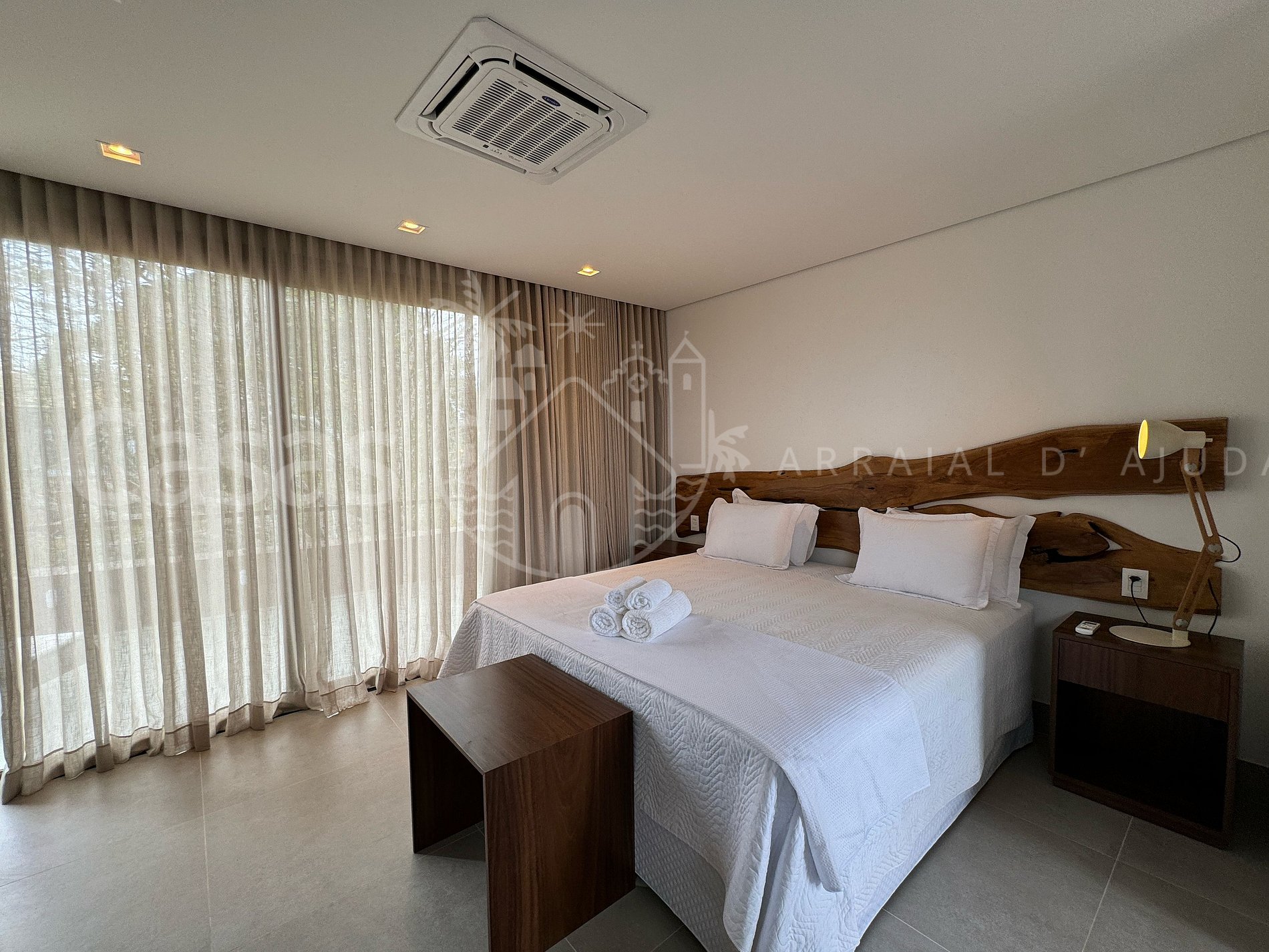 Suíte 1 – Piso superior: Cama King, mesa de cabeceira, armário, ar-condicionado, cortinas blackout, banheiro vista mar