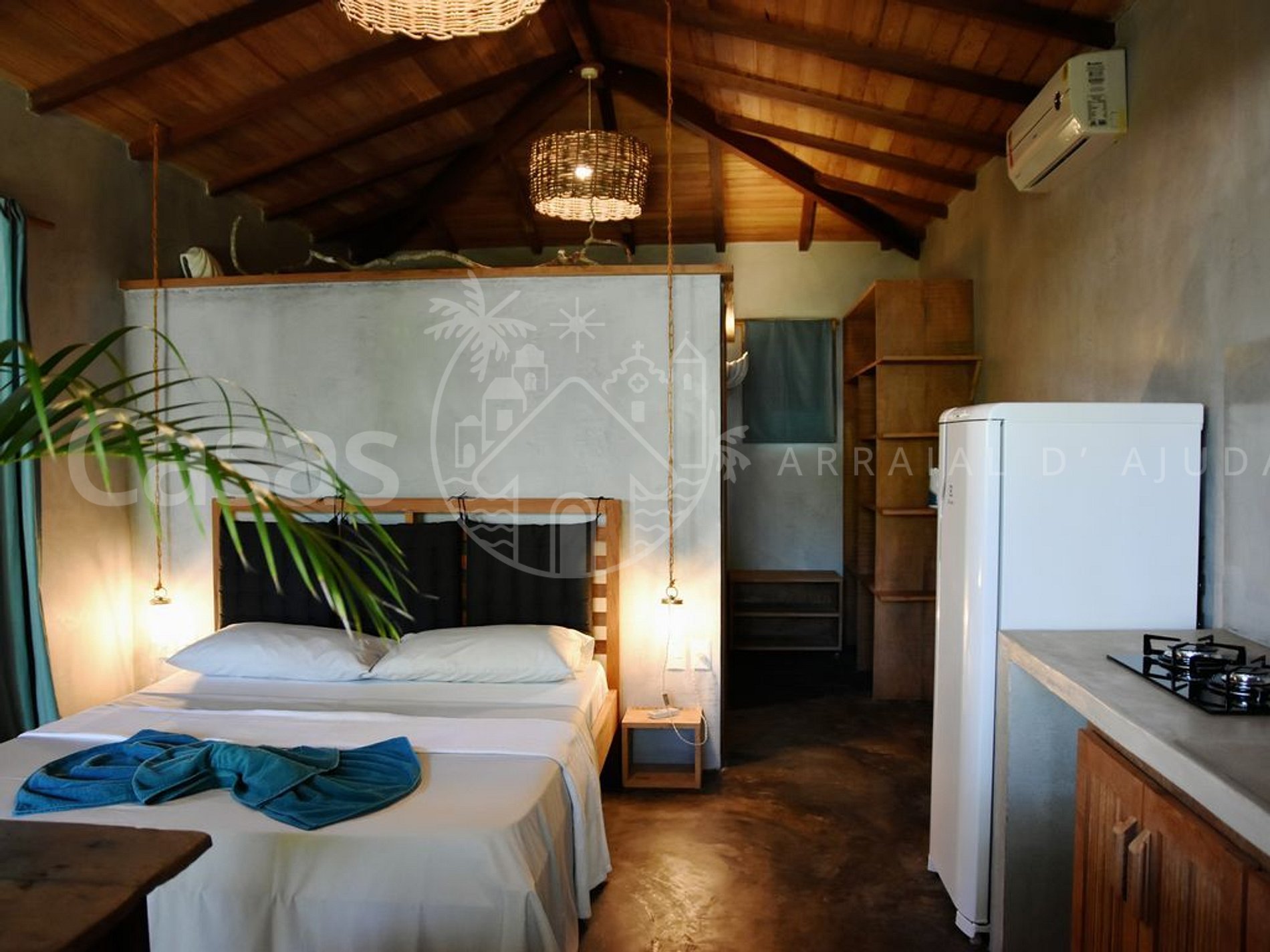 Os chalés são climatizados e equipados com cozinha e varanda com redes e cadeiras.