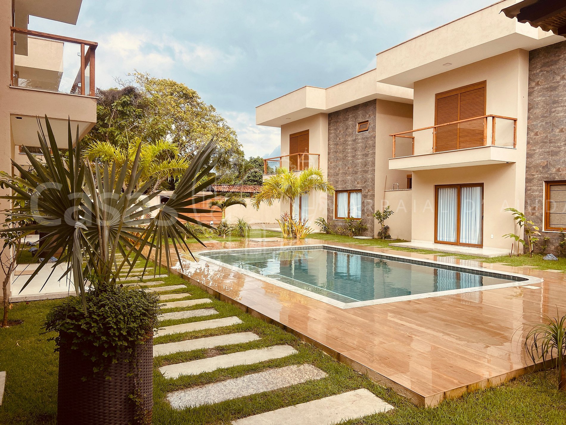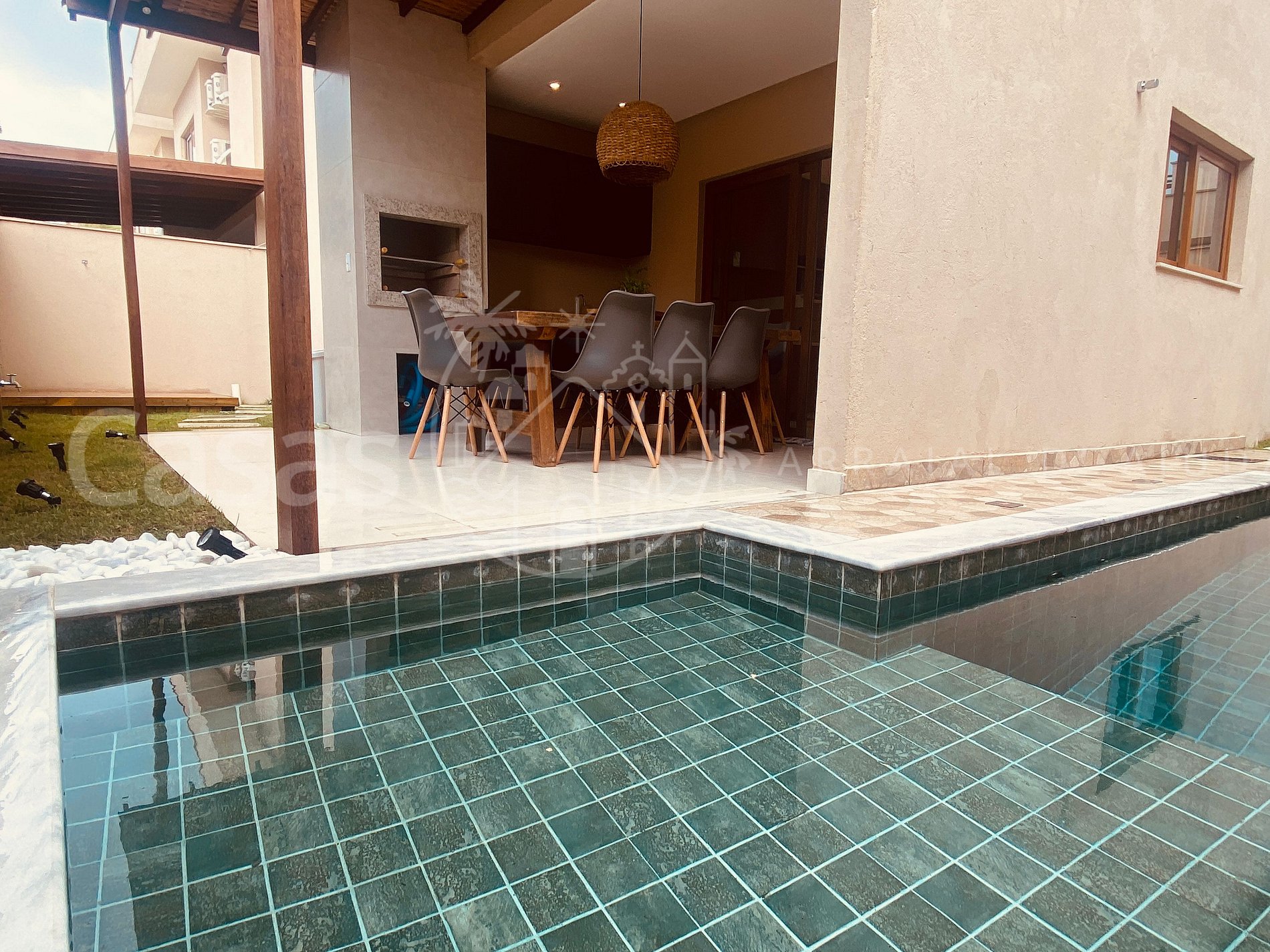 O condomínio com apenas 6 casas, tem uma maravilhosa piscina com espreguiçadeiras, ombrelones e espaço de churrasco compartilhado.