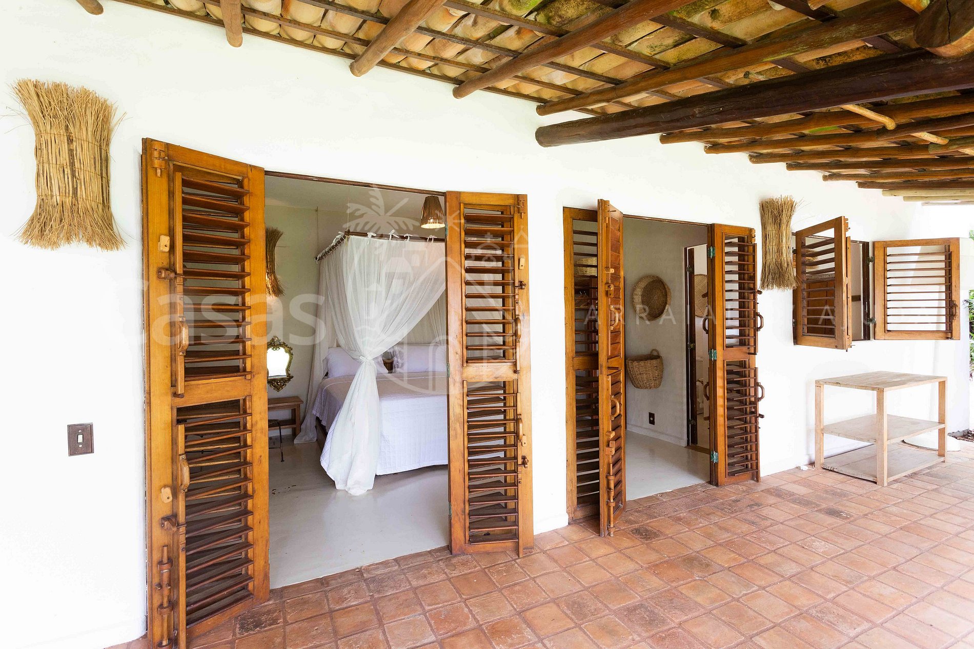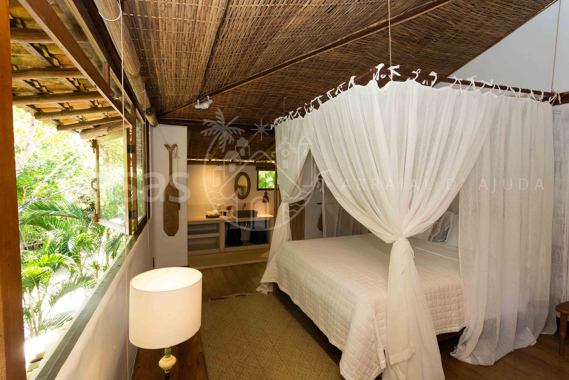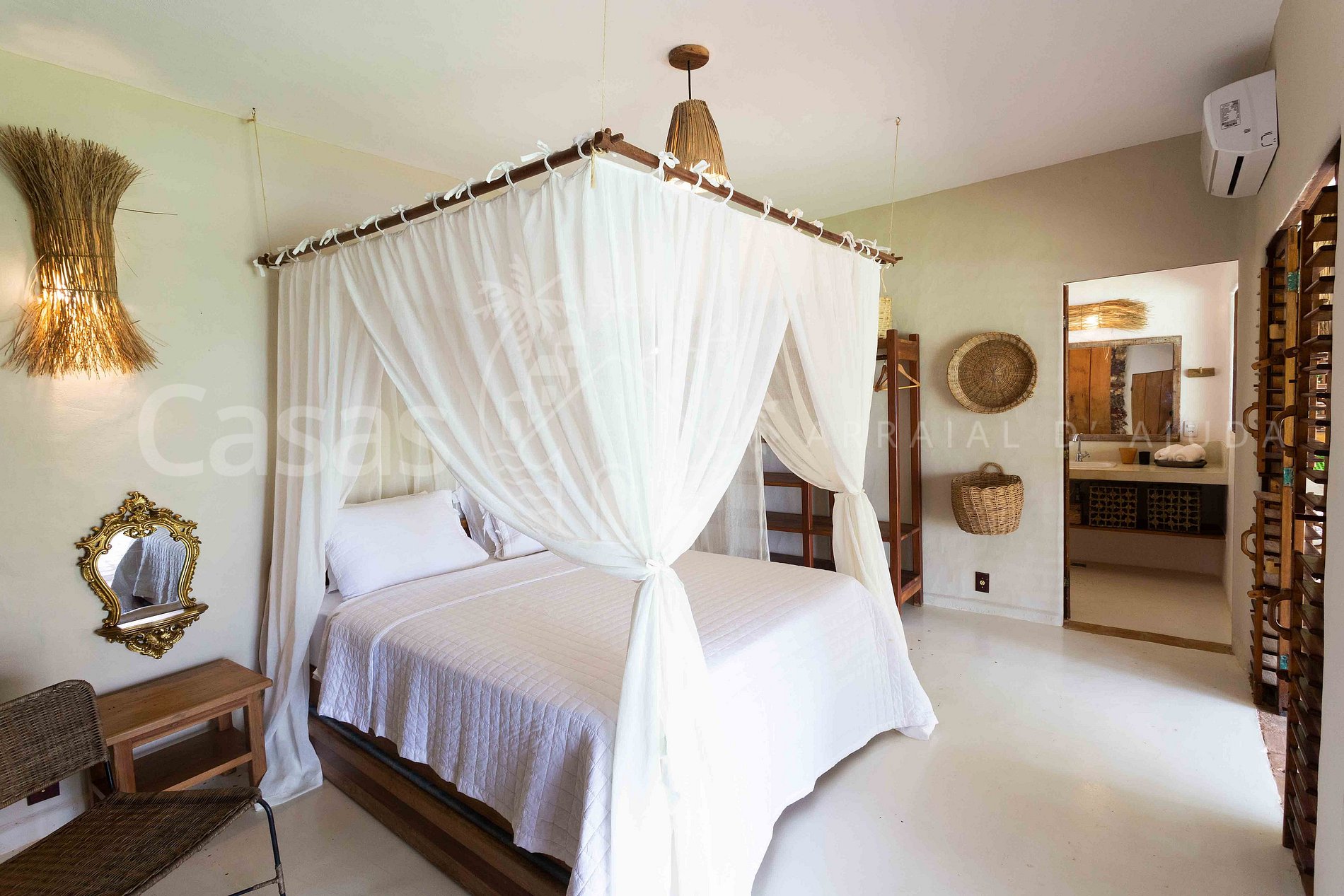 Suíte 1: Piso Superior: - cama queen, ar-condicionado, banheiro, varanda vista mar.