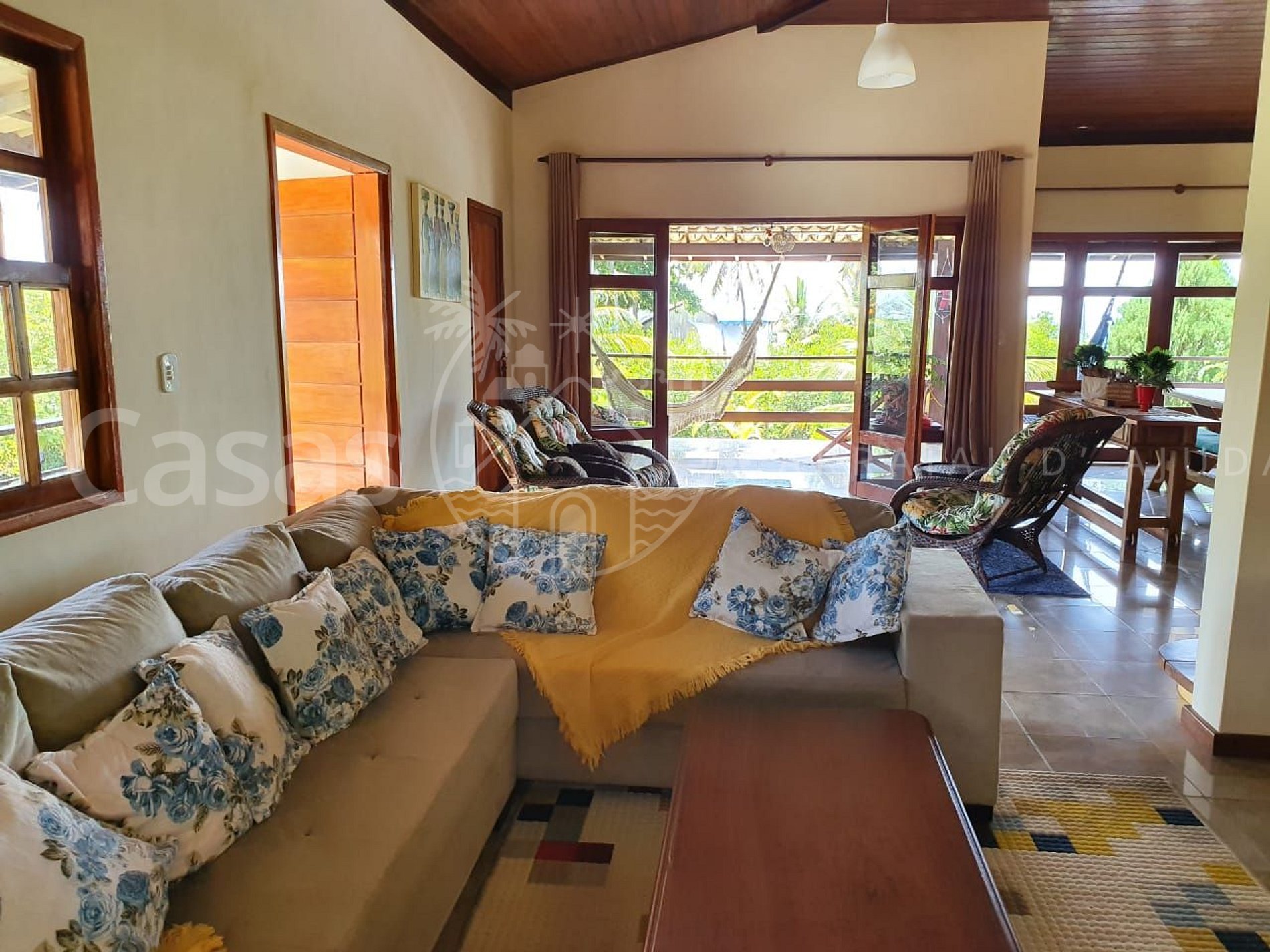 Toda integrada, sala espaçosa, sala de jantar, varanda com redes, possui 5 quartos climatizados, super confortáveis e amplos.