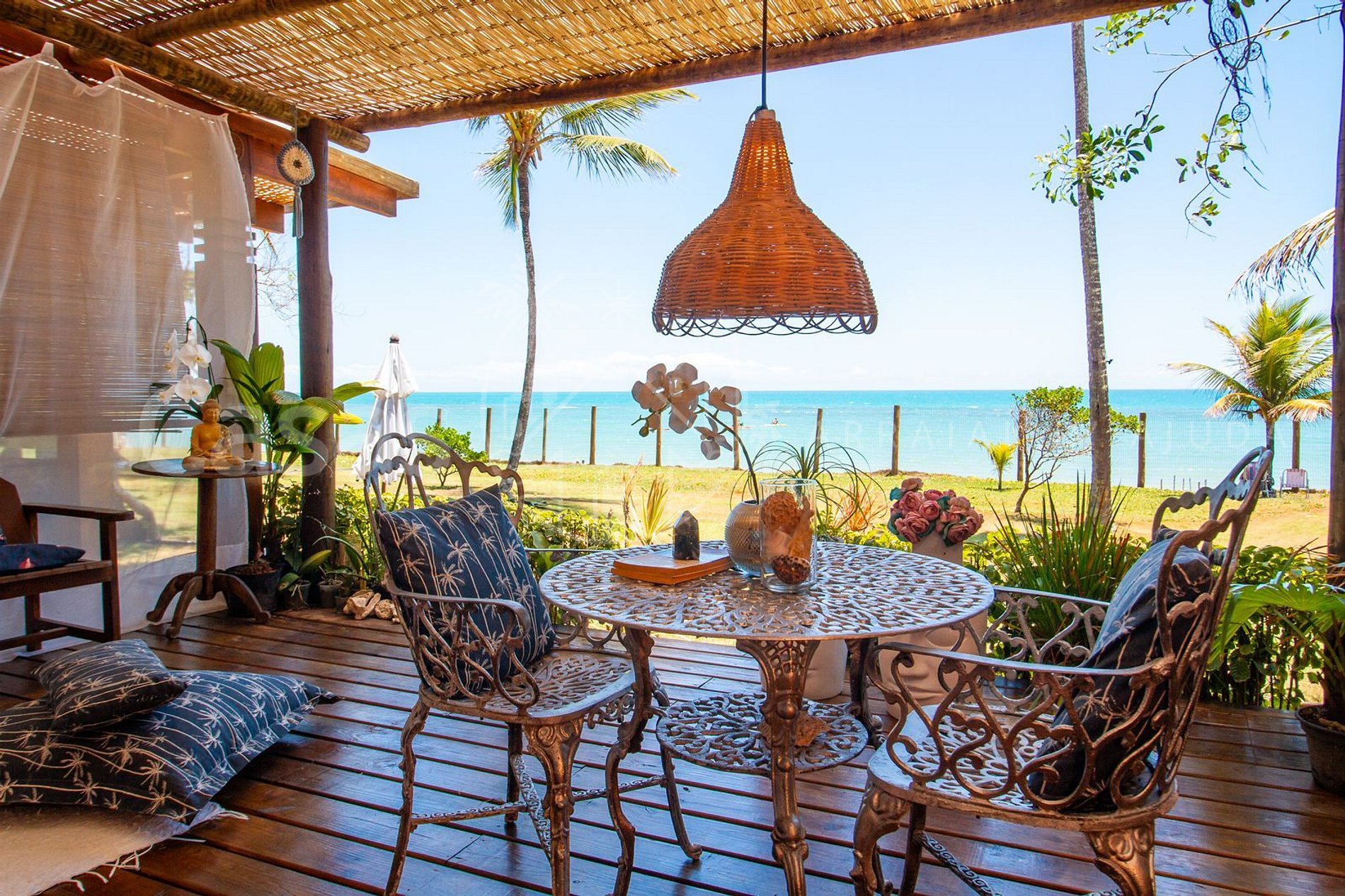Varanda frente mar com espreguiçadeiras e sofá