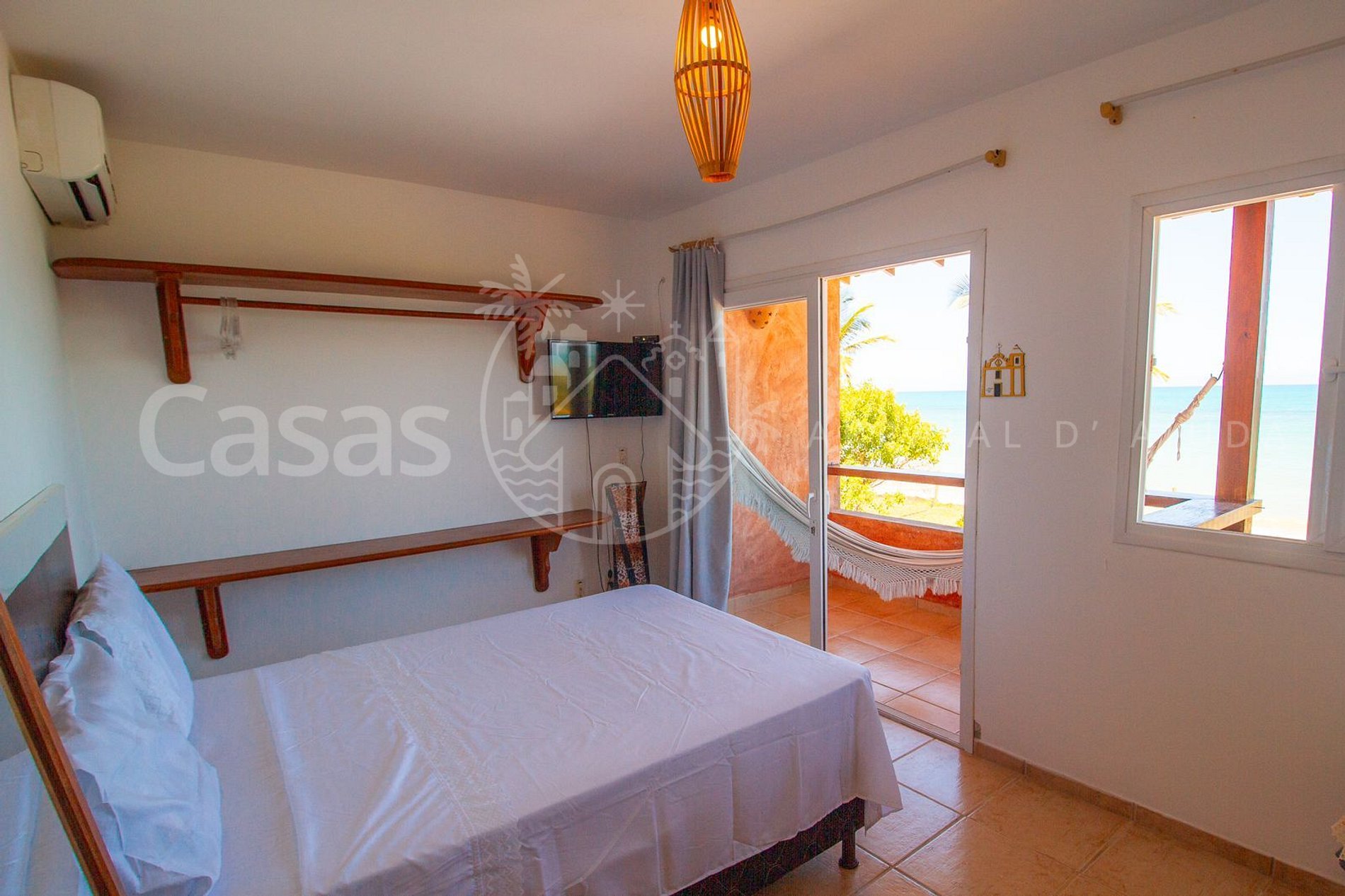 Suíte 1: Suíte casal, cama solteiro, ar-condicionado, banheiro, varanda frente mar