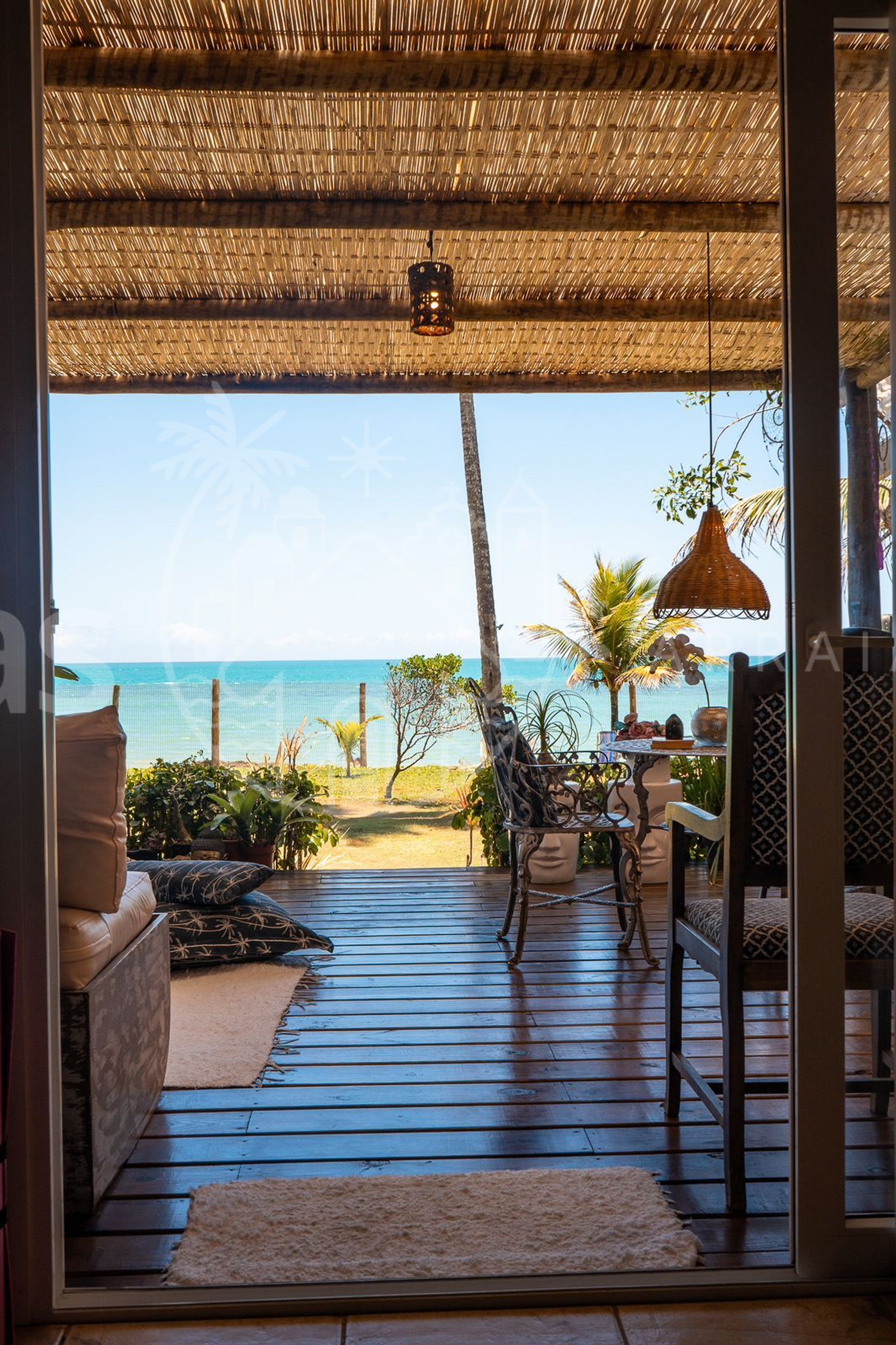 Varanda frente mar com espreguiçadeiras e sofá