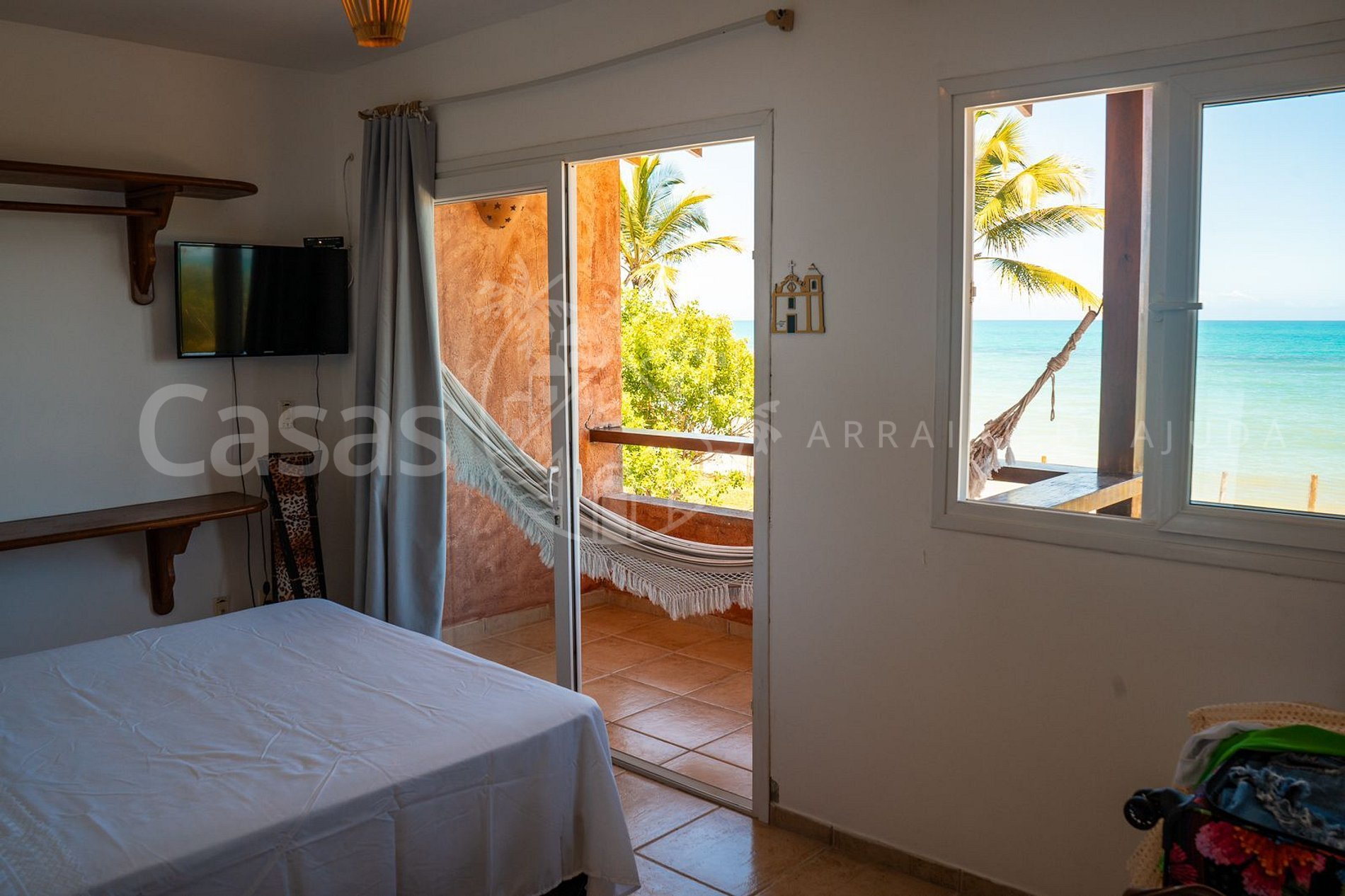 Suíte 1: Suíte casal, cama solteiro, ar-condicionado, banheiro, varanda frente mar