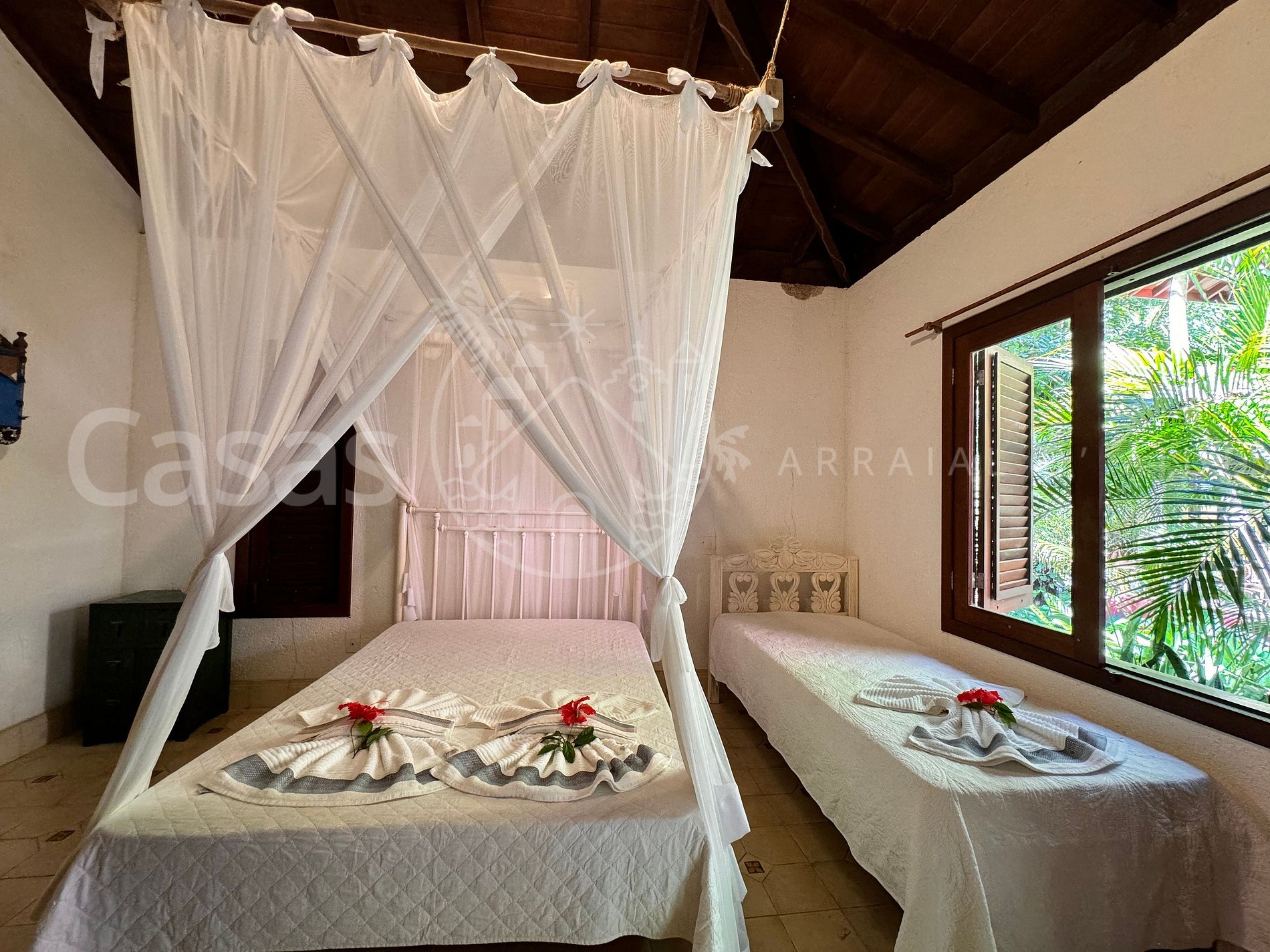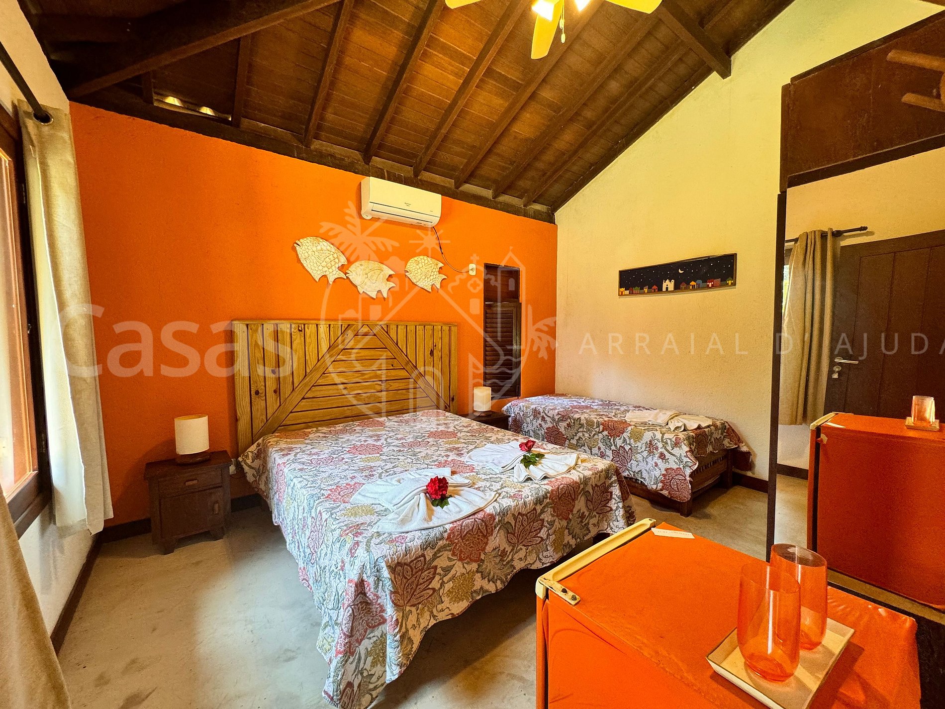Suíte 3 – Piso térreo: 1 cama queen, 1 cama solteiro, ar-condicionado, ventilador, cortina, varanda