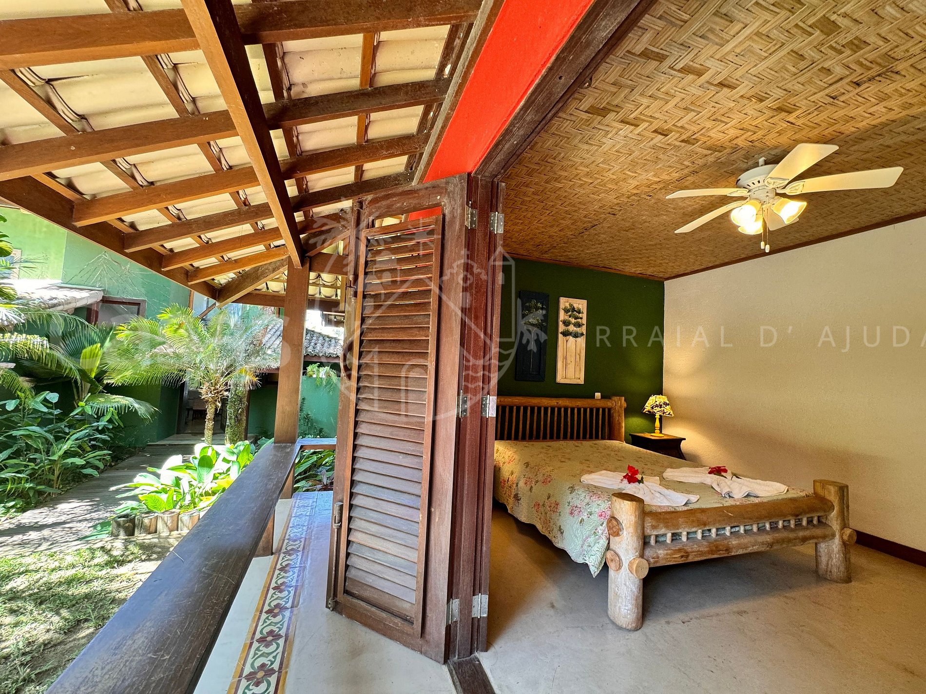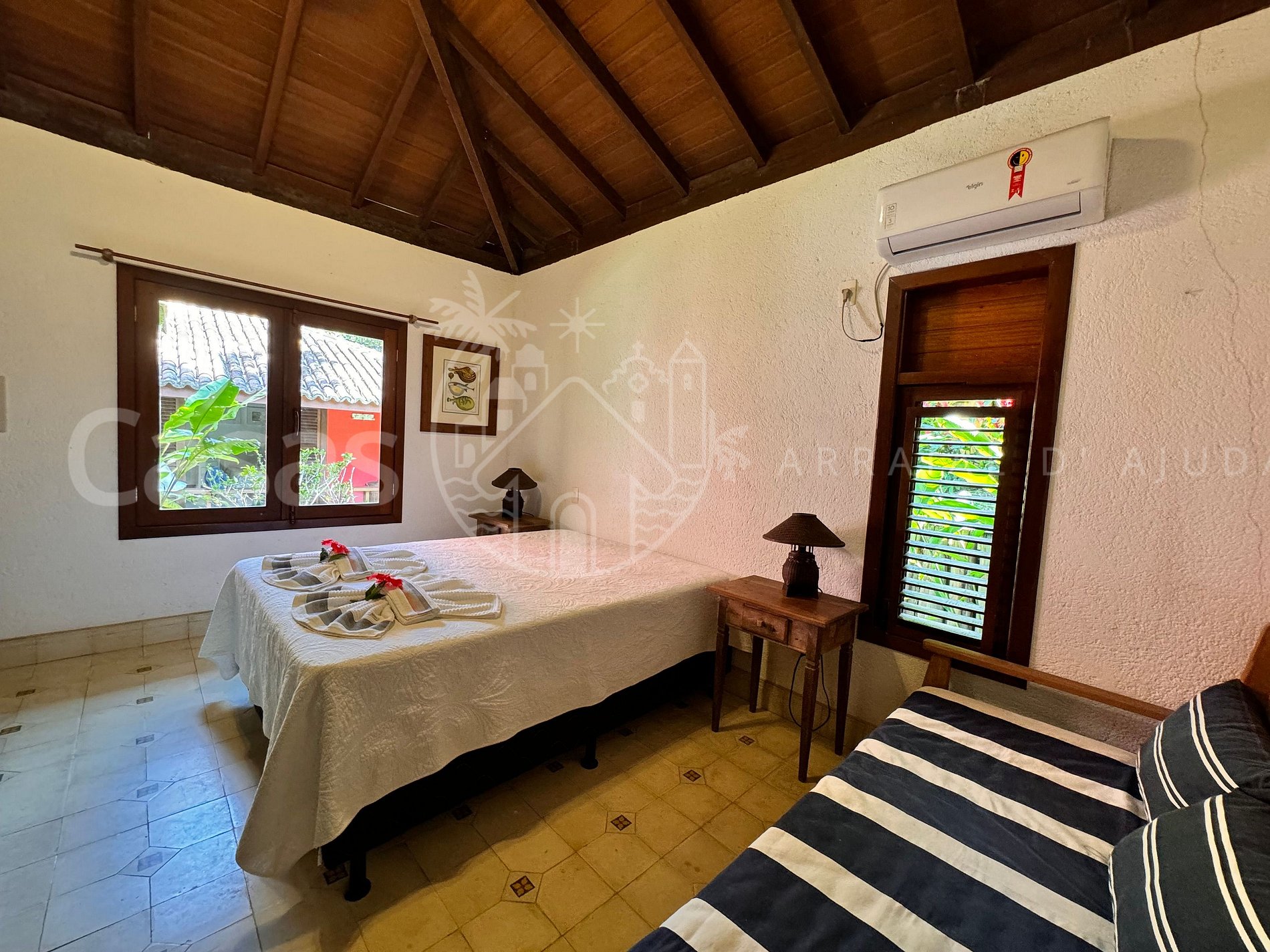 Suíte 1 – Piso térreo: 1 cama queen, ar-condicionado, ventilador, cortina, varanda