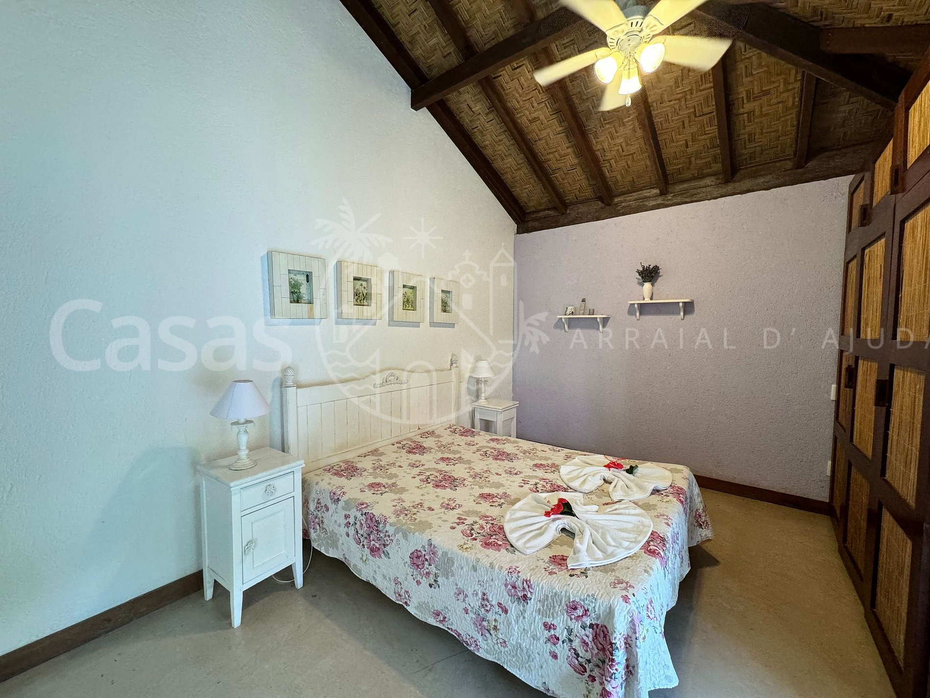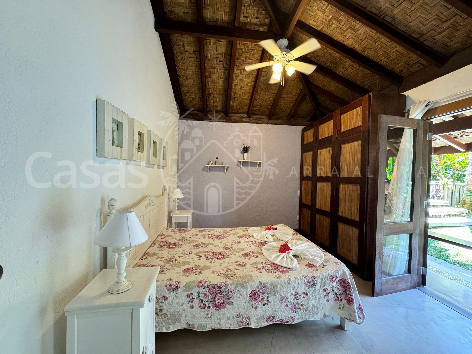 Suíte 2 – Piso térreo: 1 cama queen, ar-condicionado, ventilador, cortina, armário, varanda
