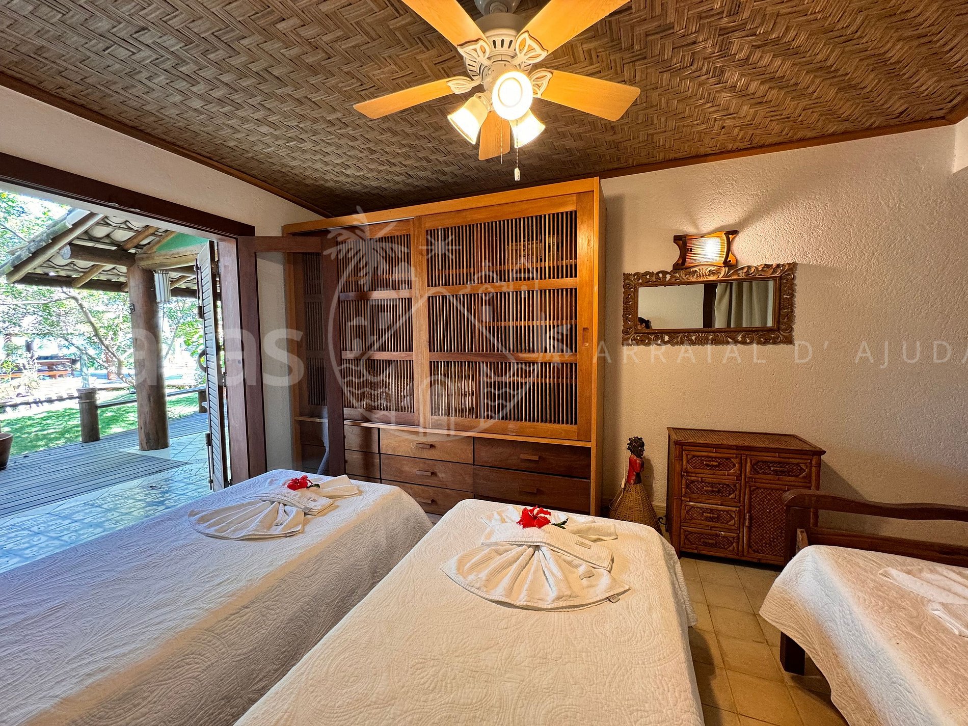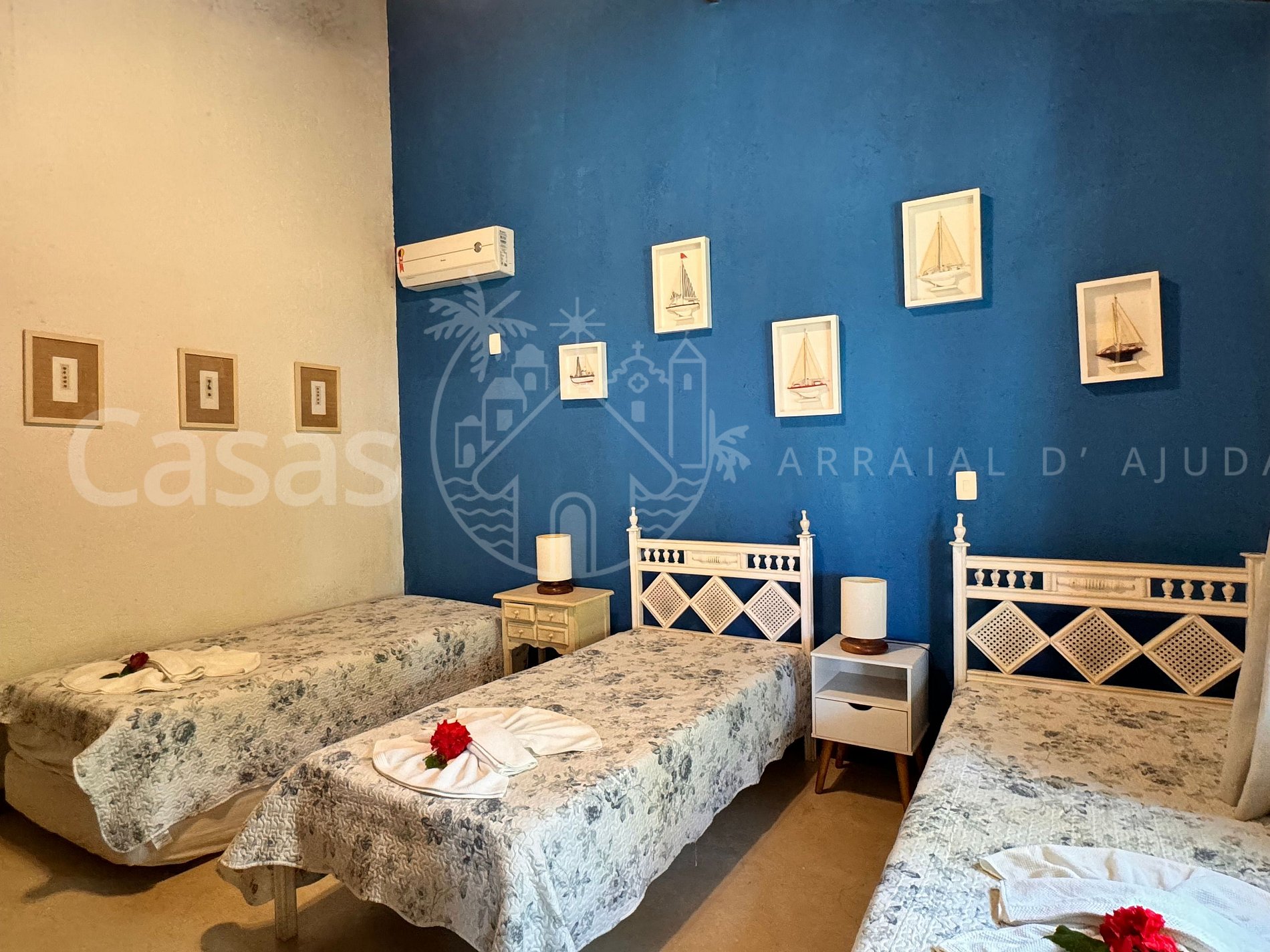 Suíte 3 – Piso térreo: 3 camas solteiro, ar-condicionado, ventilador, armário, varanda
