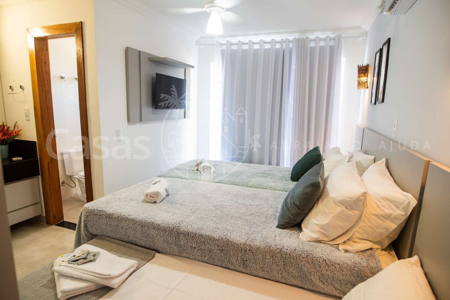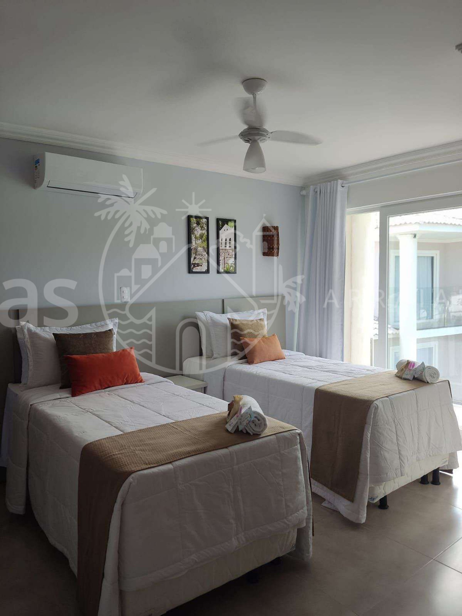Suíte 1 – andar superior, 1 cama super king, 2 camas solteiro, ar-condicionado, ventilador de teto, armário, bancada de trabalho e varanda vista piscina