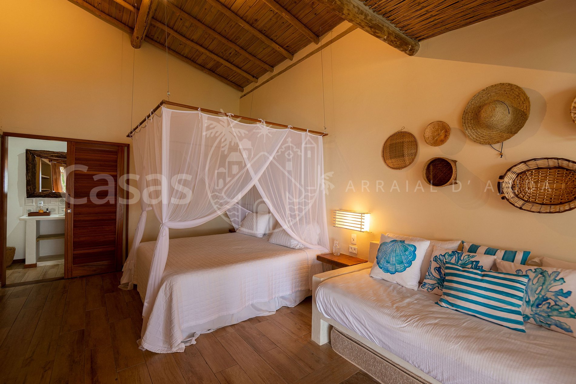 Suíte 1: Suíte cama king vista mar, mini office com vista, ar-condicionado, banheiro.