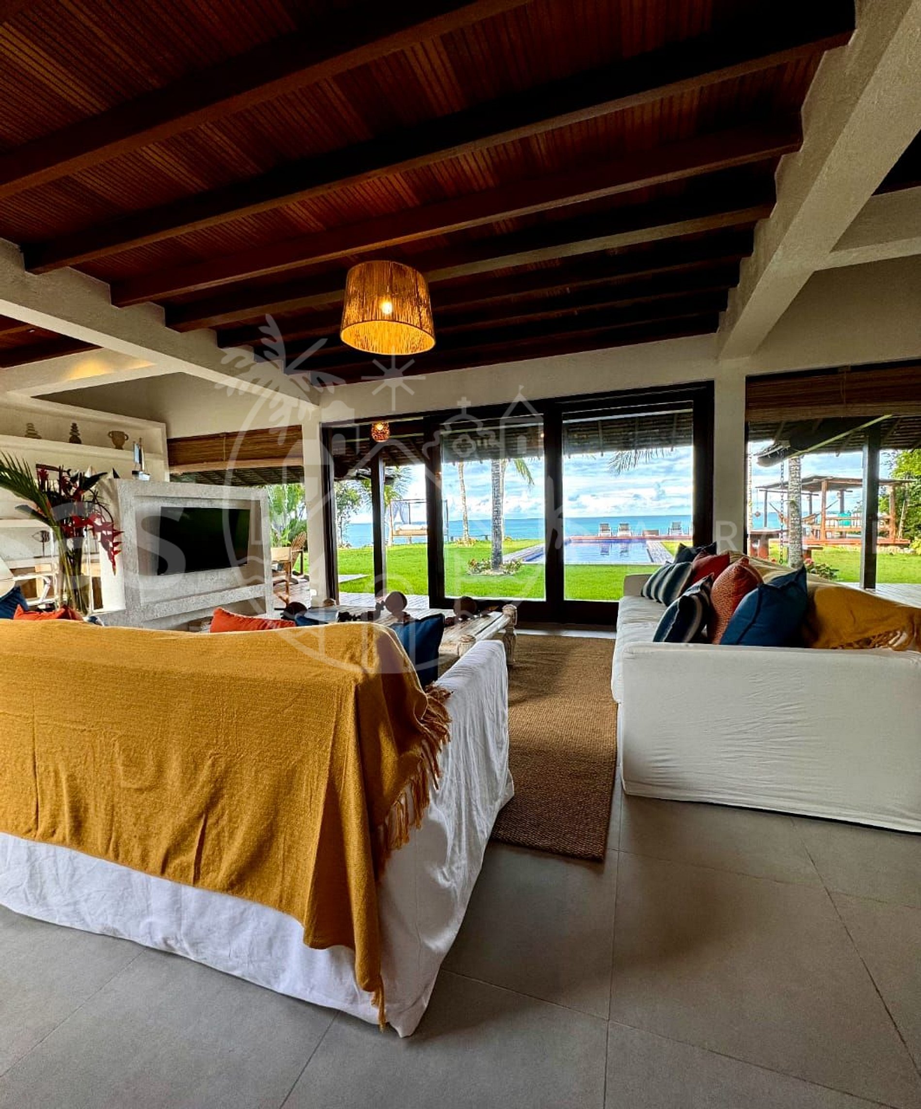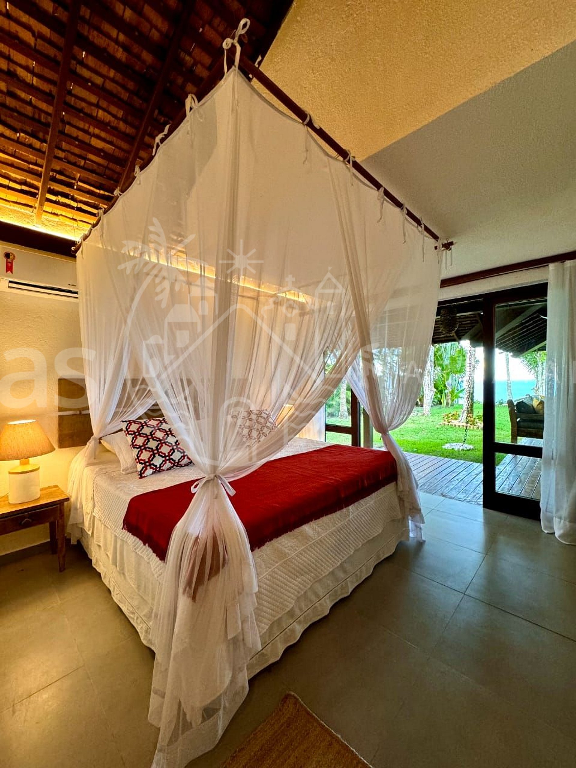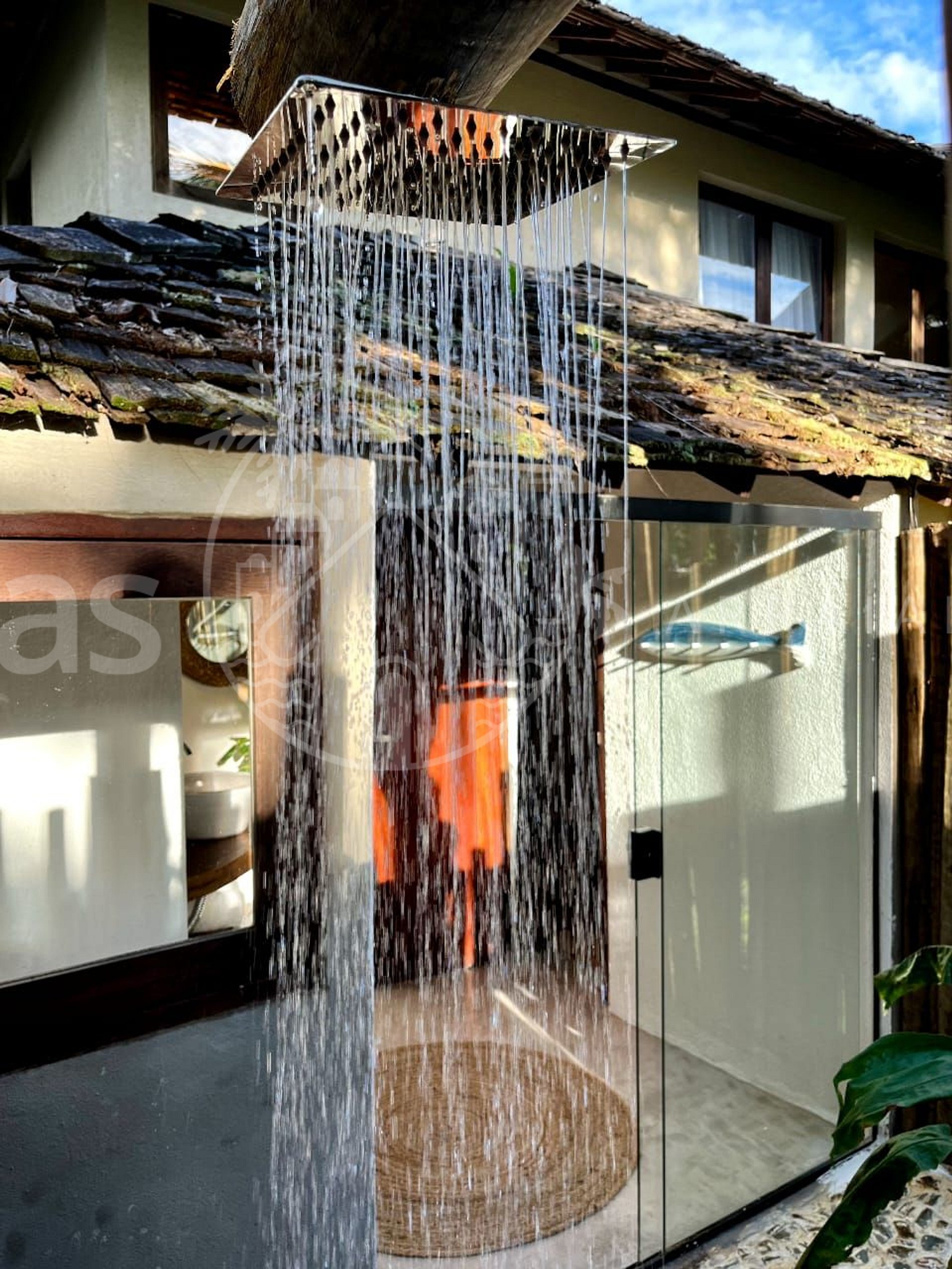 A piscina é um detalhe à parte, com borda infinita e também vista para o mar é um espaço de total privacidade para os hóspedes. A frente da casa é toda avarandada, com mesas, área de churrasqueira e espreguiçadeiras, com total integração entre o jardim e a piscina.