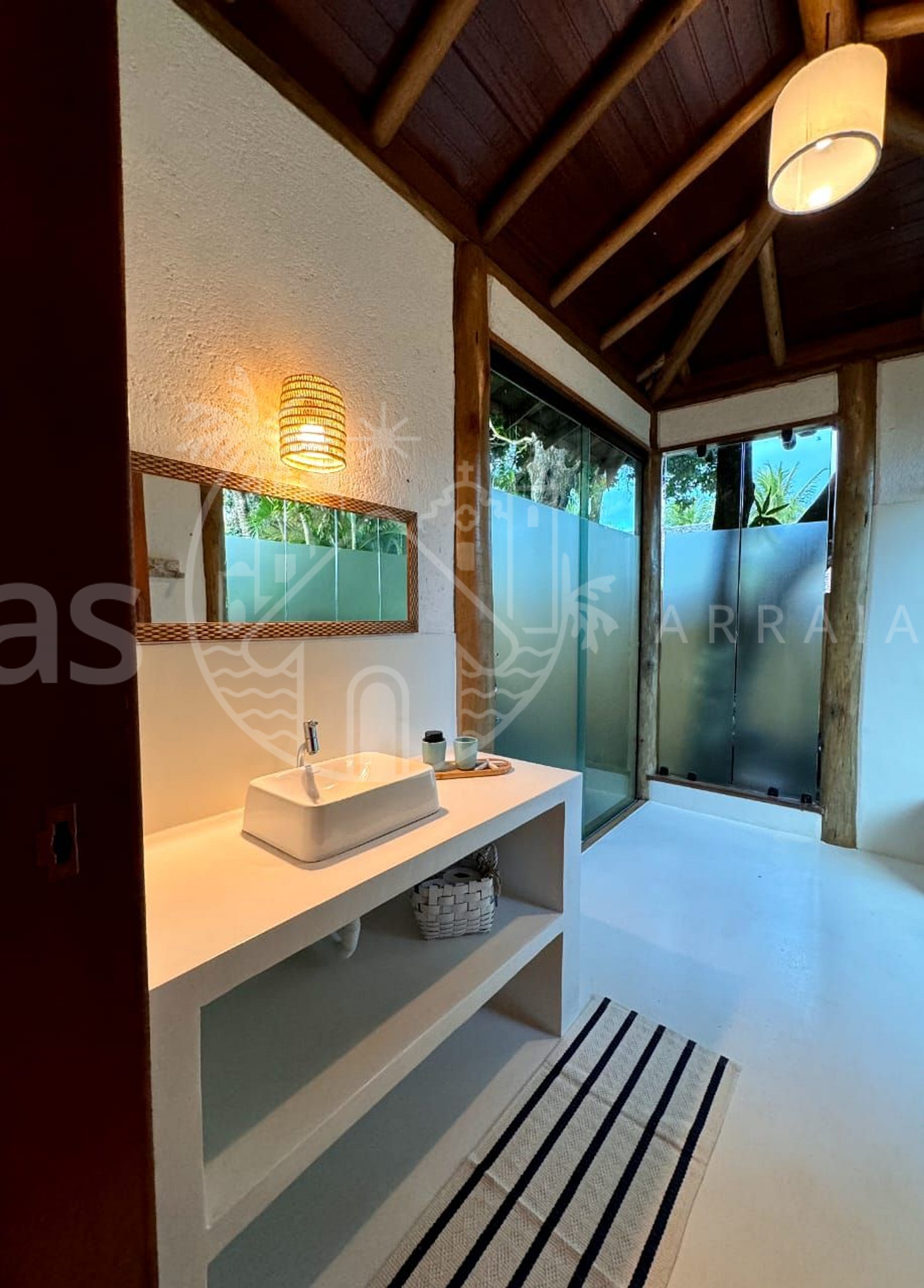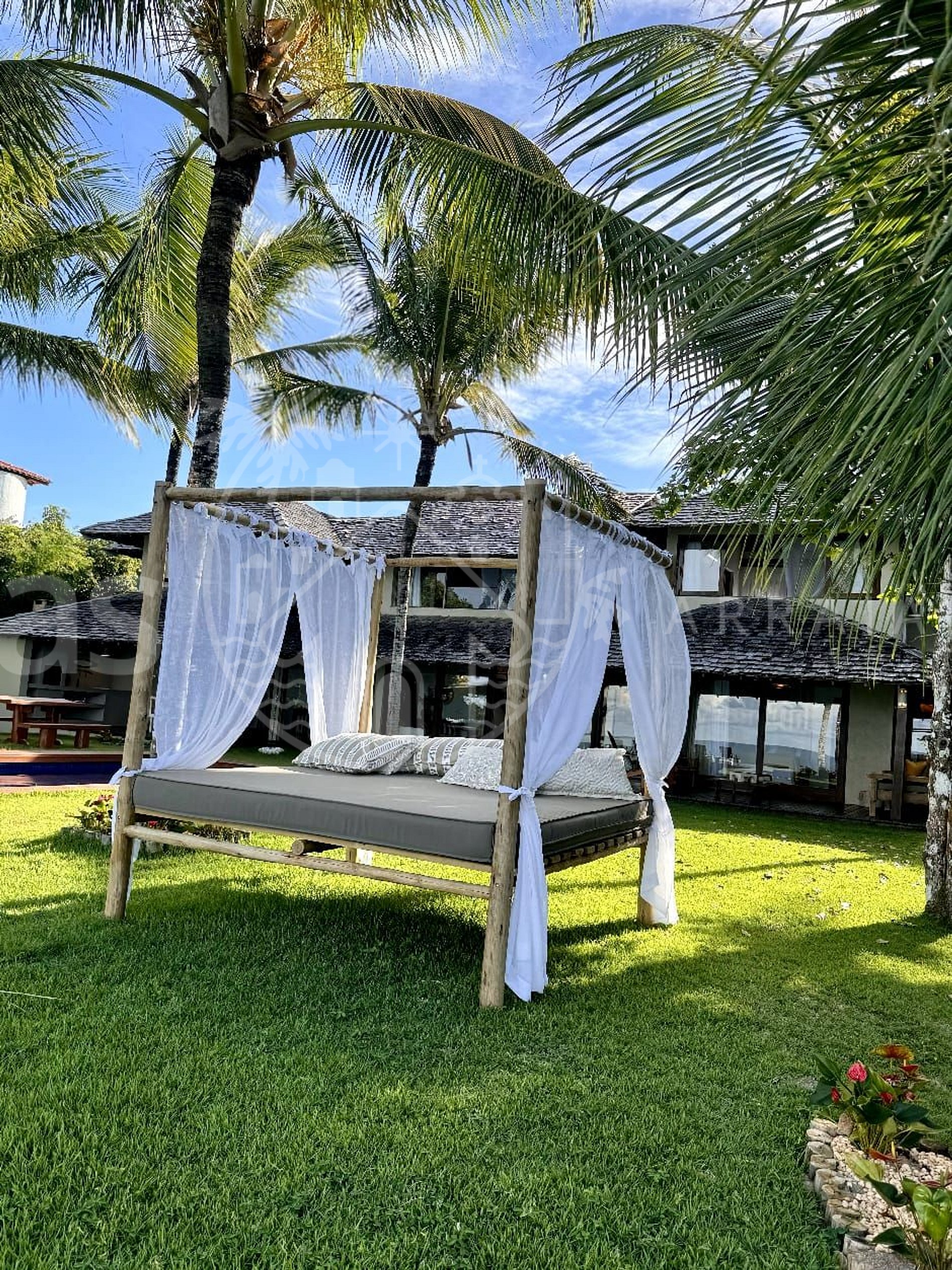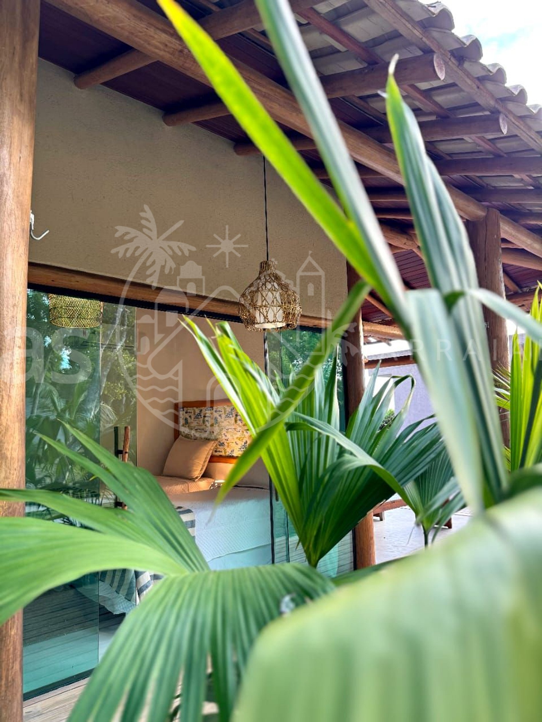 A área externa tem vários espaços de conforto, com bungalow vista mar, deck de madeira com redes e espreguiçadeiras.