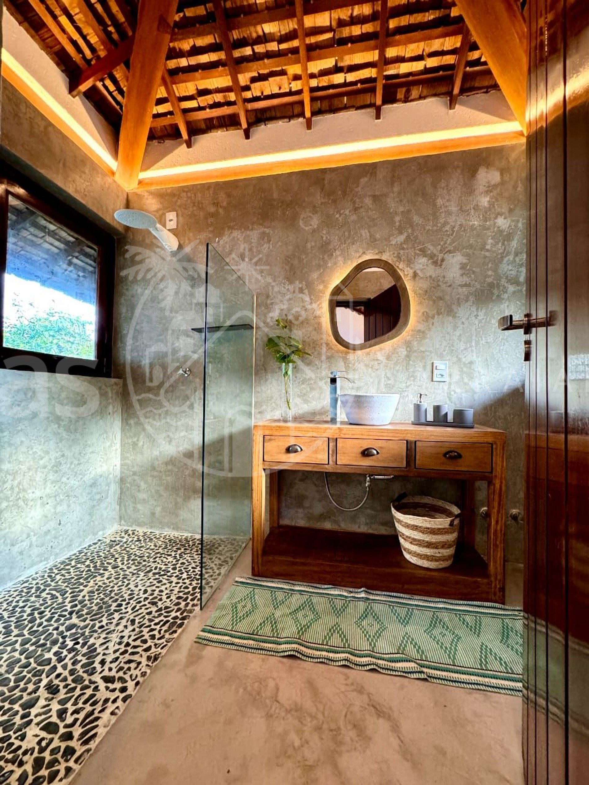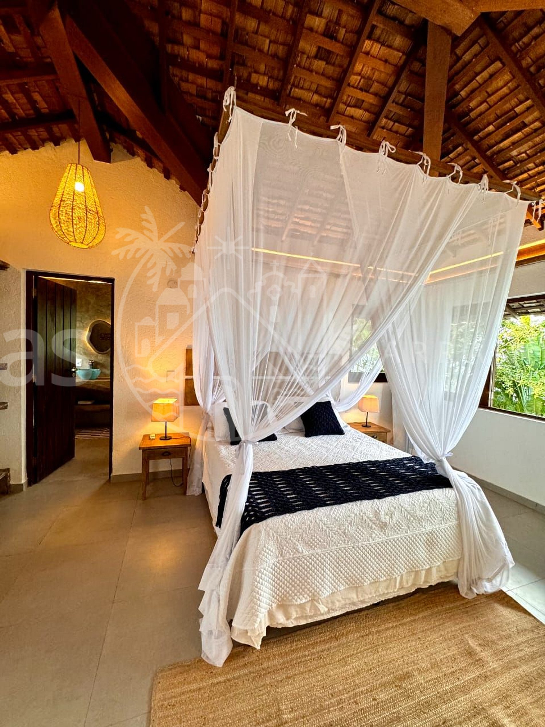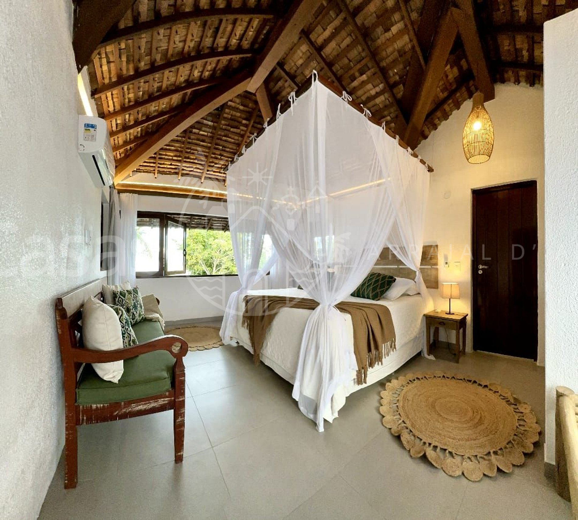 A área externa tem vários espaços de conforto, com bungalow vista mar, deck de madeira com redes e espreguiçadeiras.