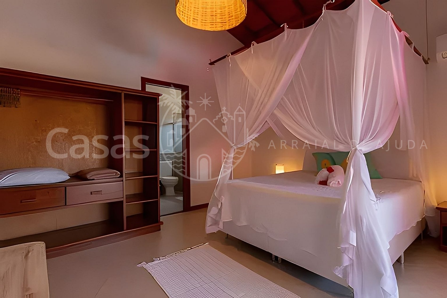 Suíte 1: Cama casal e dossel, ar-condicionado, armário